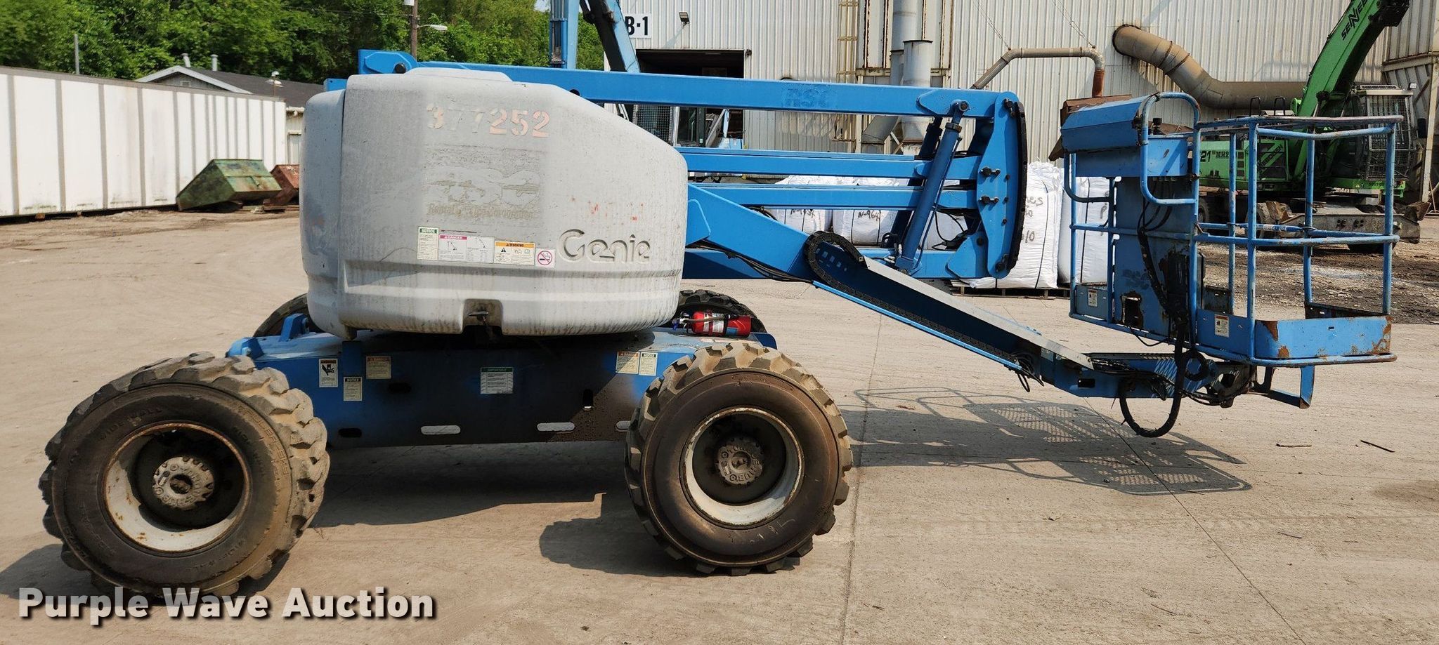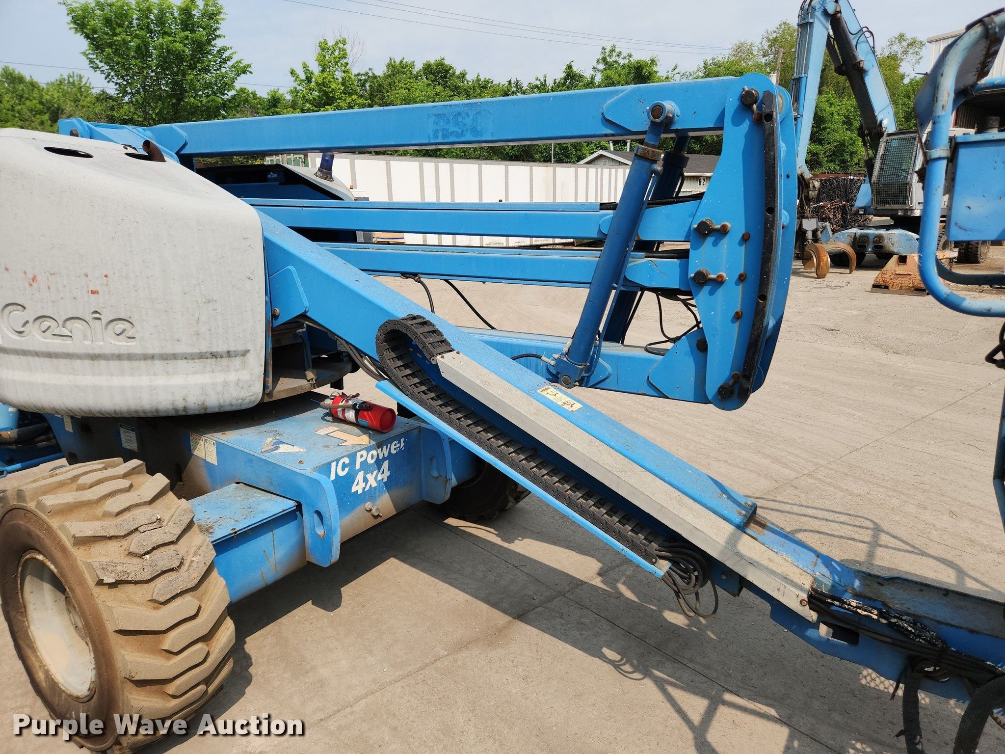 2001 Genie Z45/25 boom lift. Hours: 4,202 on meter, Serial: Z4525-17897. Engine Ford LRG-425 EFI, Cylinders: 4, Fuel type: Dual fuel LP bottle not included. Chassis Four wheel drive. Features Articulating boom, Rough terrain, Maximum lift capacity: 500 lbs, Maximum reach length: 24' 6", Maximum lift height: 45' 8", Hydraulic leveling, Platform: 28" L x 68" W, AC power outlet, Controls: Platform, Ground, Platform rotation: Hydraulic. Tires Tire size: 14-17.5, Solid. Notes Electrical issues. Wieland TOTALL Metal Recycling. Granite City, IL 62040