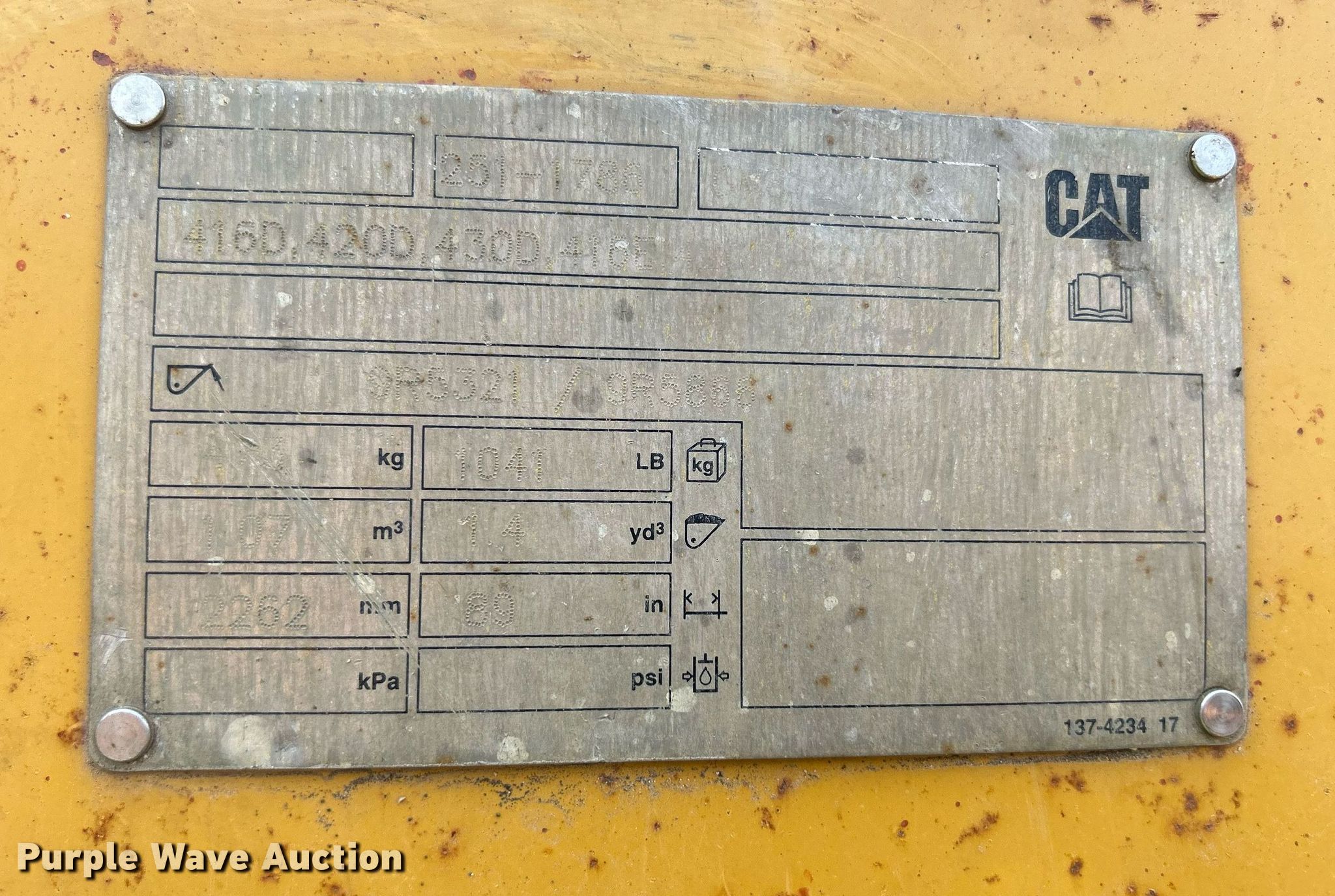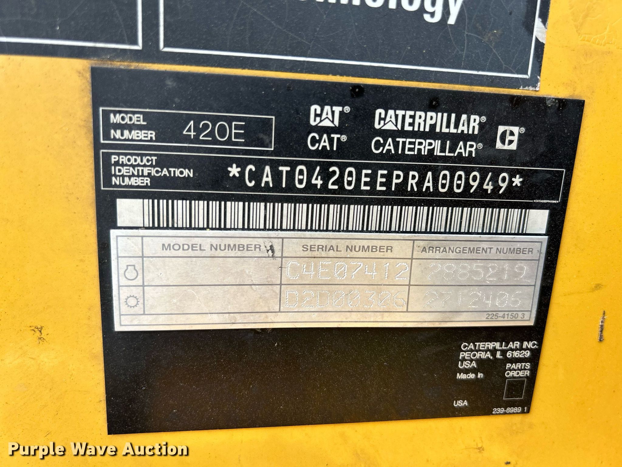 2009 Caterpillar 420E backhoe. Hours: 5,126 on meter, Serial: CAT0420EEPRA00949. Engine Caterpillar C4.4, Displacement: 4.4L, Cylinders: 4, Fuel type: Diesel. Transmission Shuttle shift, 4F - 4R. Chassis Differential lock. Operators station EROPS, Heat, Backhoe controls: Pilot control, Pattern changer. Features Loader Bucket Caterpillar, Bucket leveler, Width: 88", Cutting edge: Bolt-on, Backhoe Extendable stick, Quick coupler: Manual, Auxiliary hydraulics, Bucket Caterpillar, Width: 23", Cutting edge: Weld-on, Teeth: 5.. Tires Front: 12.5/80-18, Rear: 19.5L-24. 2190 250th Street. Washington, IA 52353