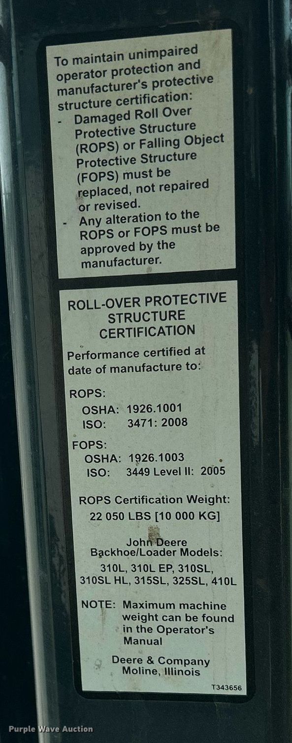 2015 John Deere 310SL backhoe. Hours: 4,164 on meter, Serial: 1T0310SLJFF285984. Engine John Deere, Cylinders: 4, Fuel type: Diesel. Transmission Powershift, 4F - 4R. Chassis Four wheel drive, Differential lock. Operators station EROPS, AC, Heat, Backhoe controls: Pilot control, Pattern changer. Features Loader Quick coupler: Hydraulic, Auxiliary hydraulics, Bucket John Deere AT308970, Bucket leveler, Width: 84", Cutting edge: Bolt-on, Backhoe Extendable stick, Quick coupler: Manual, Auxiliary hydraulics, Bucket Tag, Width: 30", Cutting edge: Bolt-on, Bucket Width: 23", Teeth: 5.. Tires Front: 12.5/80-18, Rear: 19.5L-24. Bruening Rock Products Inc.. 900 Montgomery St. Decorah, IA 52101