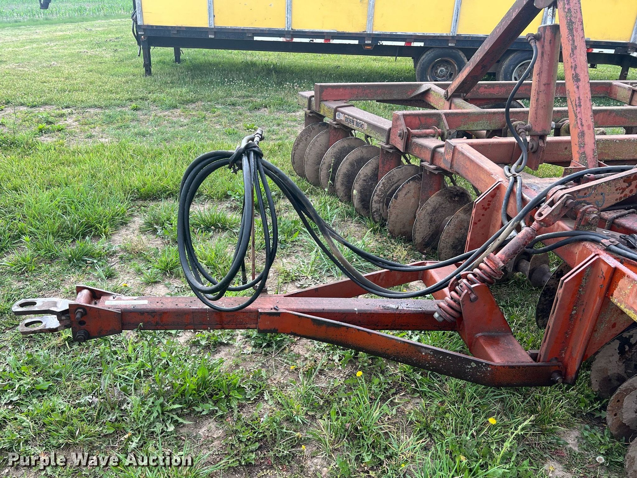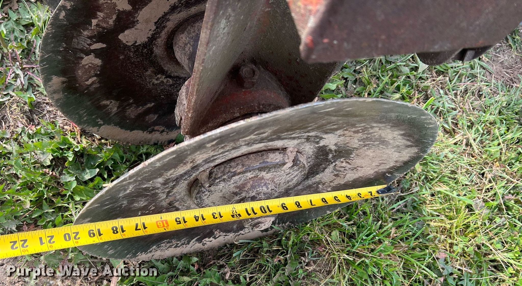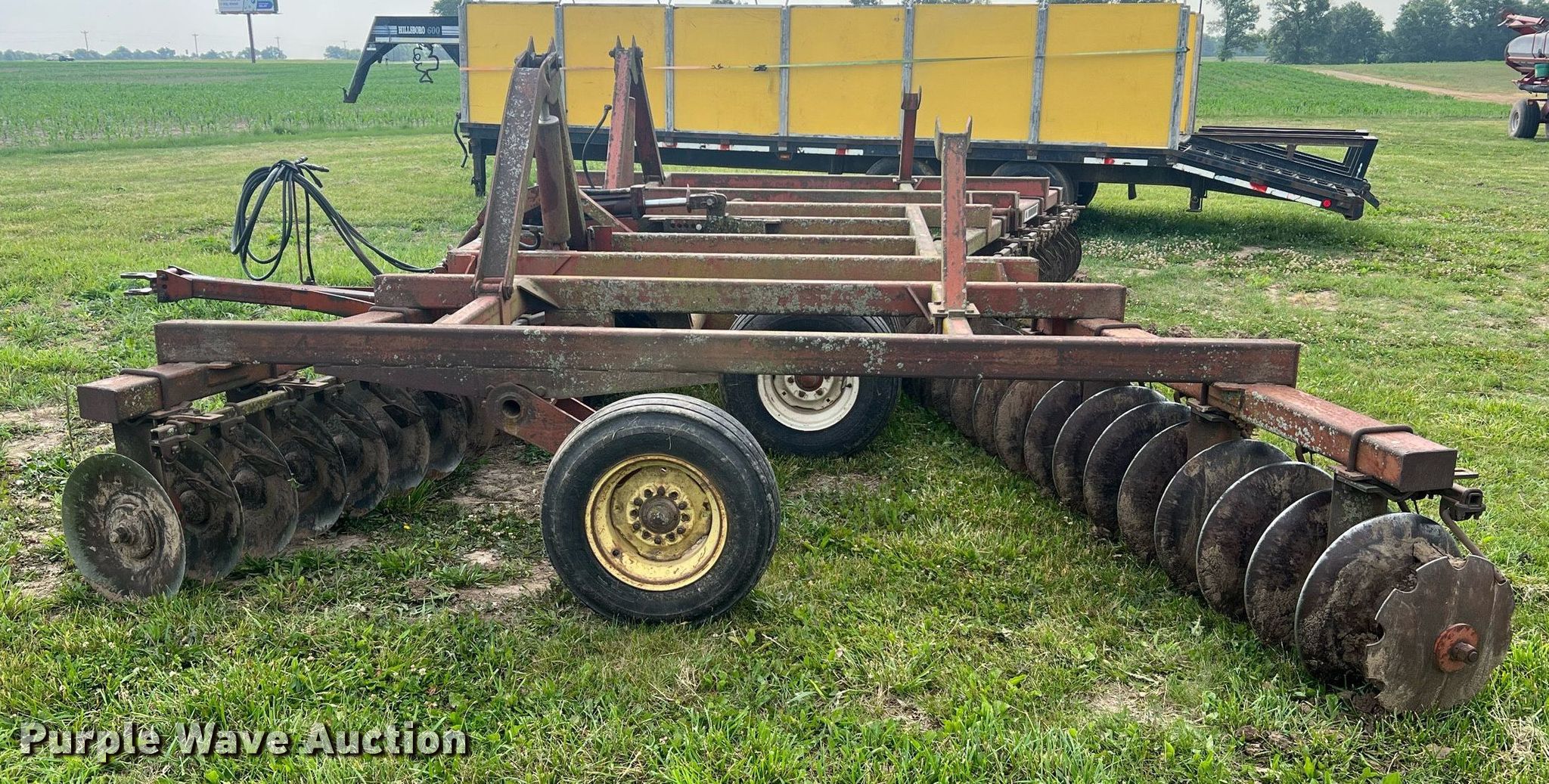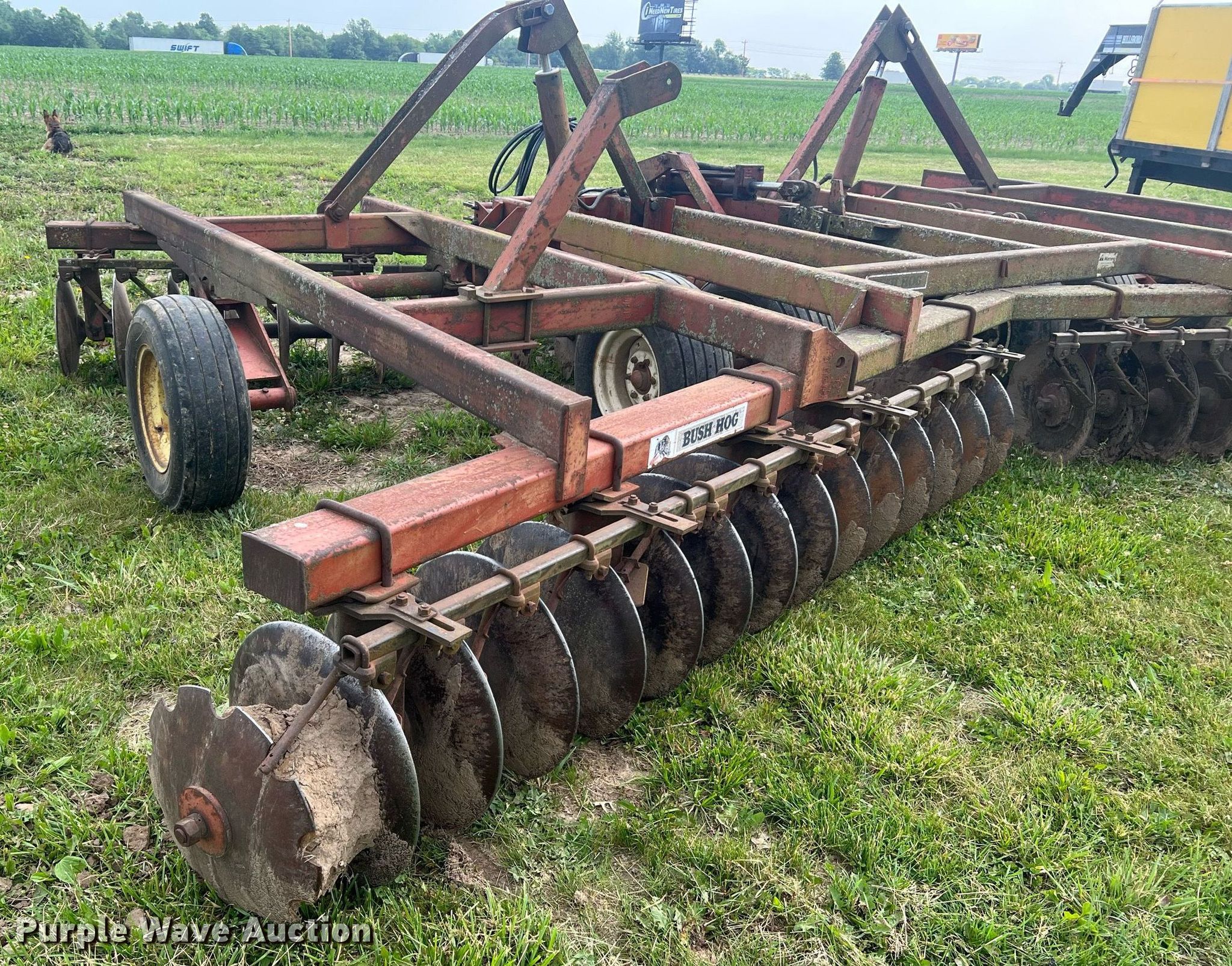 Bush Hog tandem disk. Overall width: 22'. Features Front blades Diameter: 20", Spacing: 9", Rear blades Diameter: 20", Spacing: 9", Disk scrapers, Operation Hydraulic lift, Hydraulic fold. Tires Tire size: 9.5L-15. Notes Hydraulic hose damage. Don Hanson Retirement Auction. 3310 State Road Hh. Kingdom City, MO 65262