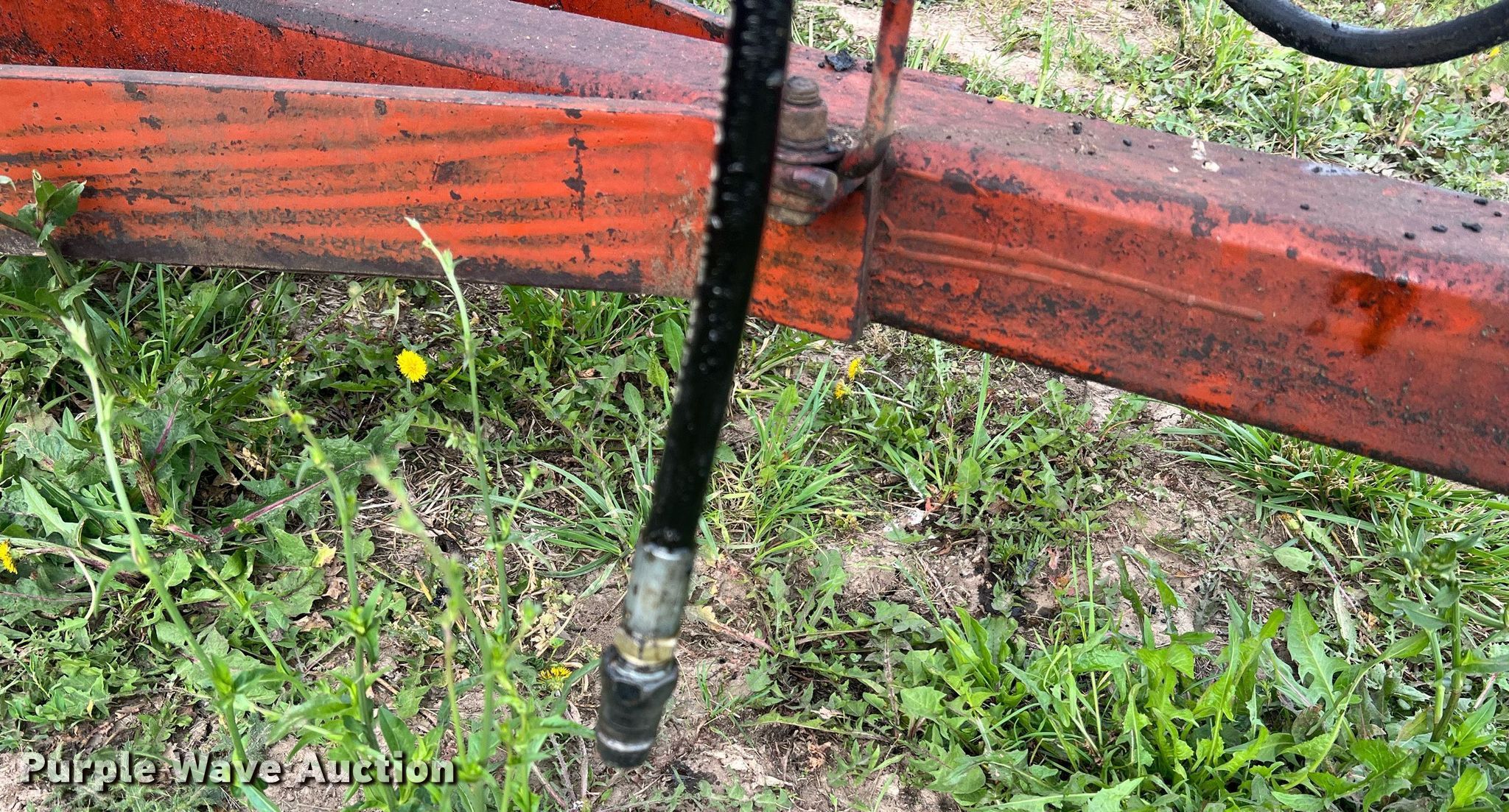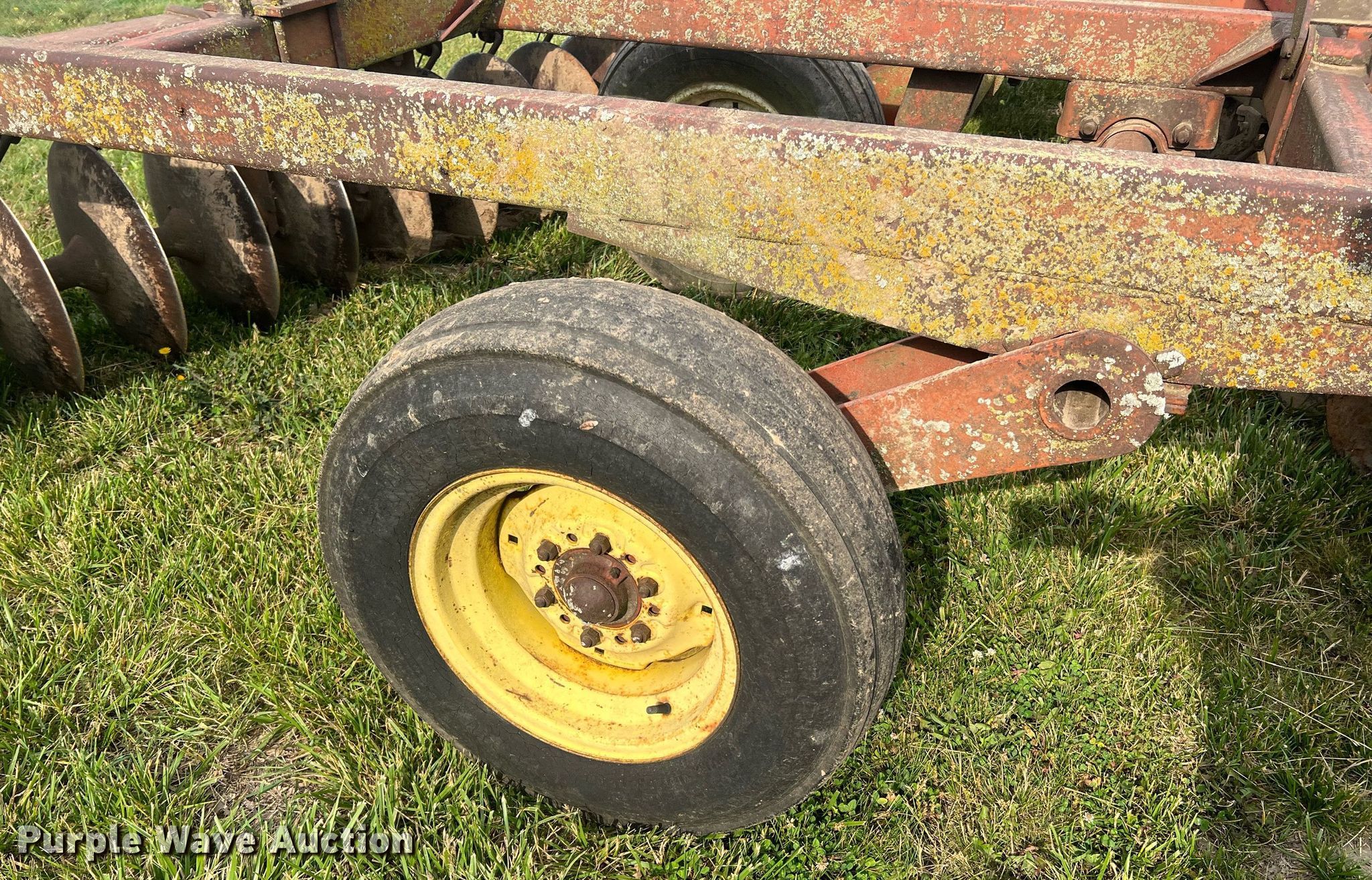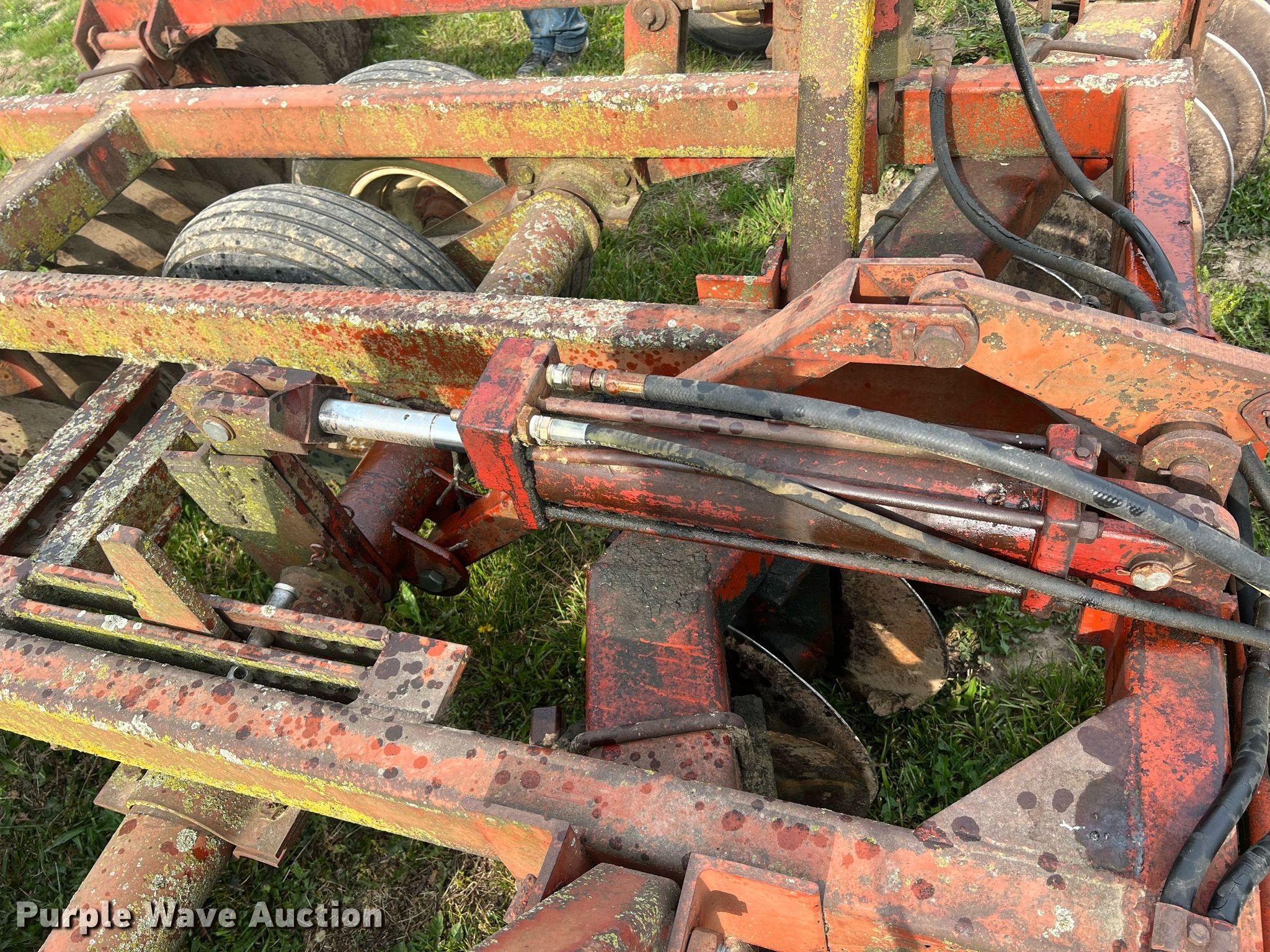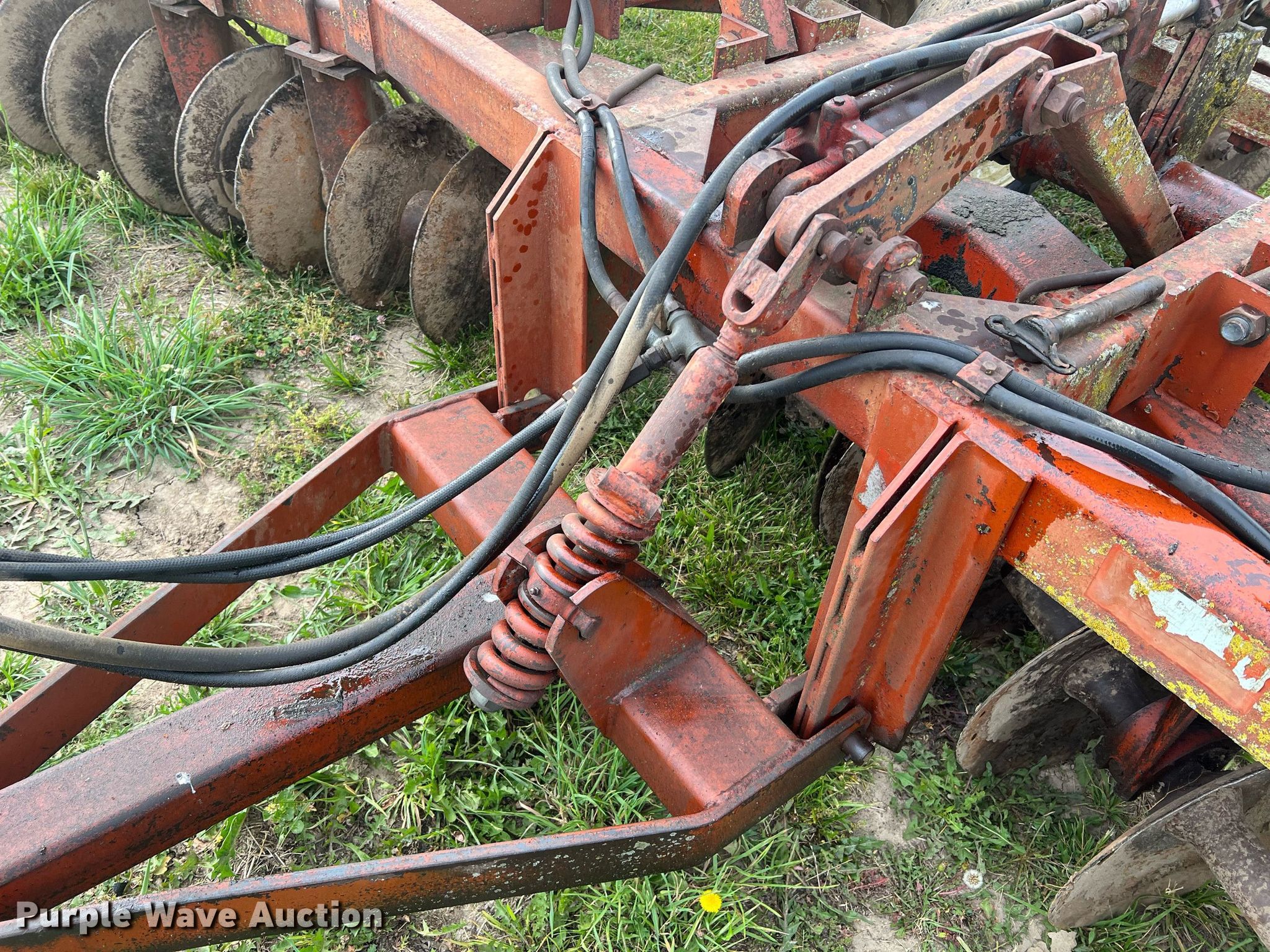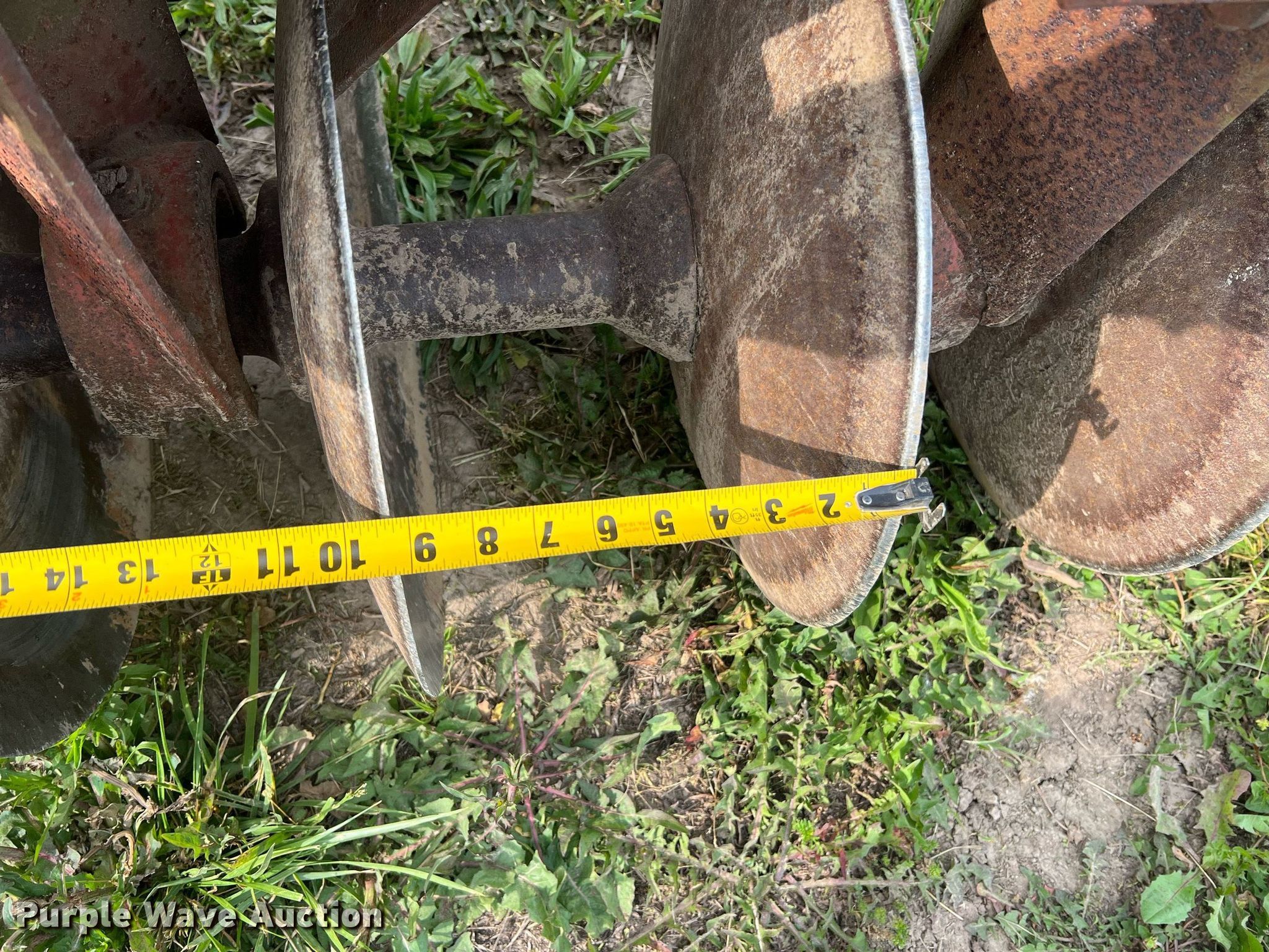 Bush Hog tandem disk. Overall width: 22'. Features Front blades Diameter: 20", Spacing: 9", Rear blades Diameter: 20", Spacing: 9", Disk scrapers, Operation Hydraulic lift, Hydraulic fold. Tires Tire size: 9.5L-15. Notes Hydraulic hose damage. Don Hanson Retirement Auction. 3310 State Road Hh. Kingdom City, MO 65262