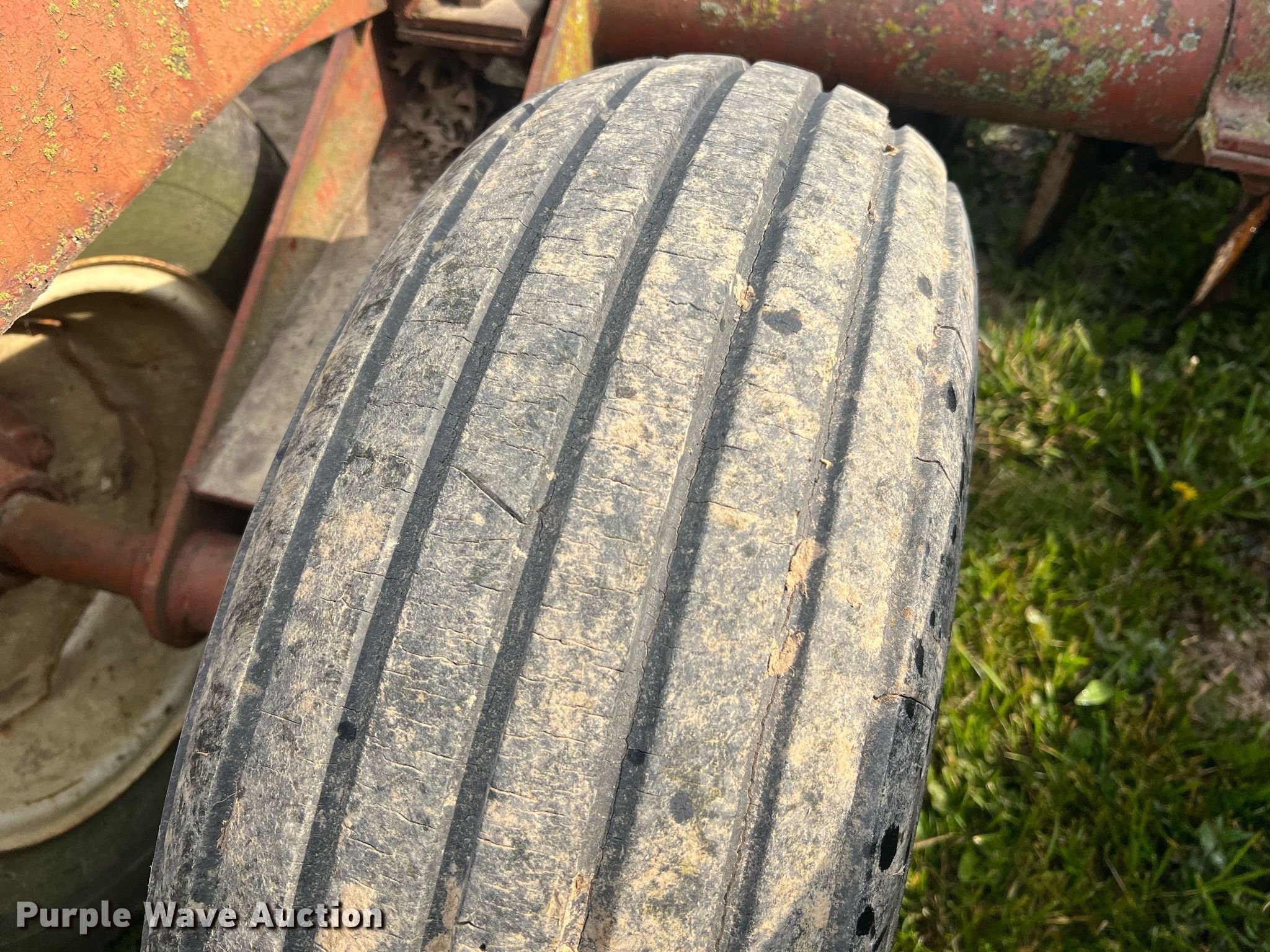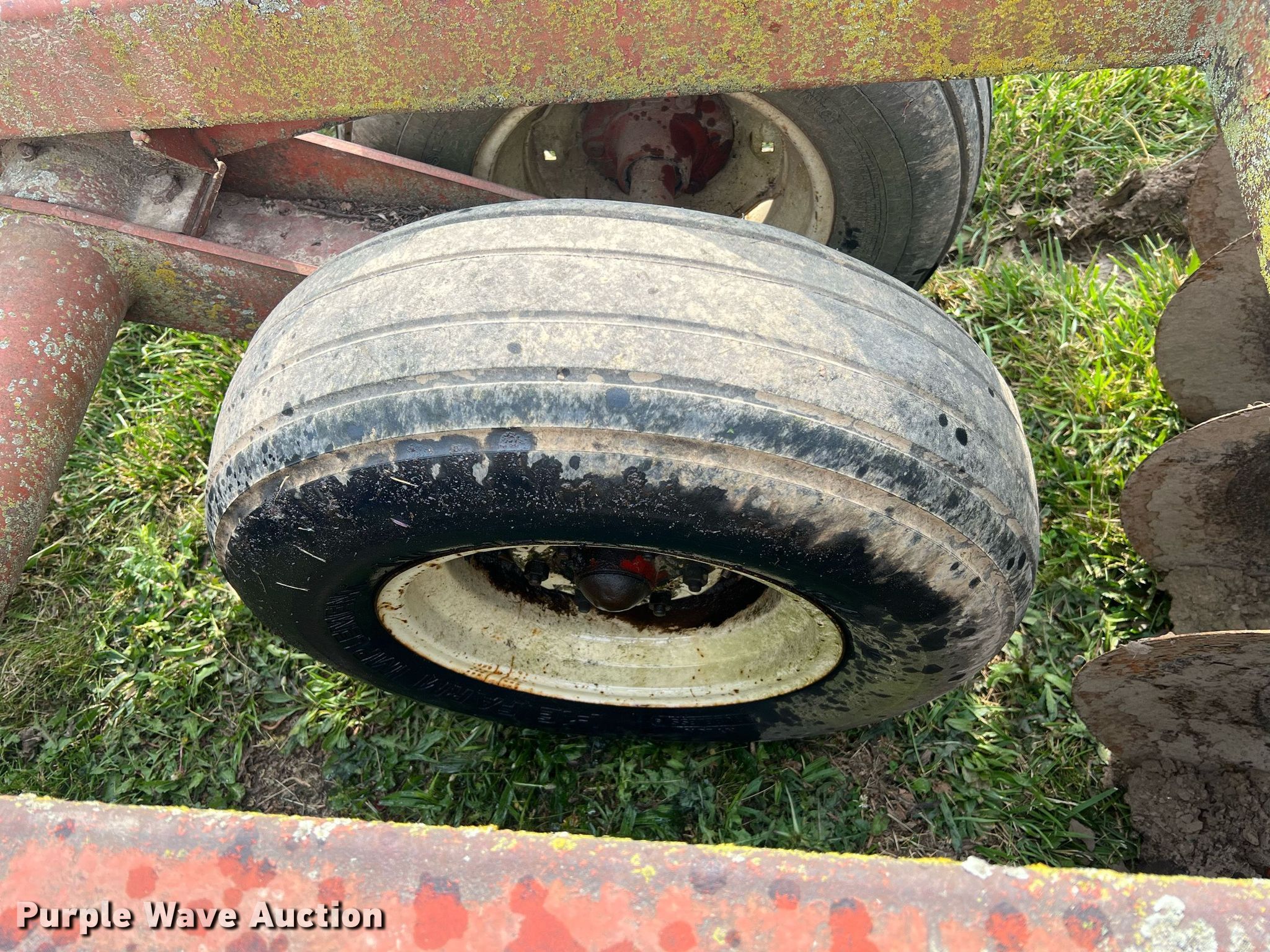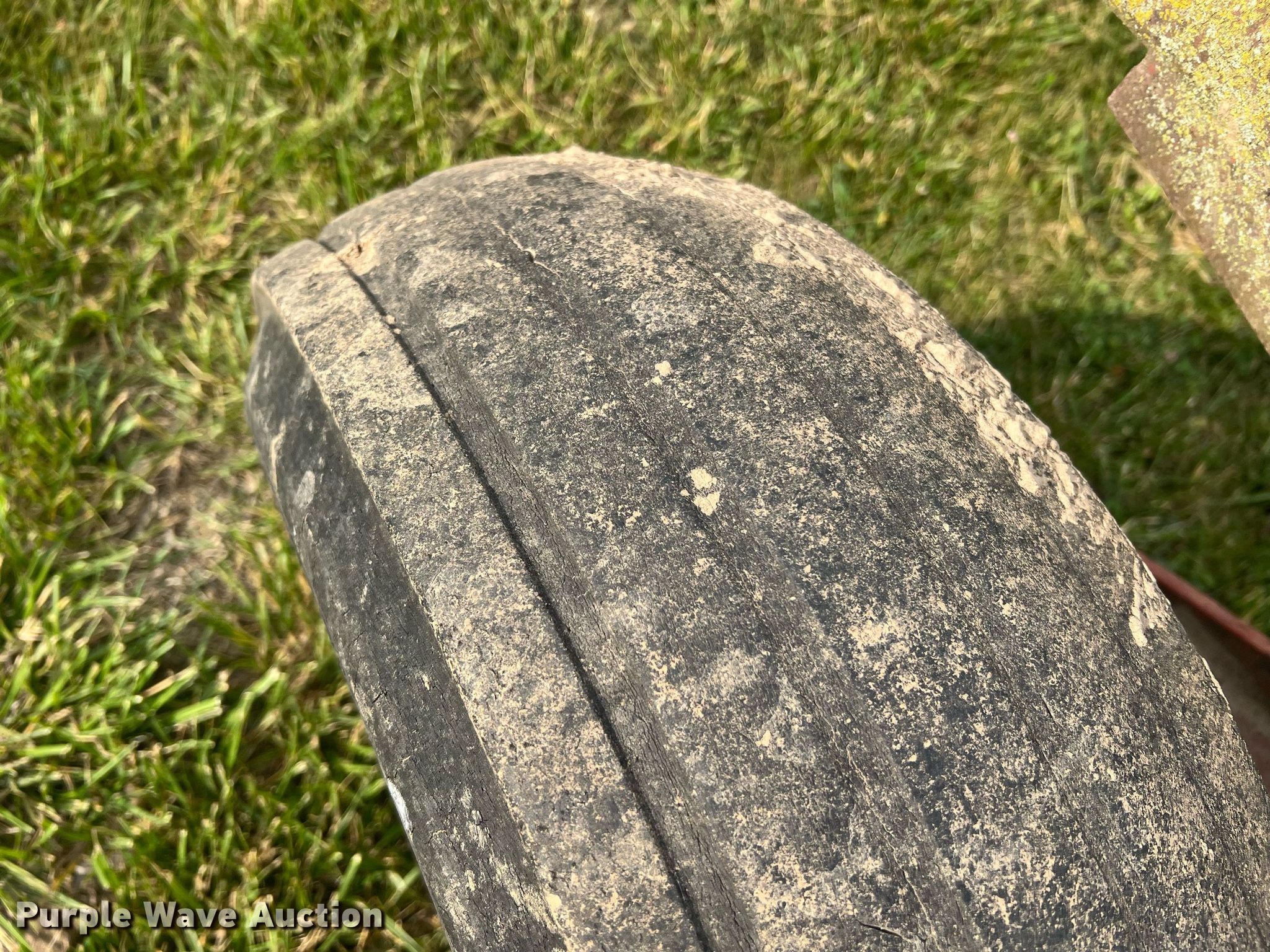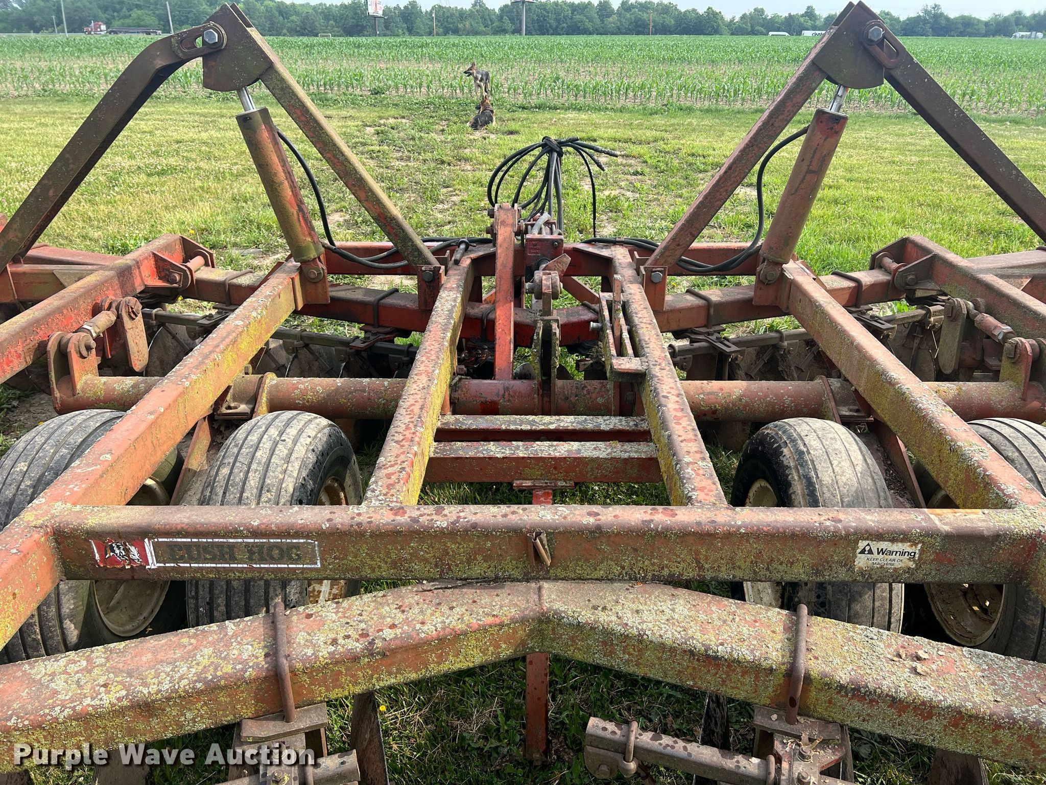 Bush Hog tandem disk. Overall width: 22'. Features Front blades Diameter: 20", Spacing: 9", Rear blades Diameter: 20", Spacing: 9", Disk scrapers, Operation Hydraulic lift, Hydraulic fold. Tires Tire size: 9.5L-15. Notes Hydraulic hose damage. Don Hanson Retirement Auction. 3310 State Road Hh. Kingdom City, MO 65262
