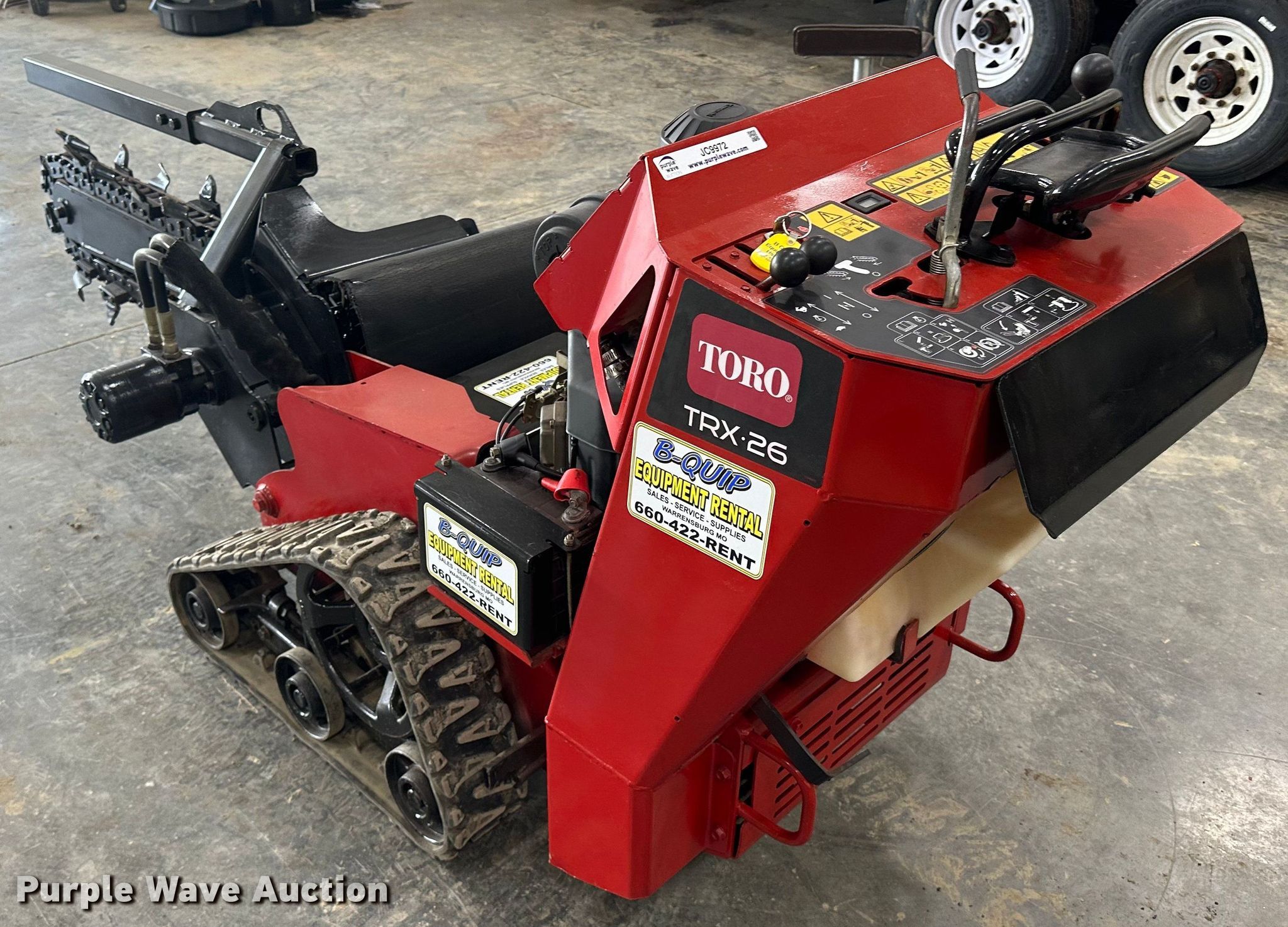 Toro TRX-26 trencher. Hours: 8 on meter, Serial: 314000116. Engine Kawasaki FX730, Cylinders: 2, Fuel type: Gas. Transmission Hydrostatic. Features Trencher Estimated dig depth: 36", Cutting width: 6", Teeth: Dirt. Tracks Width: 6", Rubber. Notes Hour meter replaced at approx. 841 hours. B-Quip Equipment Rental. 82 NW 151 Road. Warrensburg, MO 64093