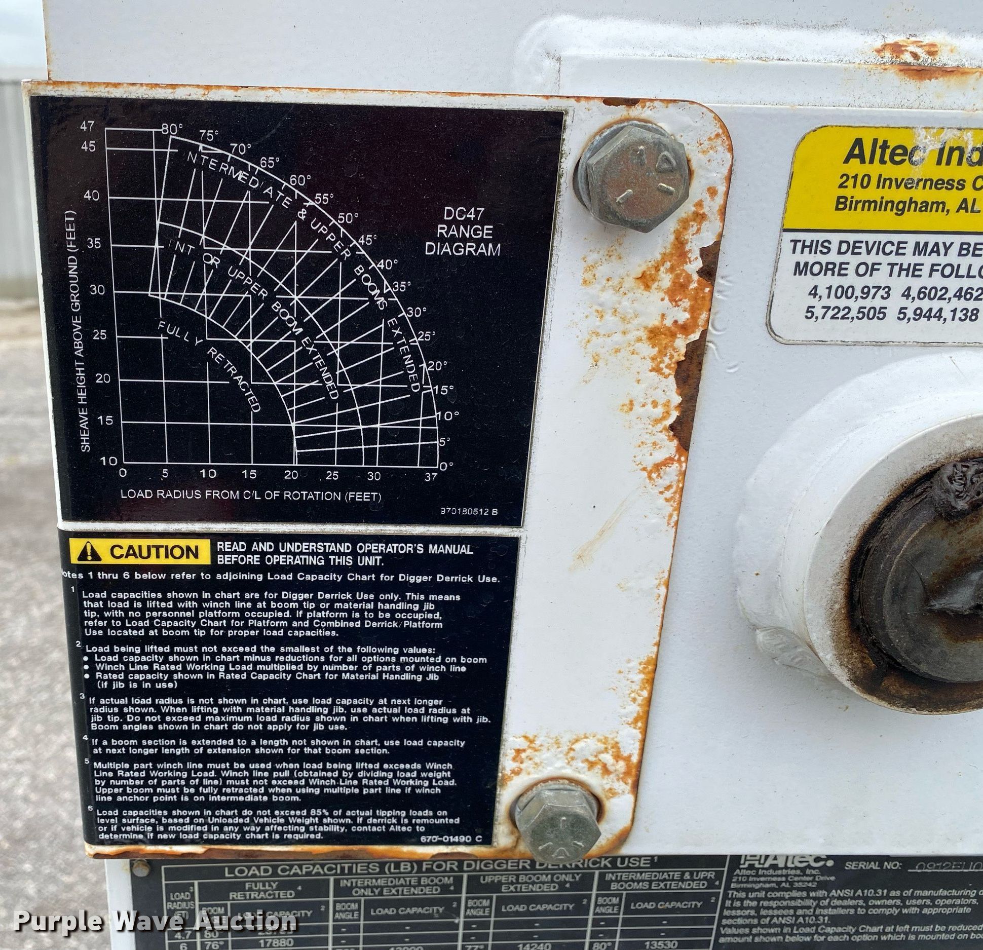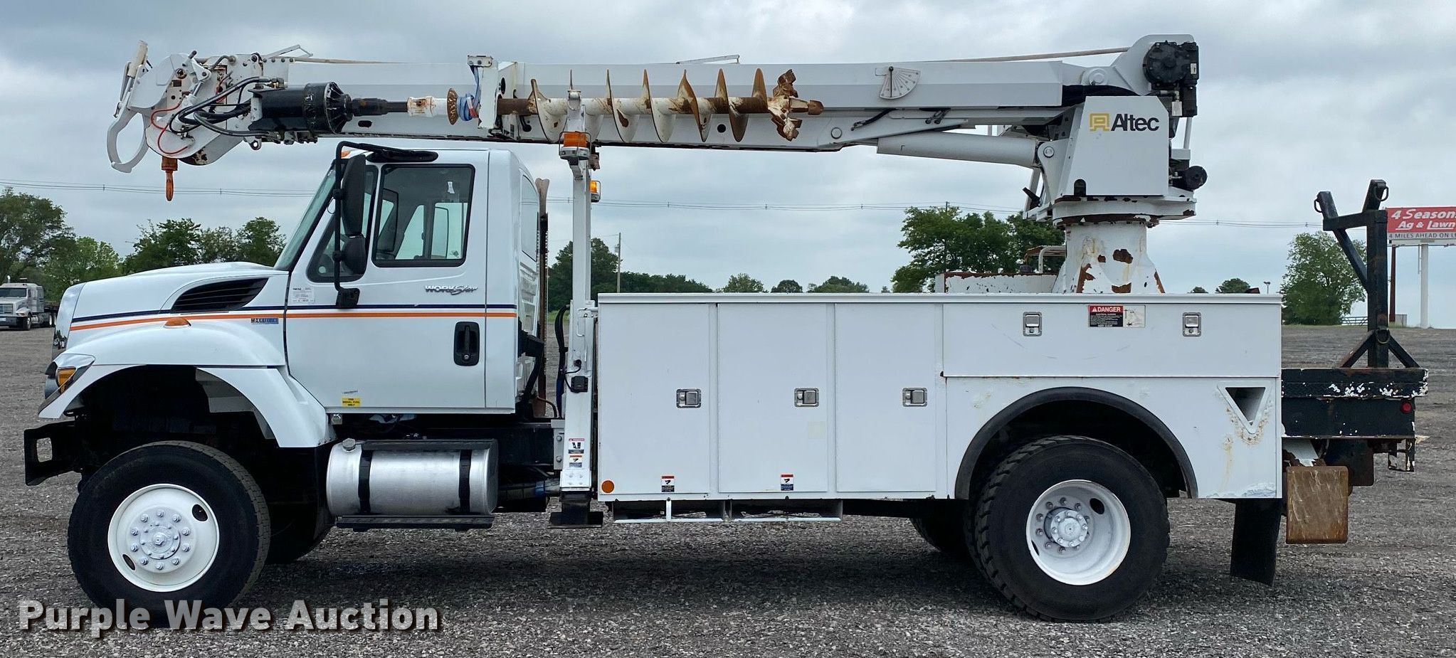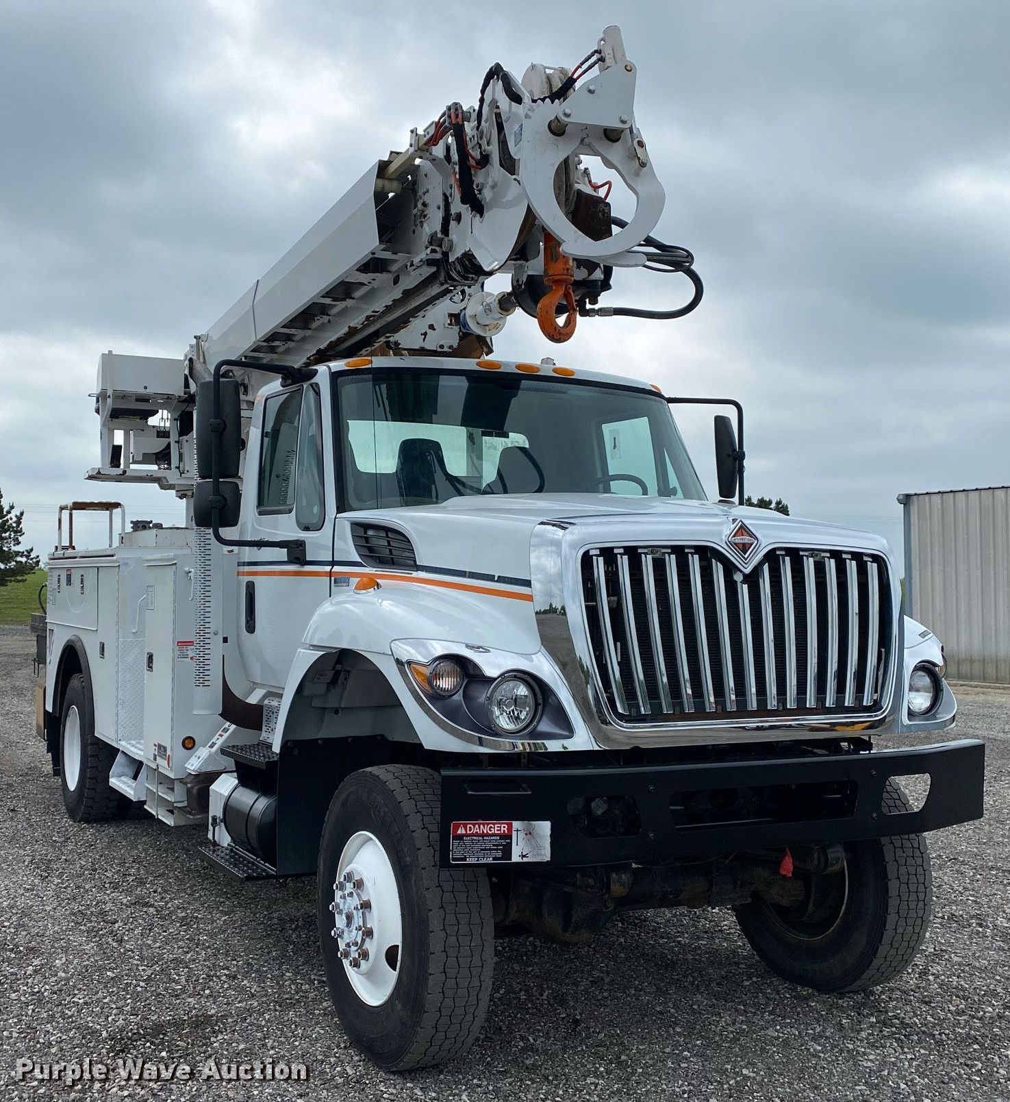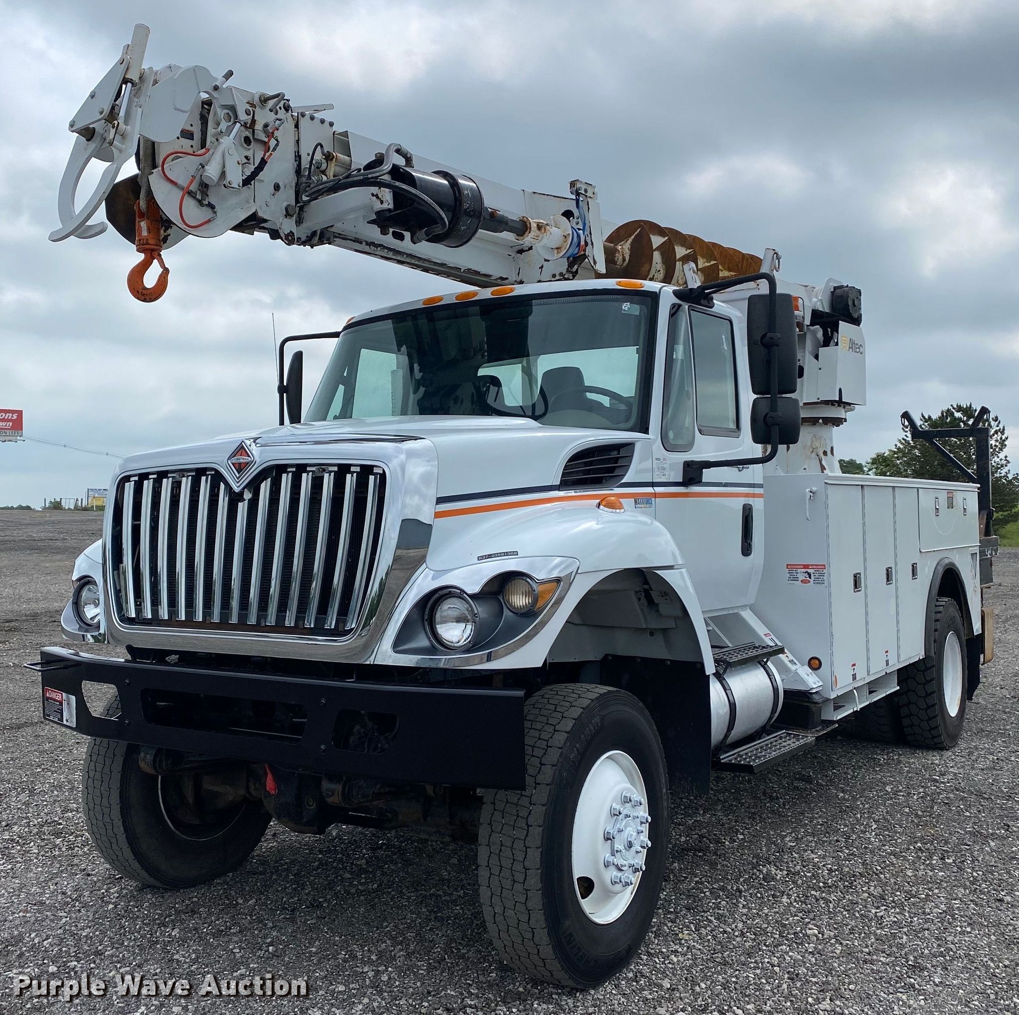 2013 International 7300 SFA digger derrick truck. Miles: 64,312 on odometer, Hours: 7,188 on meter, VIN: 1HTWBAAN3DJ234933. Engine International MaxxForce DT, Displacement: 7.6L , Cylinders: 6, Fuel type: Diesel. Transmission Allison , Automatic. Chassis Four wheel drive, Axles: Single, Suspension: Spring, Brakes: Air, PTO, GVWR: 33,000 lbs. Interior AC, Heat, Cruise control, Brake controller. Features Bed Knapheide 6154BHC, Serial: 20120807-0262362, 13' 10" L x 94" W, Boom Altec DC47TR, Serial: 0912EU0554, Maximum lift capacity: 23,790 lbs, Maximum lift height: 47', Boom type: Telescopic, Boom controls Platform/ basket, Material handler, Pole guide, Auger Diameter: 17".. Tires Size: 11R22.5. Oklahoma title. 15107 North 137th East Avenue. Collinsville, OK 74021