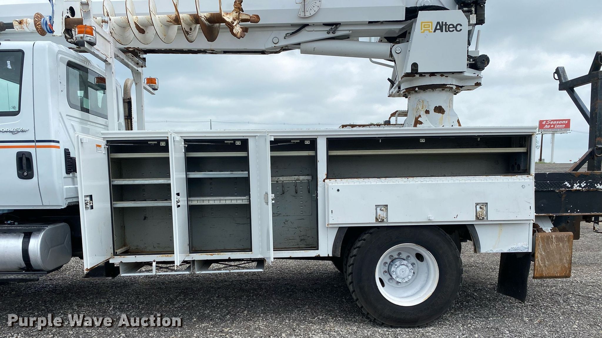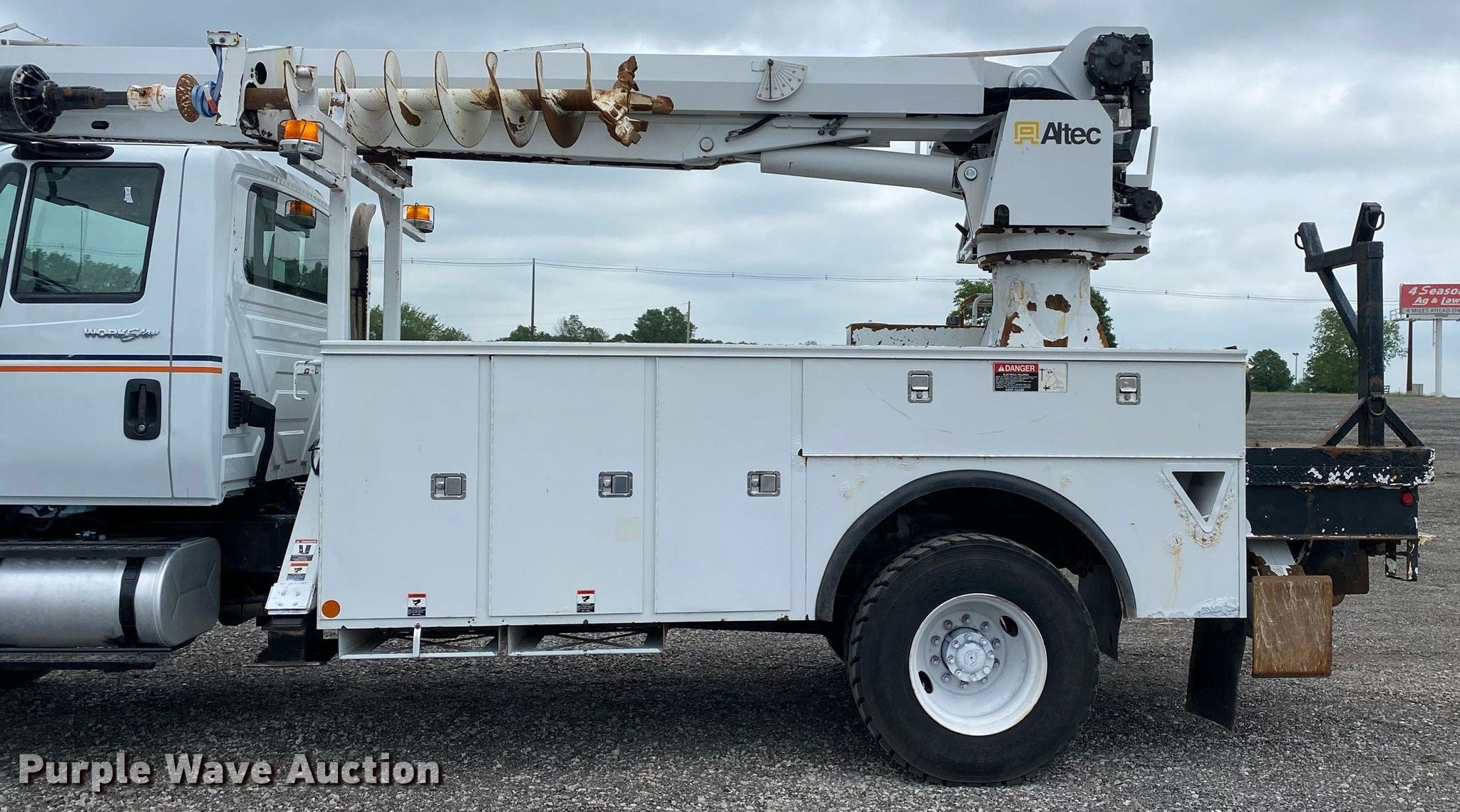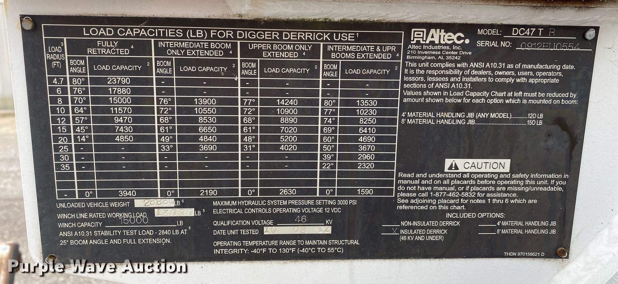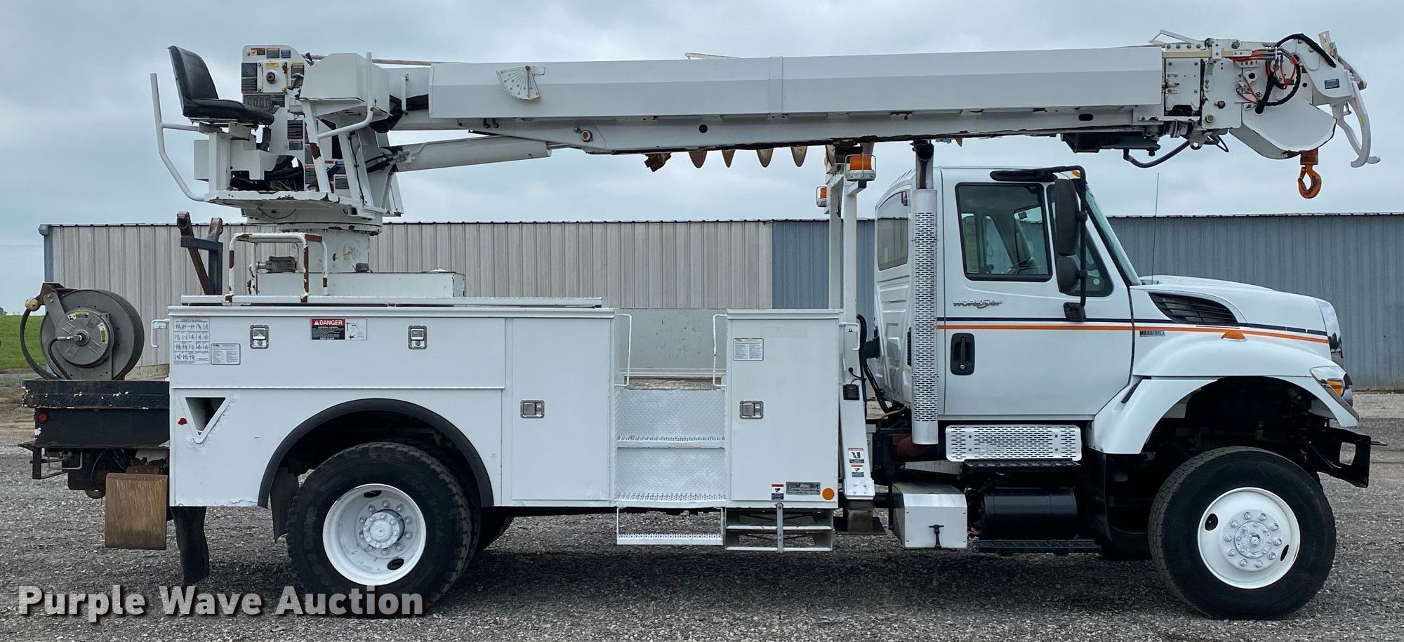 2013 International 7300 SFA digger derrick truck. Miles: 64,312 on odometer, Hours: 7,188 on meter, VIN: 1HTWBAAN3DJ234933. Engine International MaxxForce DT, Displacement: 7.6L , Cylinders: 6, Fuel type: Diesel. Transmission Allison , Automatic. Chassis Four wheel drive, Axles: Single, Suspension: Spring, Brakes: Air, PTO, GVWR: 33,000 lbs. Interior AC, Heat, Cruise control, Brake controller. Features Bed Knapheide 6154BHC, Serial: 20120807-0262362, 13' 10" L x 94" W, Boom Altec DC47TR, Serial: 0912EU0554, Maximum lift capacity: 23,790 lbs, Maximum lift height: 47', Boom type: Telescopic, Boom controls Platform/ basket, Material handler, Pole guide, Auger Diameter: 17".. Tires Size: 11R22.5. Oklahoma title. 15107 North 137th East Avenue. Collinsville, OK 74021
