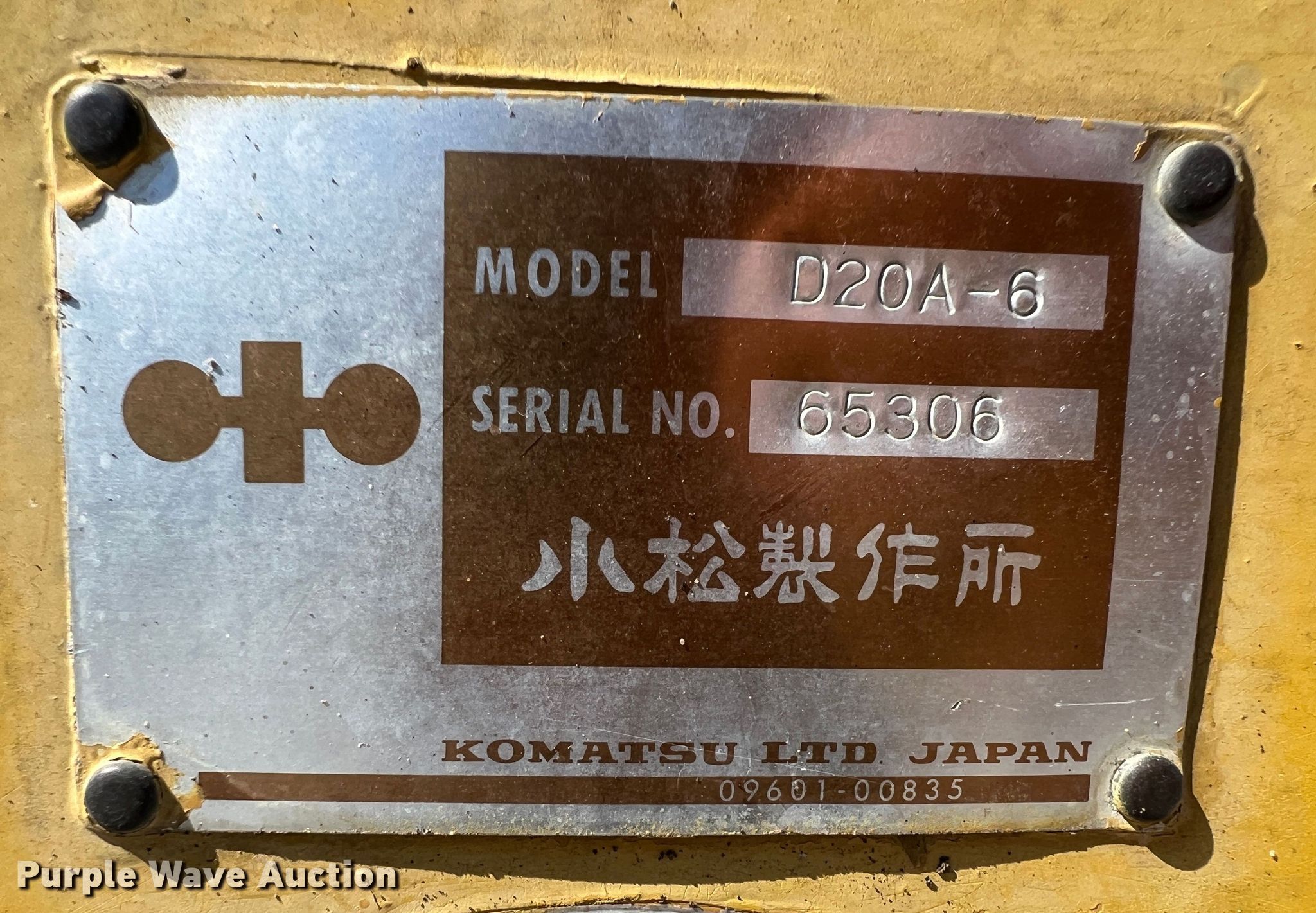 Komatsu D20A6 dozer. Hours: 2,591 on meter, Serial: 65306. Engine Cylinders: 4, Fuel type: Diesel. Transmission Direct drive, 3F - 2R. Operators station Canopy, Steering: Clutch brake. Features Dozer blade Type: 6-way, Straight, Width: 6' 10" W. Tracks Width: 12", Grouser pads: Single, Bottom rollers: 4. Notes Hydraulic leaks. 768 County Road 145. Post, TX 79356