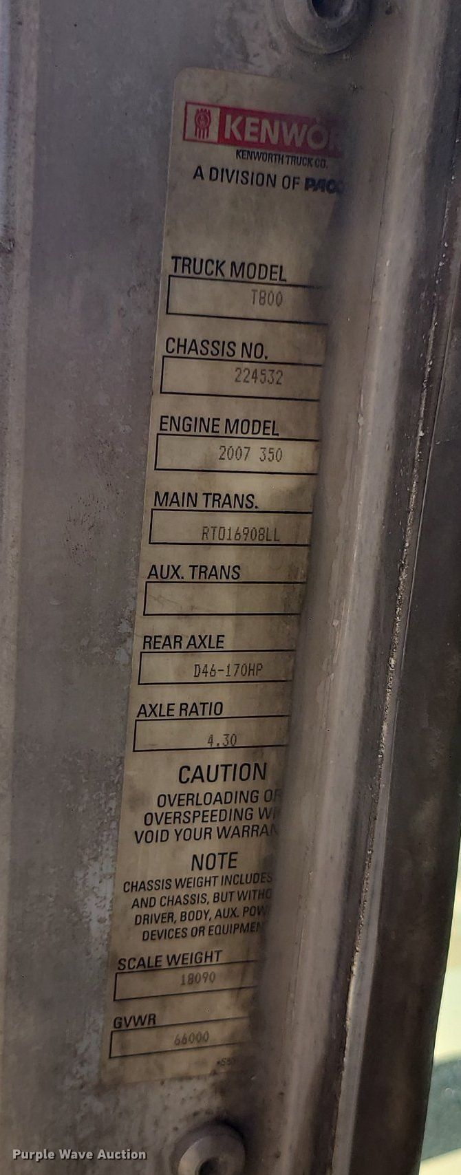 2008 Kenworth T800 dump truck. Miles: 540,811 on odometer, Hours: 12,436 on meter, VIN: 1NKDLU0X98J224532. Engine Caterpillar C13, Displacement: 12.0L, Cylinders: 6, Fuel type: Diesel, Engine brake. Transmission Eaton Fuller 8LL, Manual, Speed: 10. Chassis Axles: Triple, Differential lock: Full, Suspension: Spring over walking beam, Brakes: Air, PTO, GVWR: 66,000 lbs, FAWR: 20,000. Interior AC, Heat, Cruise control. Features Dump bed Ox bodies, 16' L x 96" W, Side height: 60", Bed type: Steel, Roll tarp, Ram: Single. Tires Front: 425/65R22.5, Rear: 11R24.5, Lift axle: 295/75R22.5. Missouri title. Title distribution may be delayed up to 14 days from verification of funds. 19209 E 231st St. Harrisonville, MO 64701