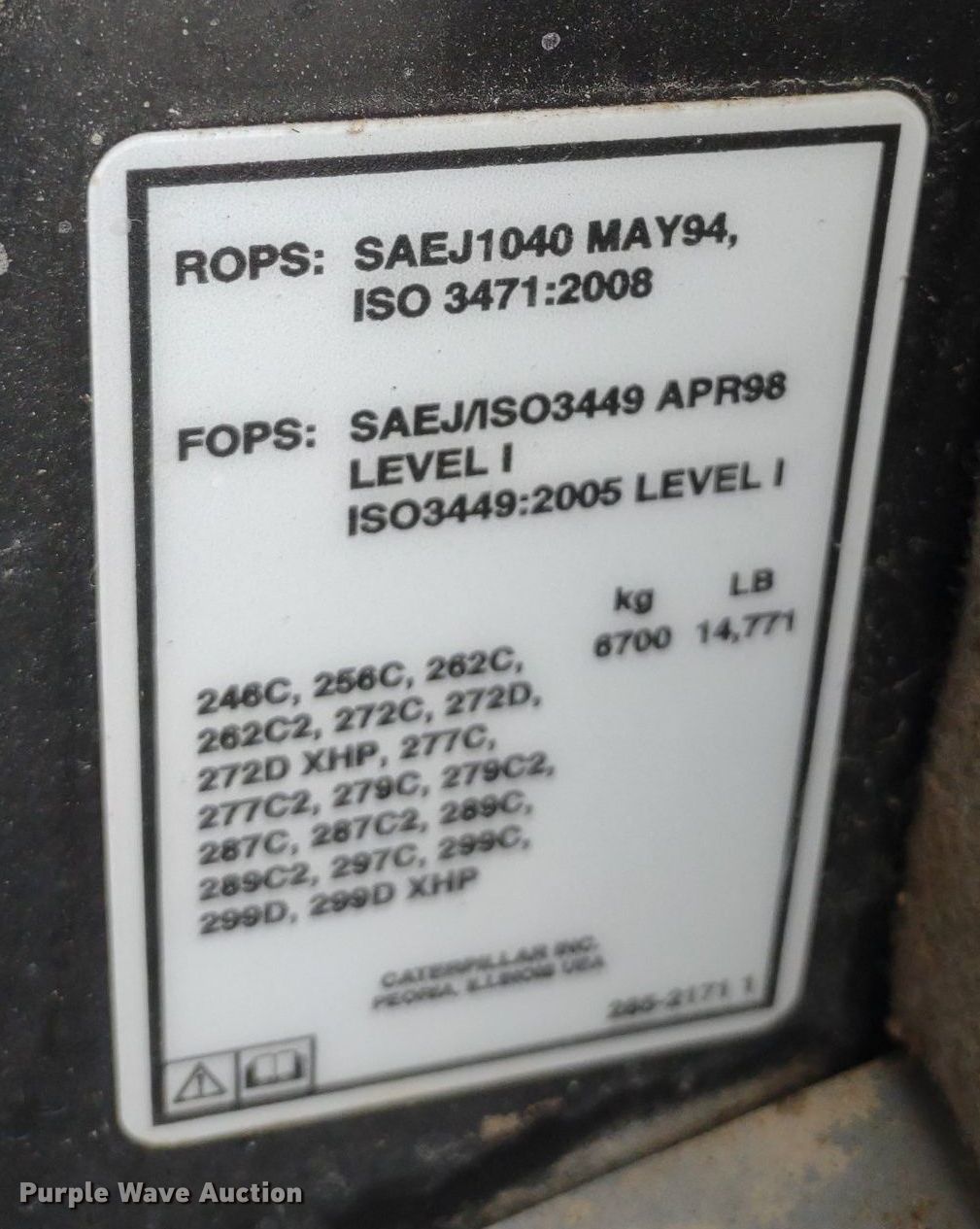 2013 Caterpillar 277C Series II tracked skid steer loader. Hours: 4,381 on meter, Serial: CAT0277CTMET00369. Engine Caterpillar C3.4, Cylinders: 4, Fuel type: Diesel. Transmission Hydrostatic, Two speed travel. Operators station EROPS, AC, Heat, Bucket control: Hand. Features Auxiliary hydraulics, Quick coupler: Hydraulic, Bucket Width: 72", Cutting edge: Weld-on, Teeth: Weld-on. Tracks Width: 18". Notes AC issues, may need recharged. Harrisonville, MO 64701