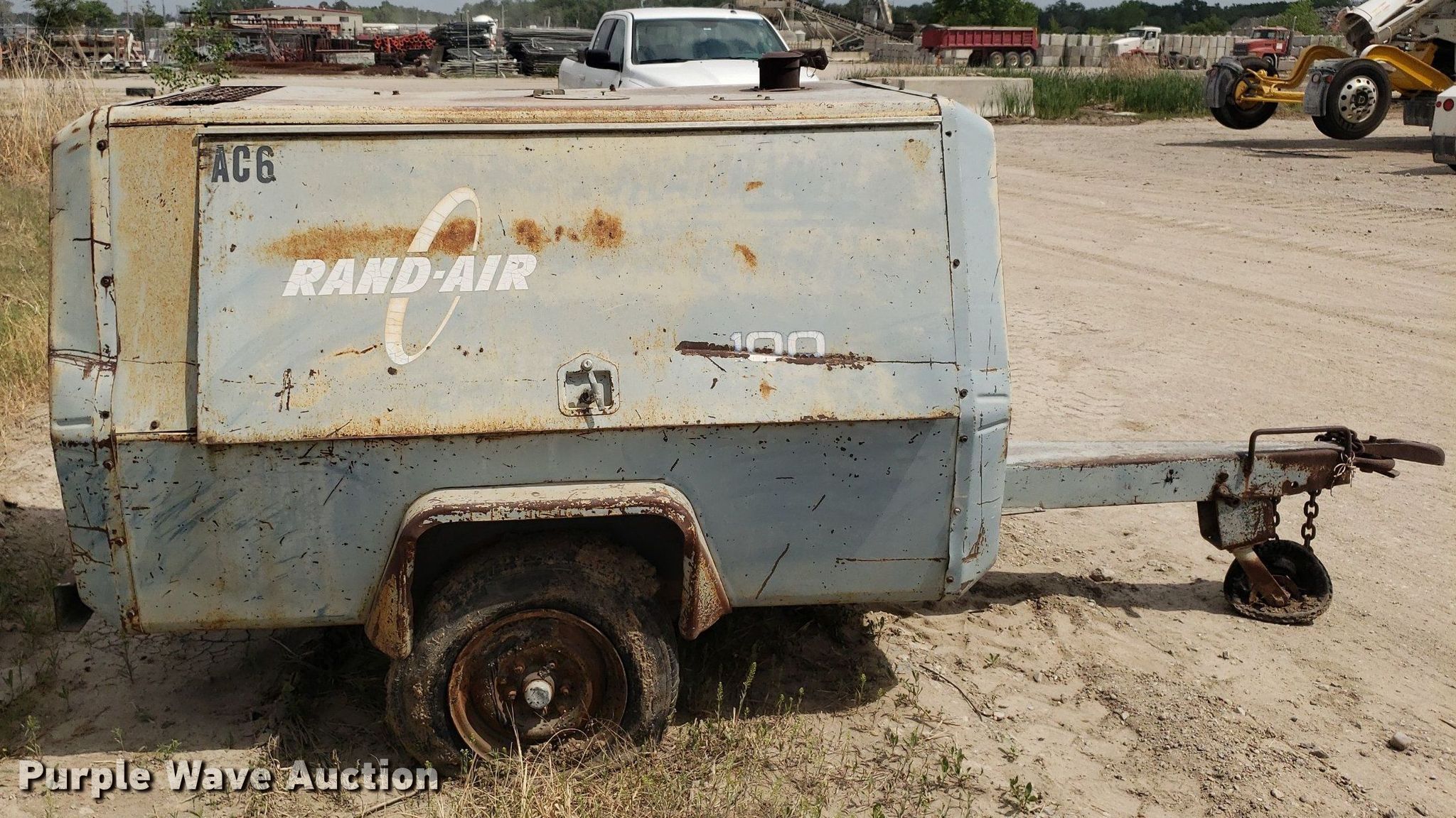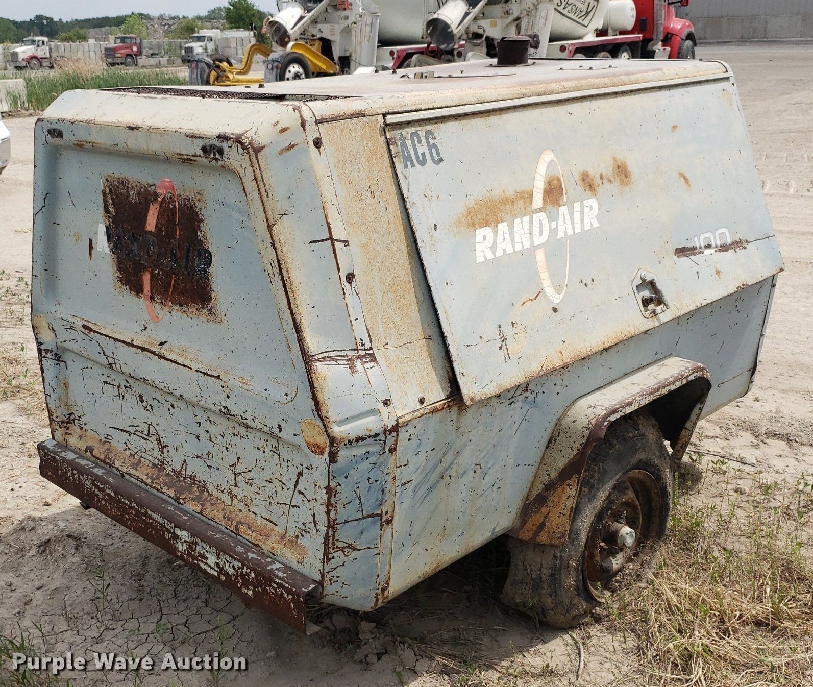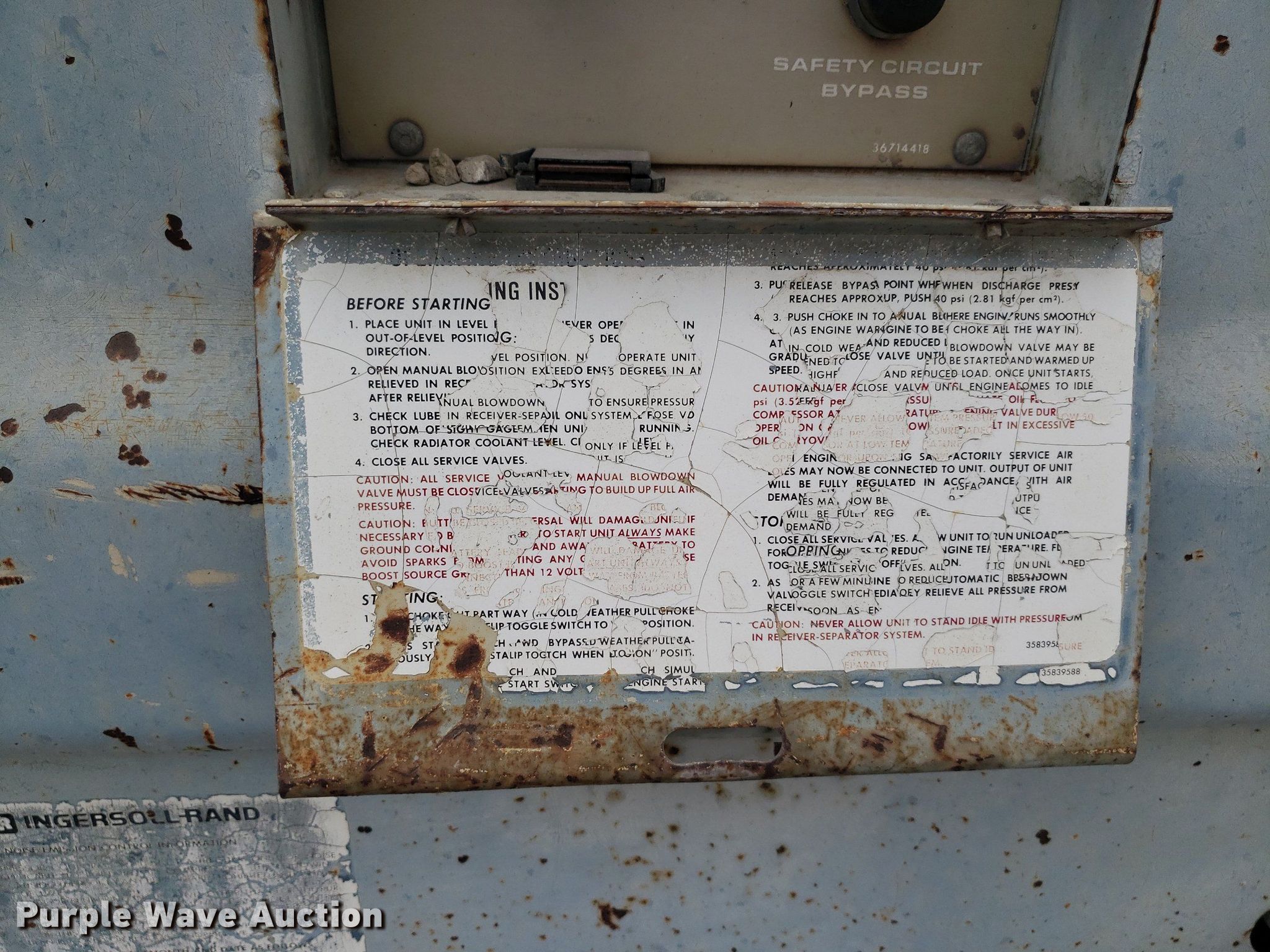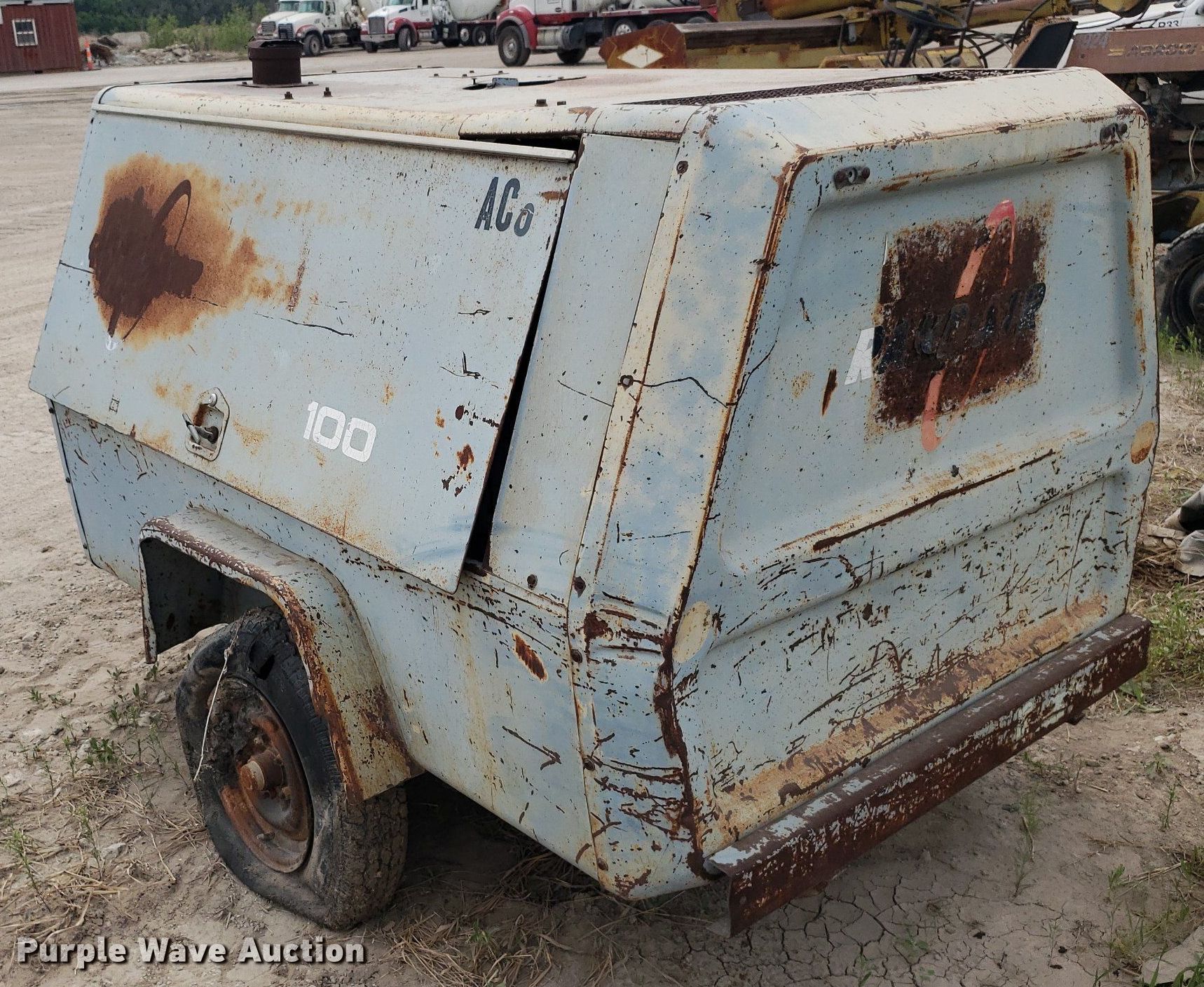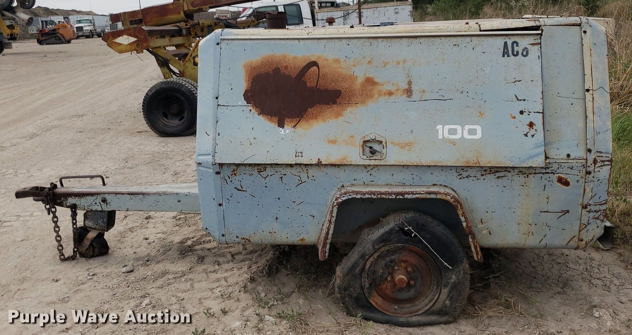 Ingersoll Rand 100 air compressor. Engine. Cylinders: 4, Fuel type: Gas. Features Air compressor CFM: 100. Trailer 11' L x 52" W, Suspension: Spring, Axles: Single, Tire size: 185/80R13. Notes Dead battery, Tires damaged, Non-operational unit. This is worksite support equipment and will not come with a title. Transfer of ownership documentation will be a bill of sale. Kansas Paving. 4880 North Broadway Street. Wichita, KS 67219