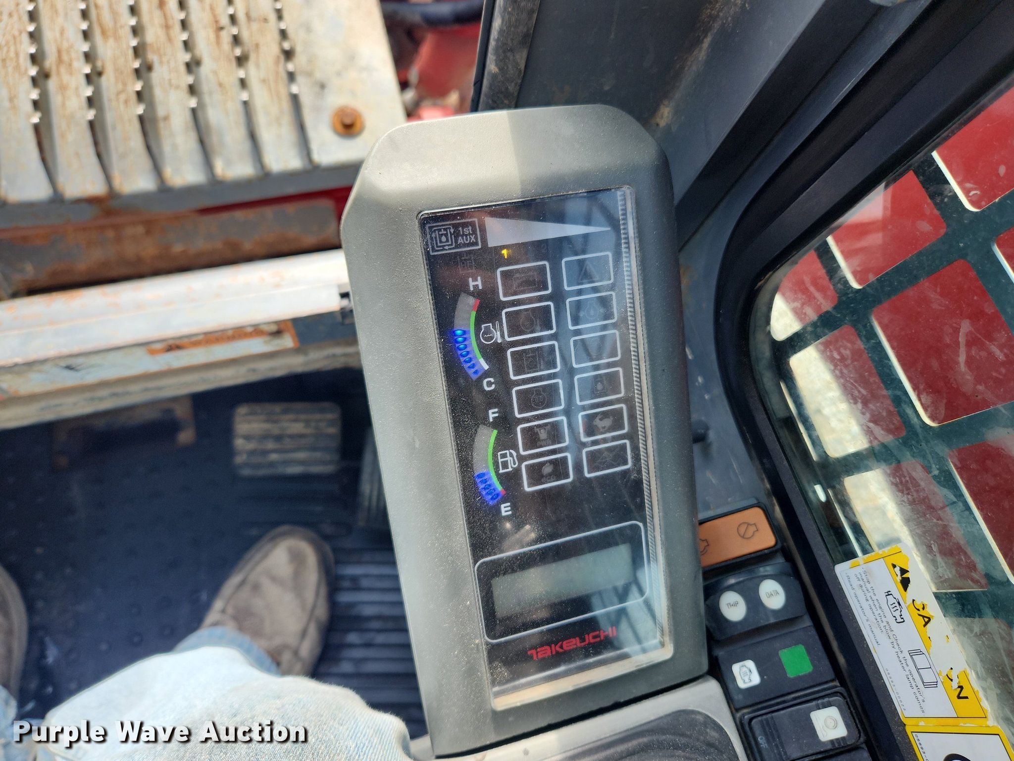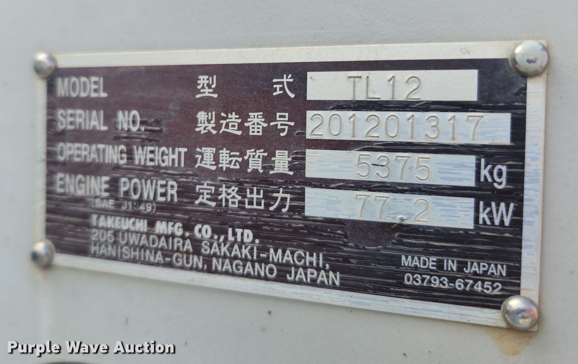 2015 Takeuchi TL12 tracked skid steer loader. Hours: 2,871 on meter, Serial: 201201317. Engine Kubota V3800-CR-TI-EF03, Displacement: 3.8L, Cylinders: 4, Fuel type: Diesel. Transmission Two speed travel. Operators station EROPS, AC, Heat, Bucket control: Hand, Electronic Monitoring System panel. Features Auxiliary hydraulics, Auxiliary electrical outlet, Quick coupler: Hydraulic, Bucket Width: 75", Cutting edge: Bolt-on. Tracks Width: 18". Fruendly Auto Source Inc.. 110 Raceway Park Dr. Moscow Mills, MO 63362