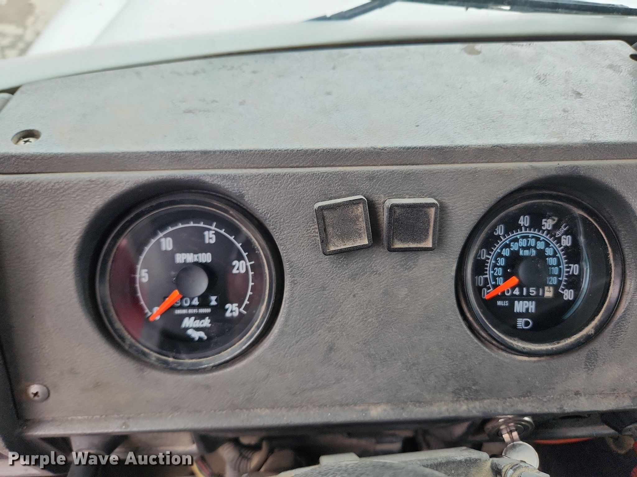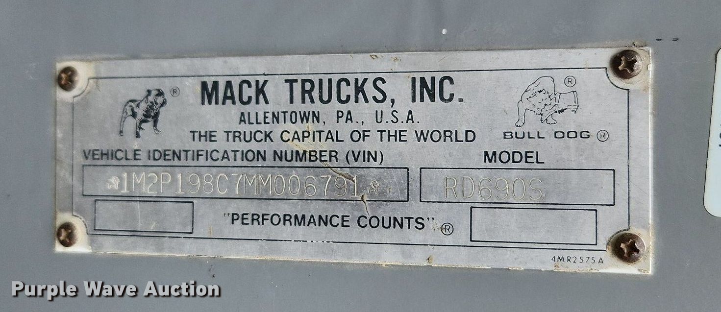 1991 Mack RD690S dump truck. Miles: 104,151 on odometer, Hours: 304 on meter, VIN: 1M2P198C7MM006791. Engine Mack EM6-300L, Cylinders: 6, Fuel type: Diesel. Transmission Mack Maxitorque , Manual, Speed: 8. Chassis Axles: Tandem, Differential lock: Inter-axle, Suspension: Spring over walking beam, Brakes: Air, PTO. Interior AC, Heat, Heated mirrors. Features Dump bed Wheeler, 17' L x 96" W, Side height: 48", Side board height: 9", Bed type: Steel, Roll tarp, Ram: Single , End gate: Air operated. Tires Front: 425/65R22.5, Rear: 11R22.5. Notes Windshield chipped or cracked. Missouri Prior salvage title. Title distribution may be delayed up to 14 days from verification of funds. M&H Concrete Contractors Inc.. St. Peters, MO 63376