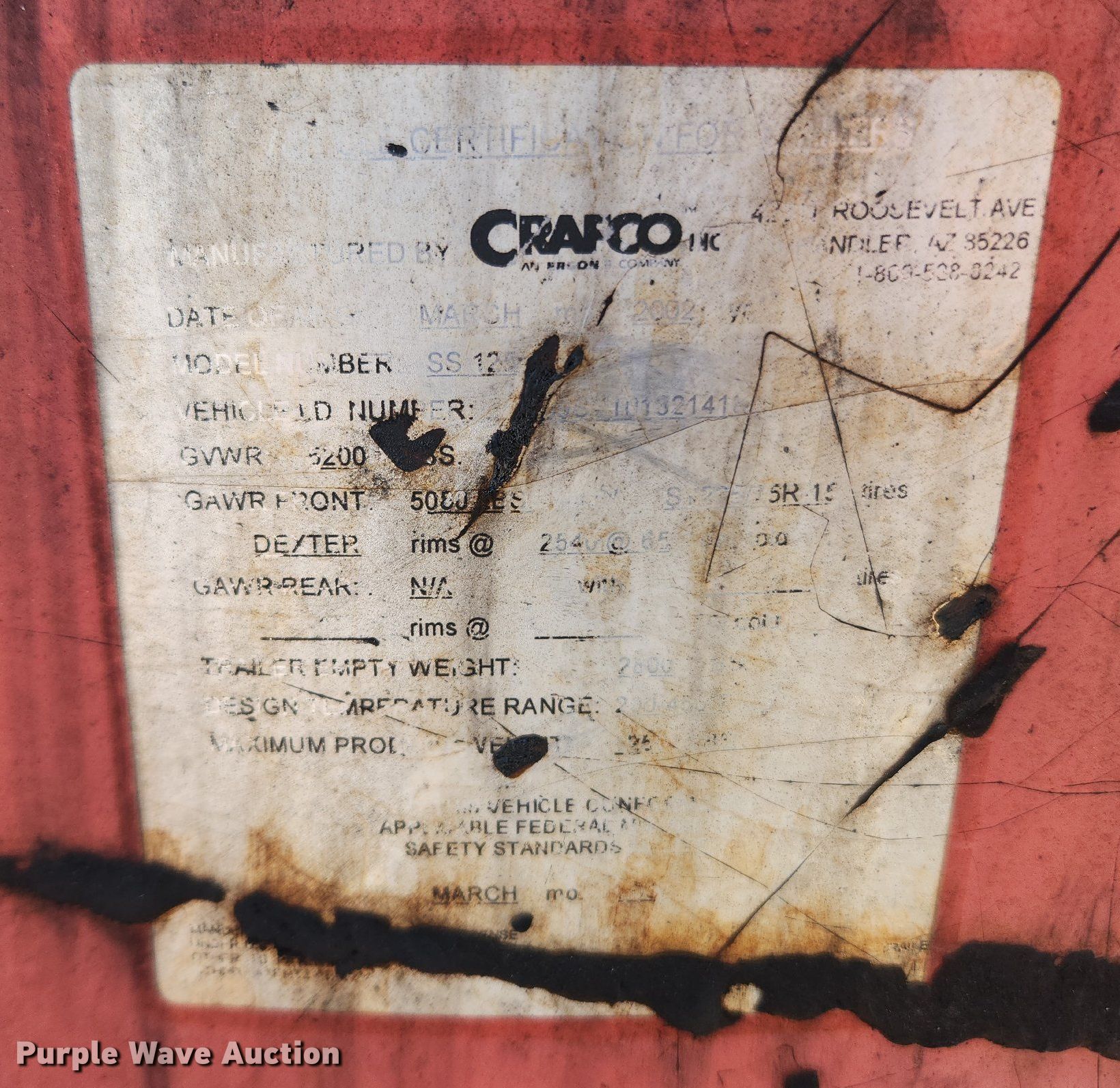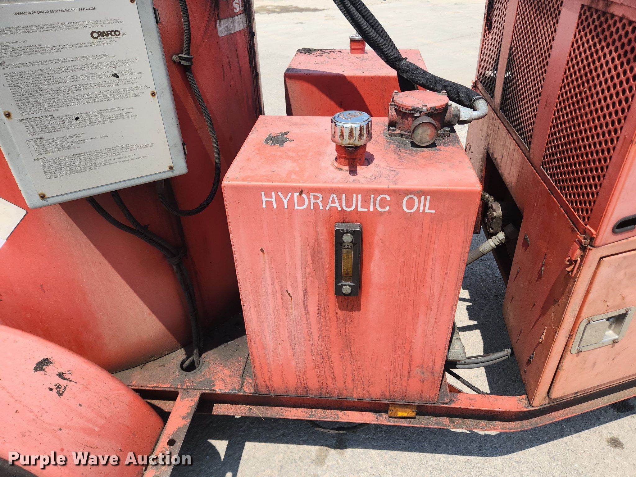 2002 Crafco SS125 pothole patcher. Hours: 2,759 on meter, Serial: 1C9SY101321418075. Engine Isuzu 3LB1, Cylinders: 3, Fuel type: Diesel. Features 125 gallon tank capacity , Spray wand, Diesel burner, 250,000 BTU. Tires Size: 225/75R15. Notes Coolant leak, possible blown head gasket. This is worksite support equipment and will not come with a title. Transfer of ownership documentation will be a bill of sale. M&H Concrete Contractors Inc.. St. Peters, MO 63376