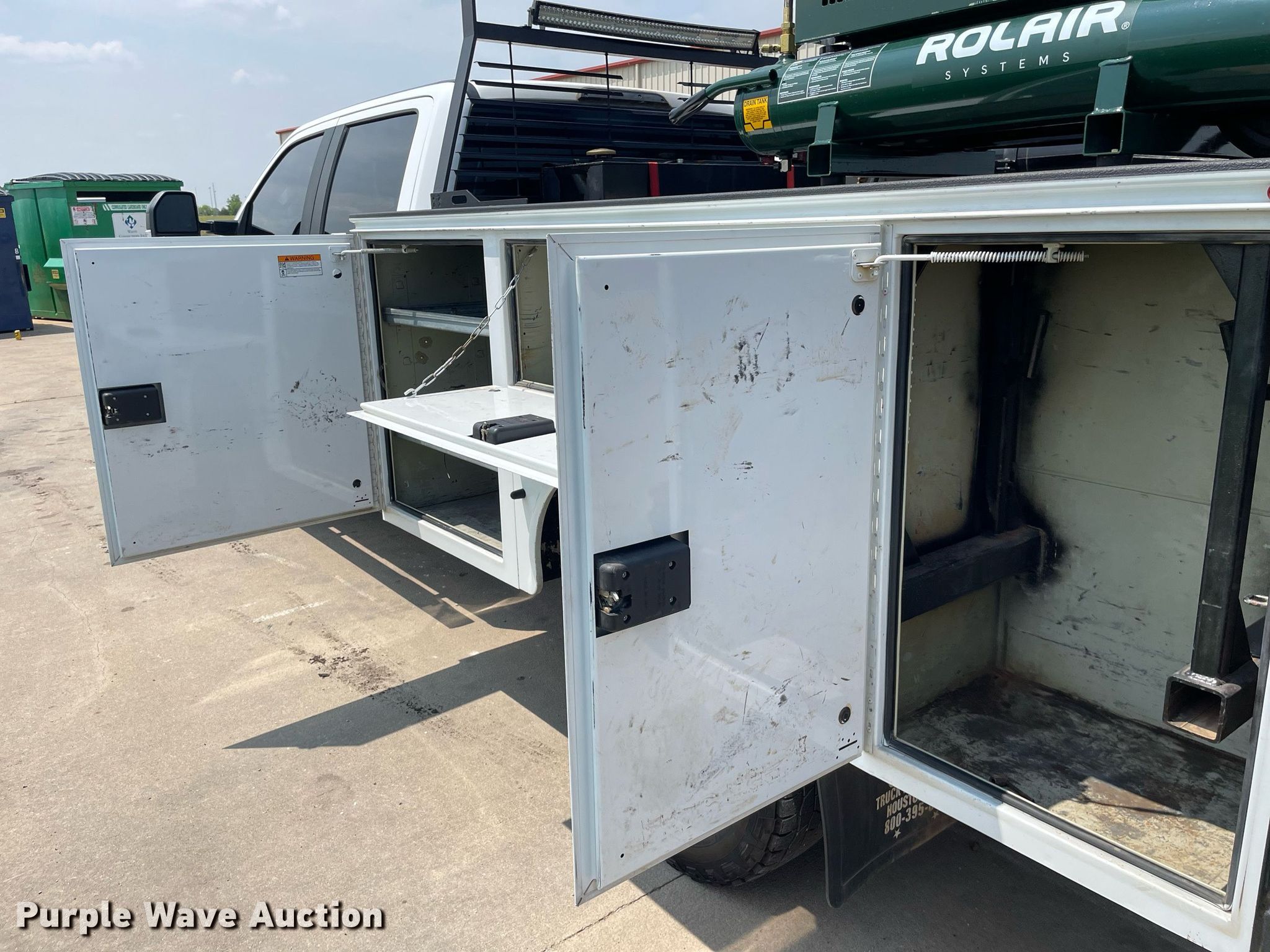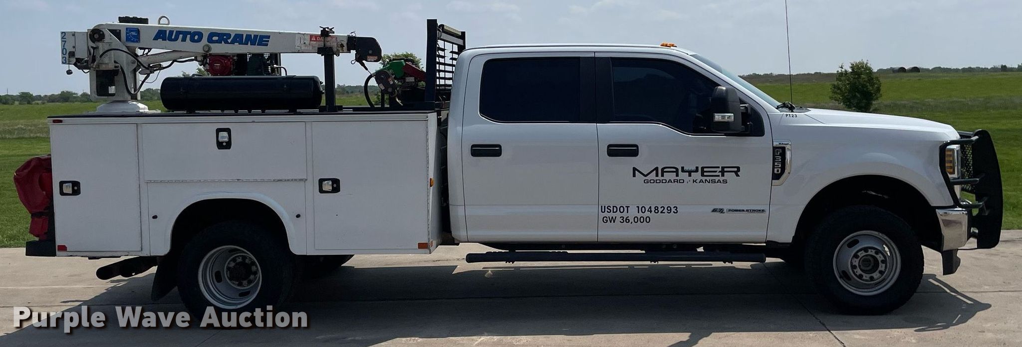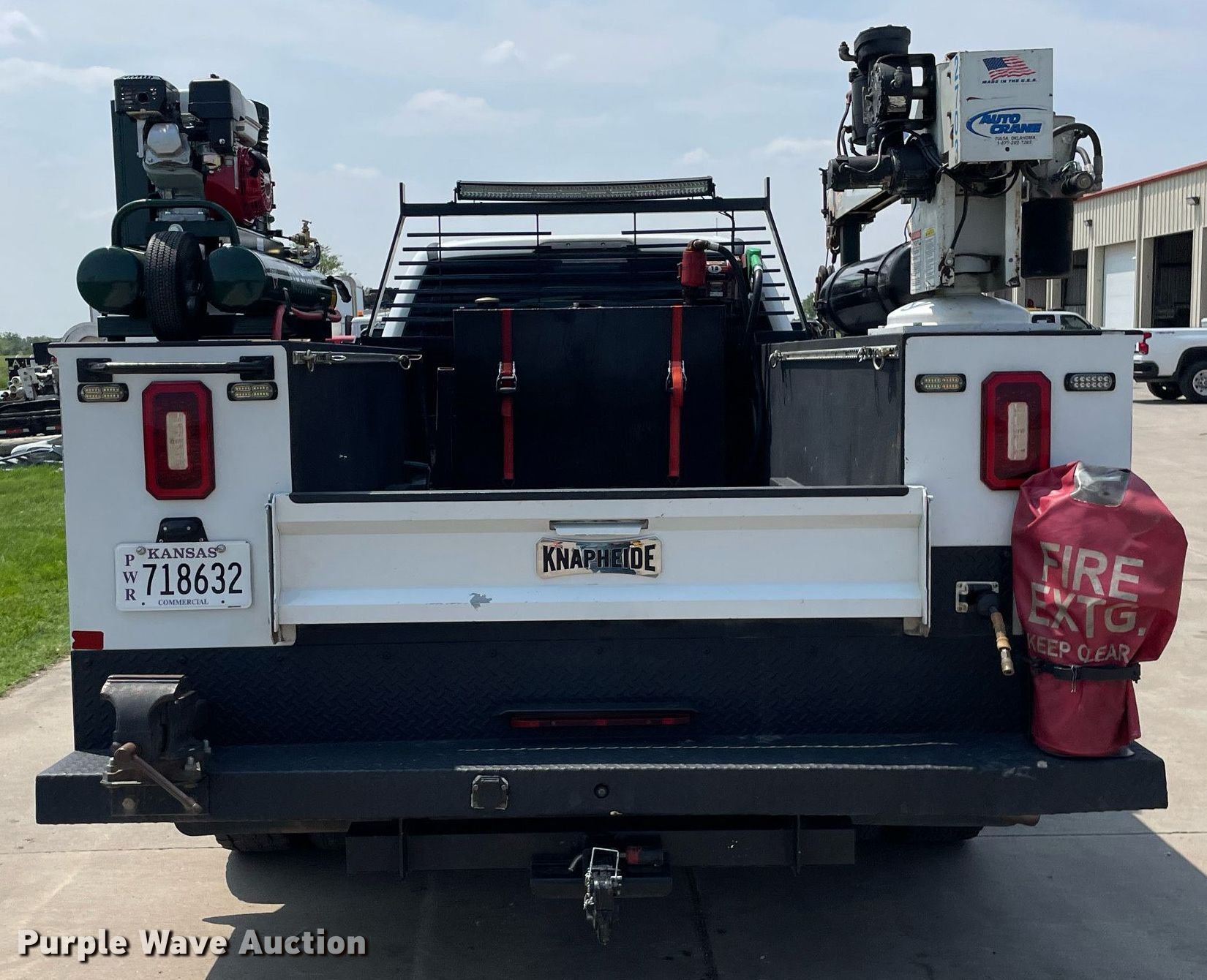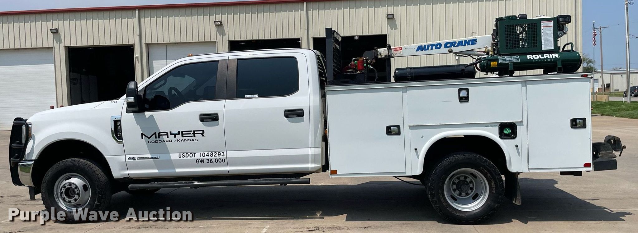 2018 Ford F350 Super Duty Crew Cab utility bed pickup truck. Miles: 135,138 on odometer, VIN: 1FD8W3HT9JEB40176. Engine Displacement: 6.7L V8 OHV, Cylinders: 8, Fuel type: Diesel. Transmission Automatic. Chassis Four wheel drive. Interior AC, Heat, Heated mirrors, Power windows, Power locks, Cruise control, Backup camera. Features Bed Knapheide 6108D54, 9' 8" L x 96" W, Air compressor Rolair MDL6590HK18-0279, Crane Autocrane 2703, Maximum boom length: 14' Maximum lift capacity: 2,700 lbs, Controls: remote, Auxiliary fuel tank Fill Rite pump, Hose reel. Tires Size: 265/70R17. Notes EGR delete. Kansas title. Title distribution may be delayed up to 14 days from verification of funds. Mayer Specialty Services, LLC. Goddard, KS 67052