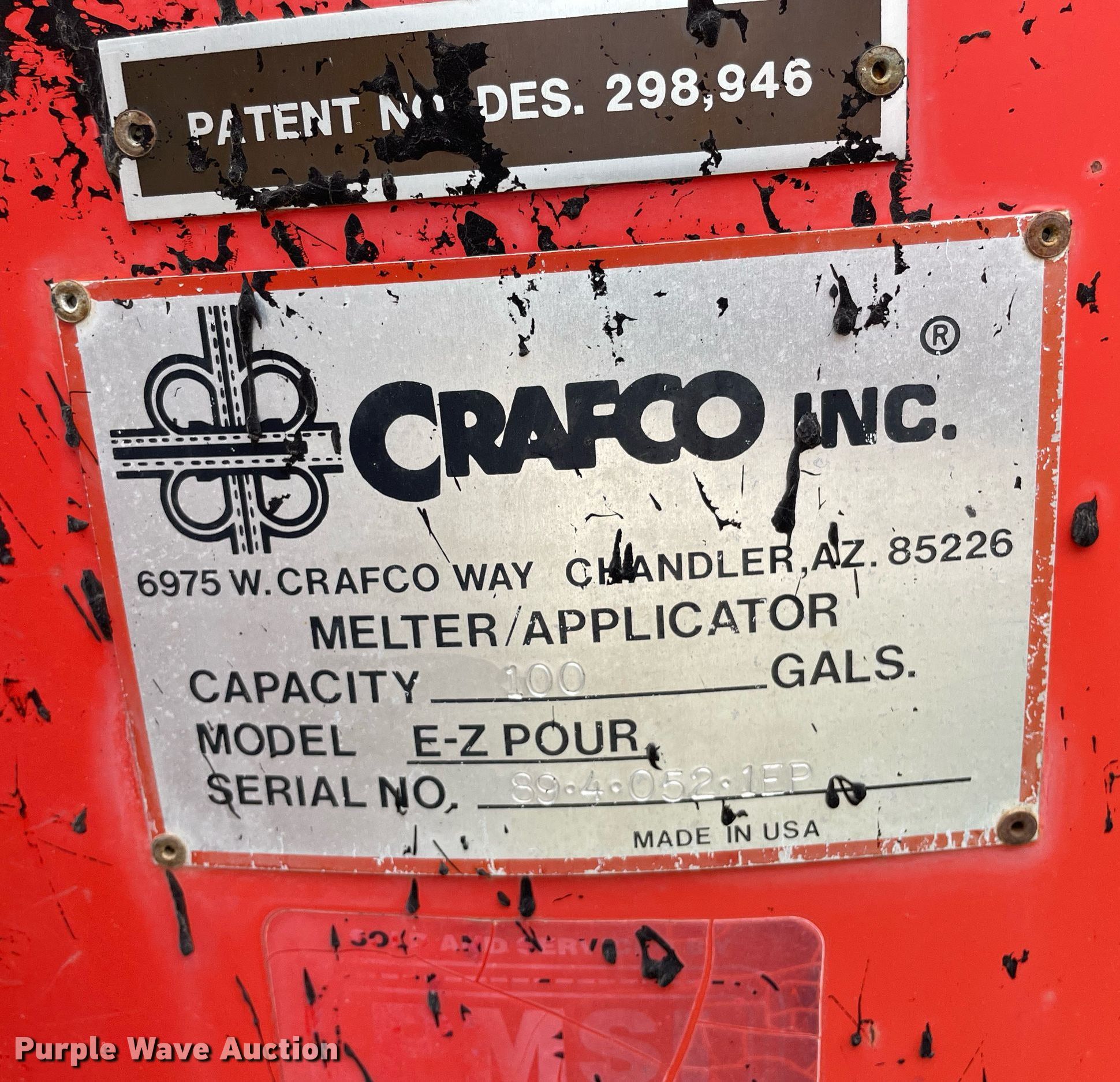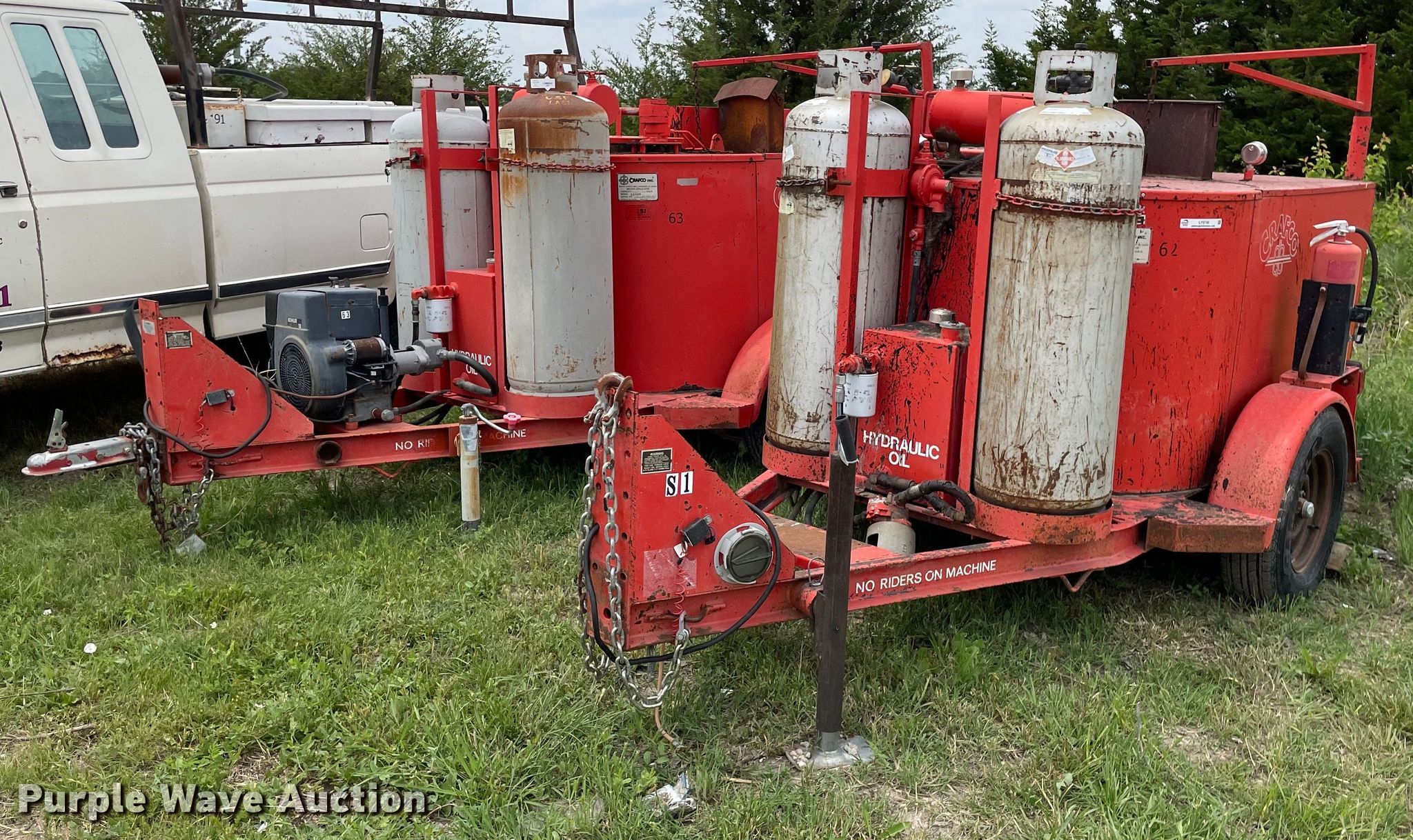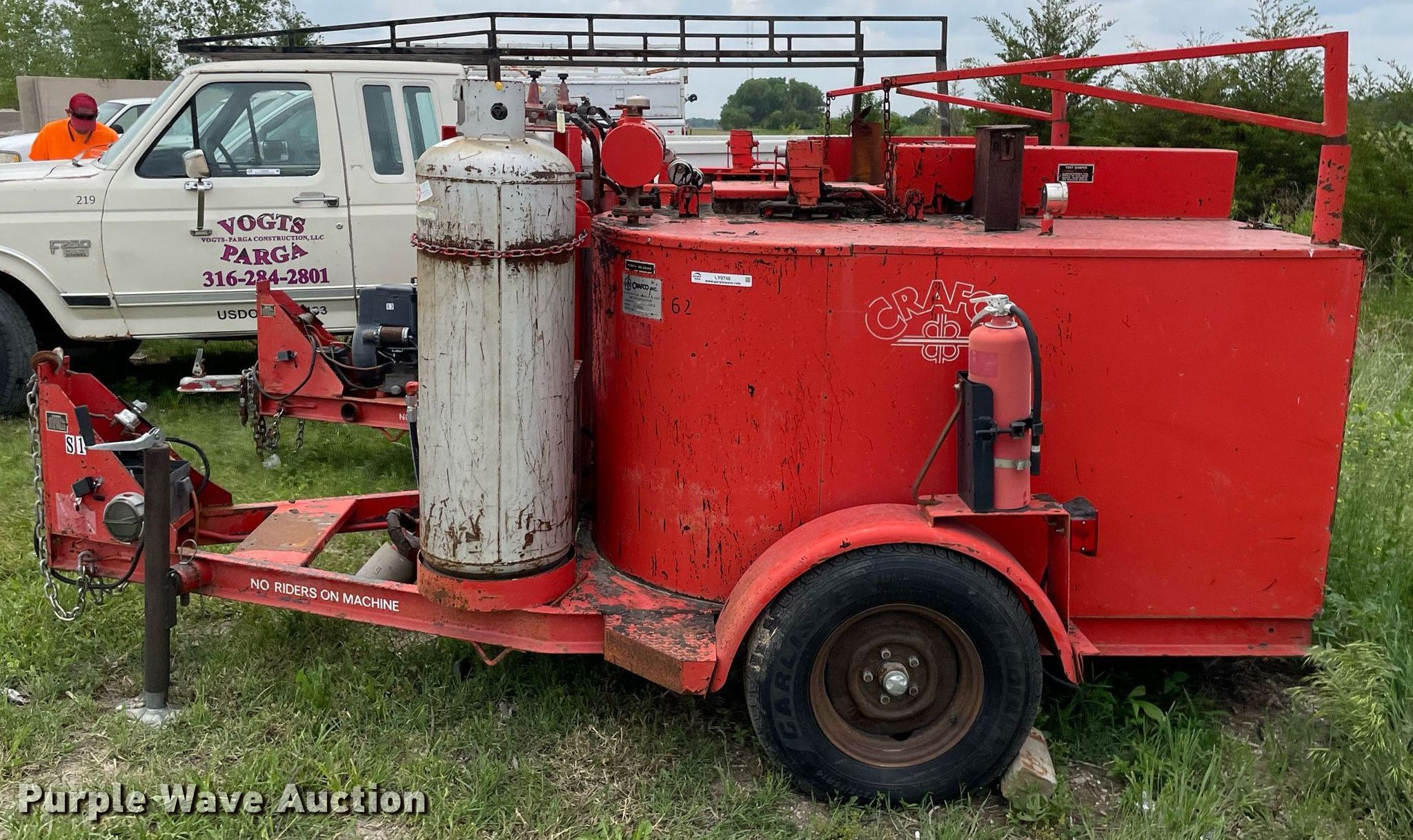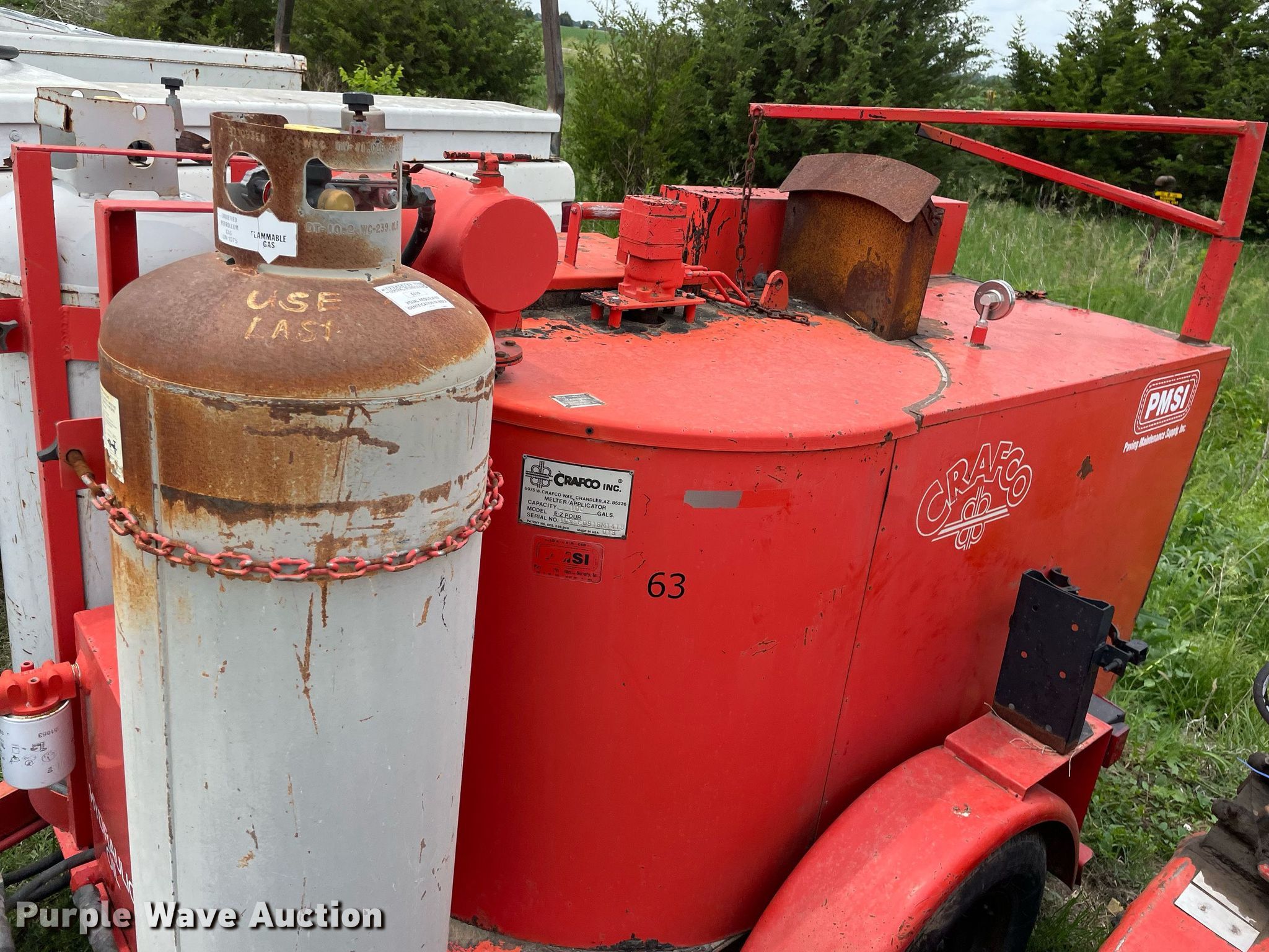 (2) Crafco E-Z Pour melter applicators. Crafco E-Z Pour. Hours: 3,113 on meter, VIN: 1C9EE0918M1418013. Engine Kohler Magnum 12, Cylinders: 1, Fuel type: LPG. Features Capacity: 100 gallons, (2) propane tanks. Tires Size: 205/75R14. Notes Unknown operating condition. Crafco E-Z Pour Hours: Unknown, VIN: 89-4-052-1EP. Engine No engine. Features Capacity: 100 gallons, (2) propane tanks. Tires Size: 205/75R14. Notes Parts missing, Hitch missing, No battery, Non-operational unit. This is worksite support equipment and will not come with a title. Transfer of ownership documentation will be a bill of sale. Vogts-Parga Construction LLC. Newton, KS 67114