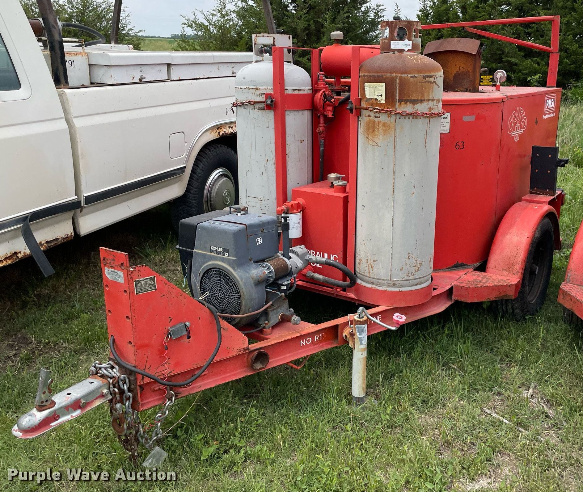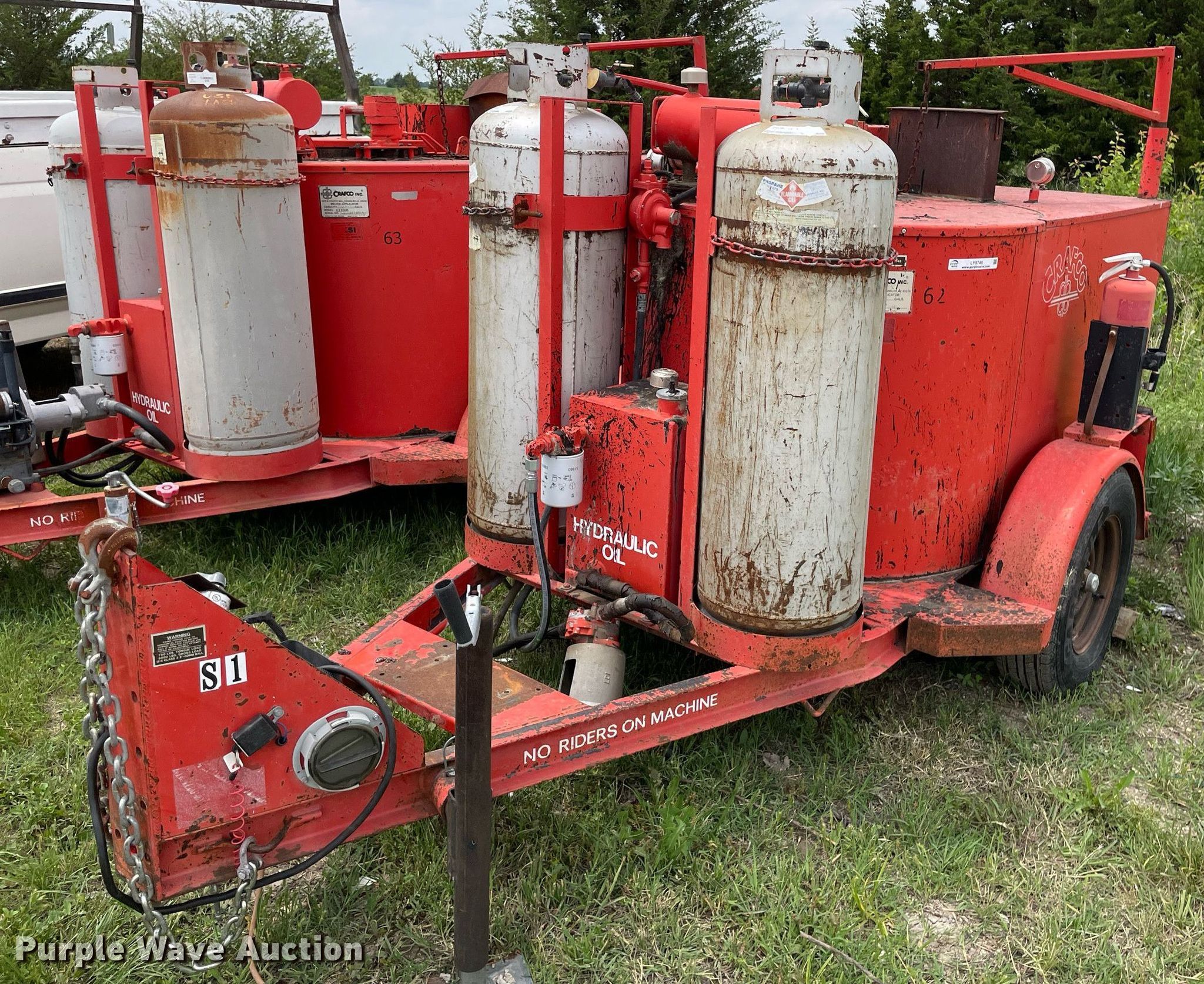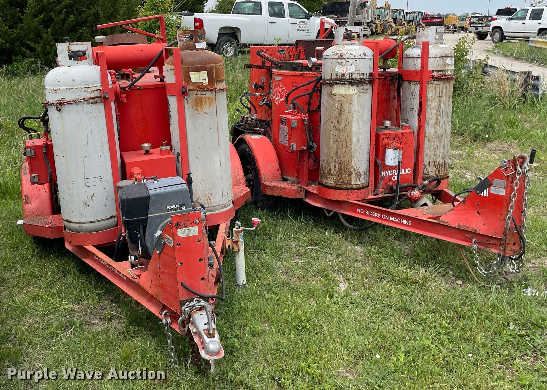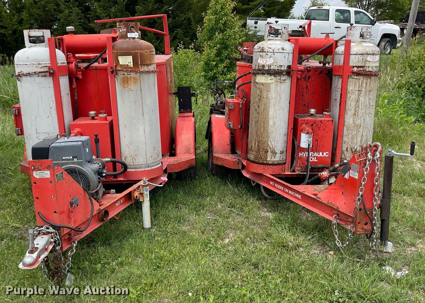(2) Crafco E-Z Pour melter applicators. Crafco E-Z Pour. Hours: 3,113 on meter, VIN: 1C9EE0918M1418013. Engine Kohler Magnum 12, Cylinders: 1, Fuel type: LPG. Features Capacity: 100 gallons, (2) propane tanks. Tires Size: 205/75R14. Notes Unknown operating condition. Crafco E-Z Pour Hours: Unknown, VIN: 89-4-052-1EP. Engine No engine. Features Capacity: 100 gallons, (2) propane tanks. Tires Size: 205/75R14. Notes Parts missing, Hitch missing, No battery, Non-operational unit. This is worksite support equipment and will not come with a title. Transfer of ownership documentation will be a bill of sale. Vogts-Parga Construction LLC. Newton, KS 67114