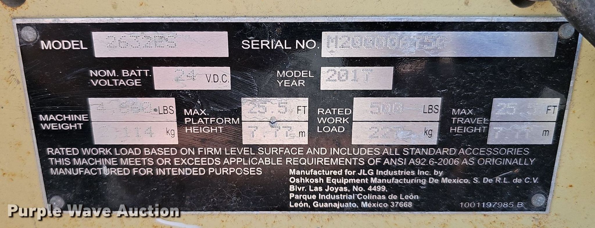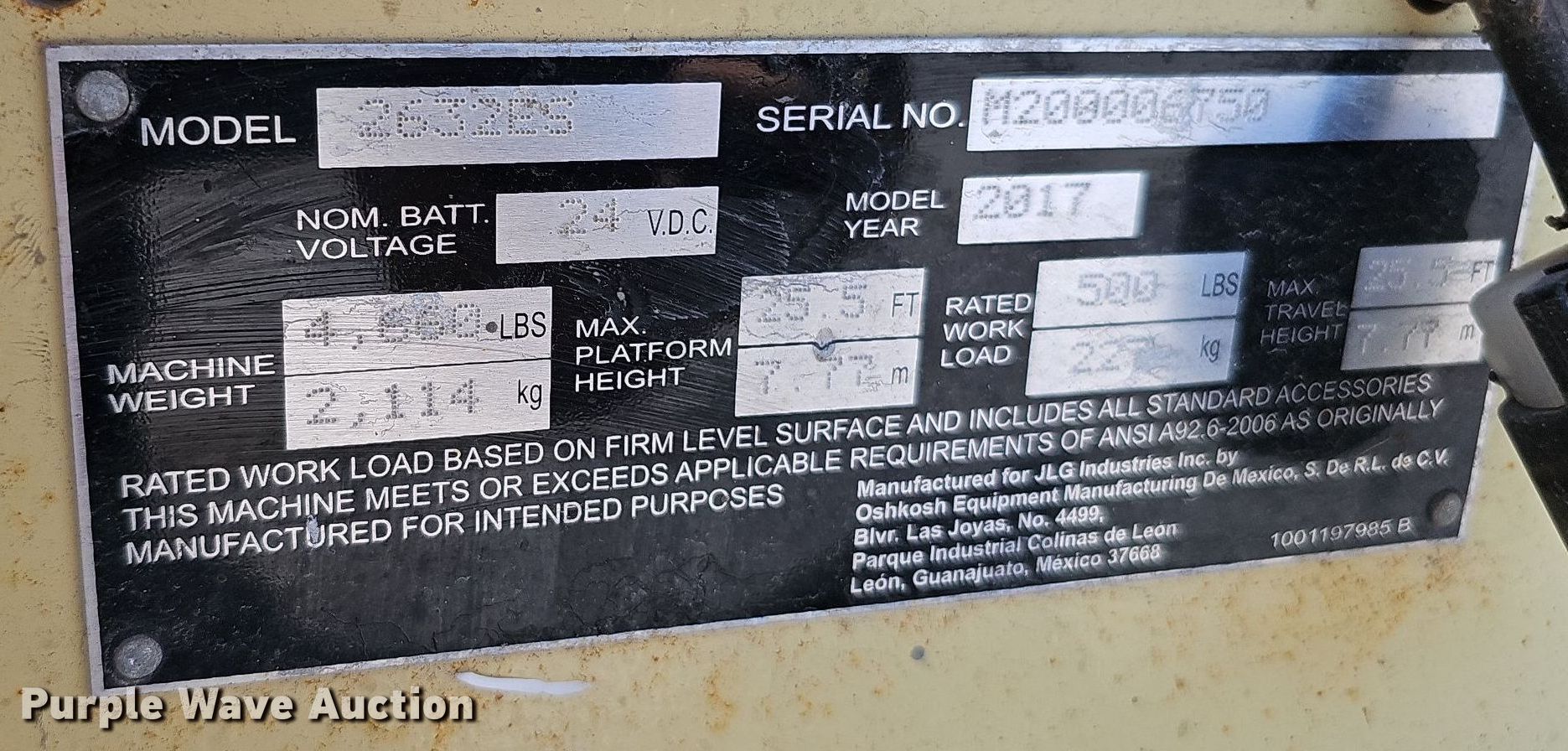 Purple Wave is selling a used Scissor or Vertical Lift in Nebraska. This item is a 2017 JLG 2632ES scissor lift with the following: Hours: 28 on meter, Serial: M200006750