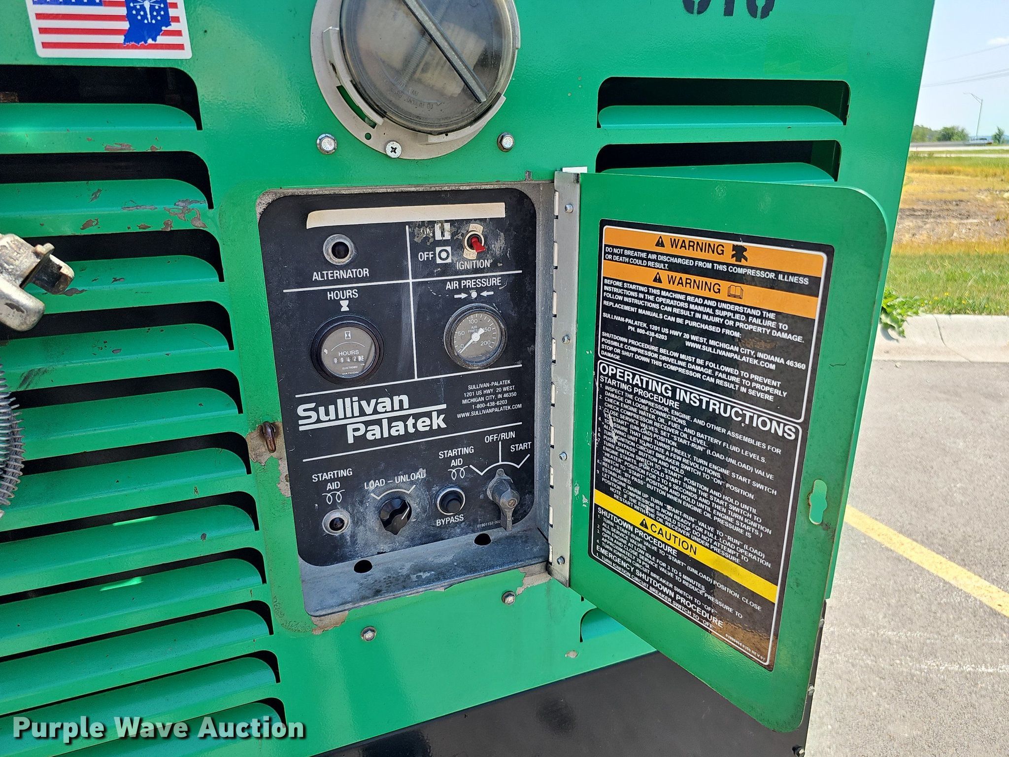 Purple Wave is selling a used Air Compressor in Nebraska. This item is a Sullivan Palatek DF185P3JDSB air compressor with the following: Hours: 942 on meter, Serial: 101956