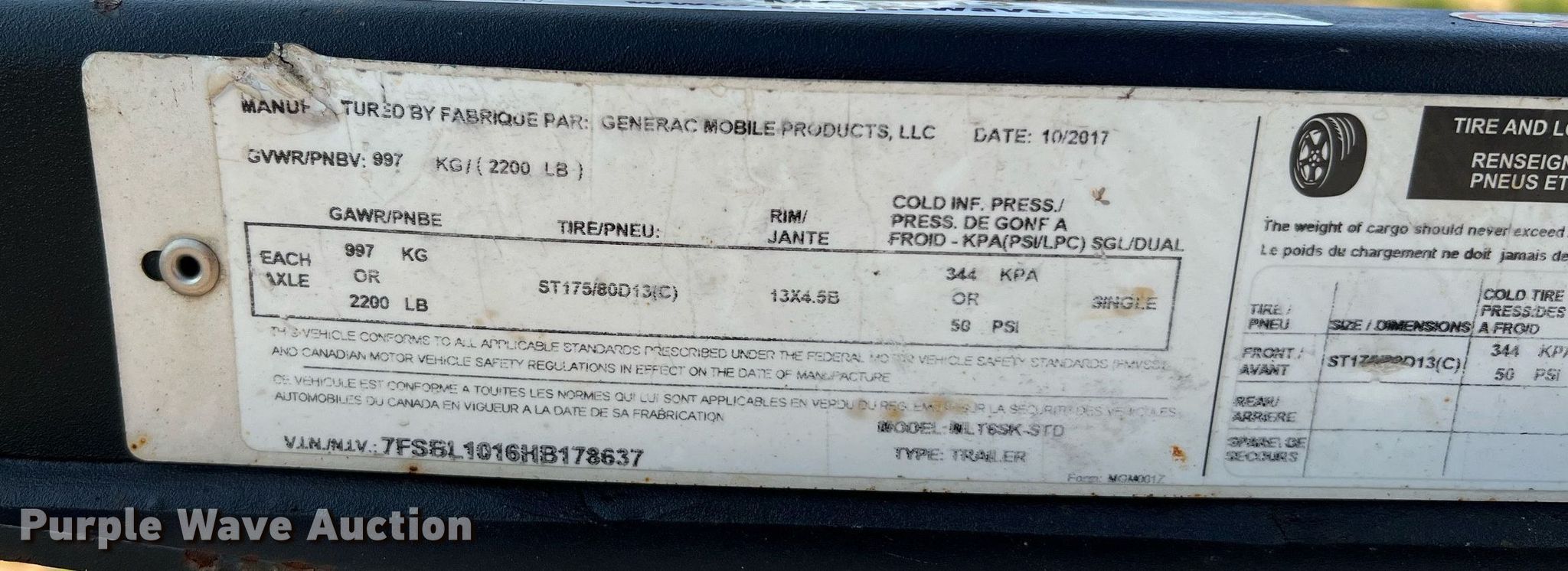 2017 Generac MLT6S light plant. Hours: 3,497 on meter, VIN: 7FS6L1016HB178637. Engine Kubota D1005, Serial: 1HL4107, Cylinders: 3, Fuel type: Diesel. Features Generator Pancake 201CSA5411, kVA: 6, kW: 6, Phase: Single, Electric start, Fuel tank, Light plant Bulbs: 4, Watts: 1,500, Hoist: Manual, Stabilizers. Trailer Generac, 8' L x 55" W, Ball hitch size: 2", Suspension: Spring, Axles: Single, Tire size: 175/80D13, GVWR: 2,200 lbs. This is worksite support equipment and will not come with a title. Transfer of ownership documentation will be a bill of sale. Plunkett Enterprises. 1825 County Road 212. Angleton, TX 77515