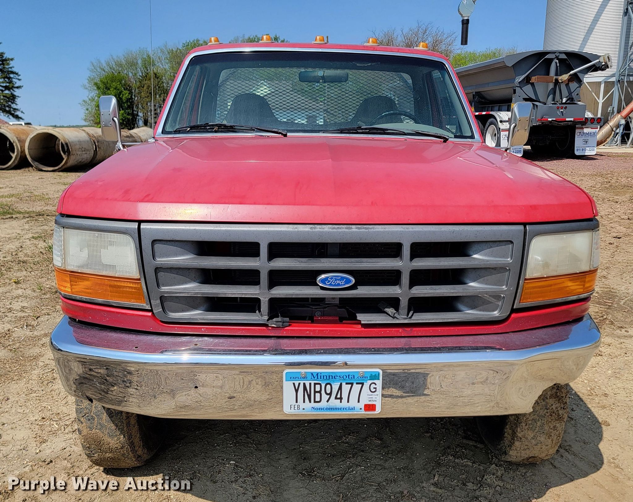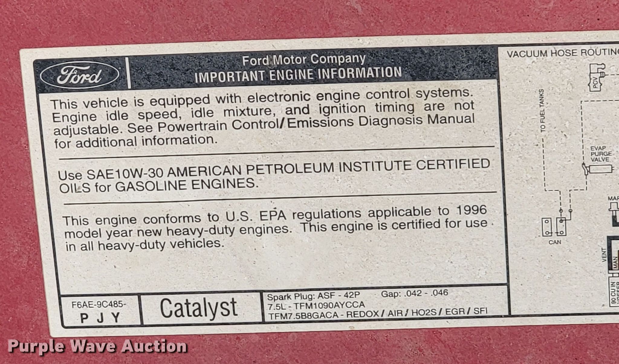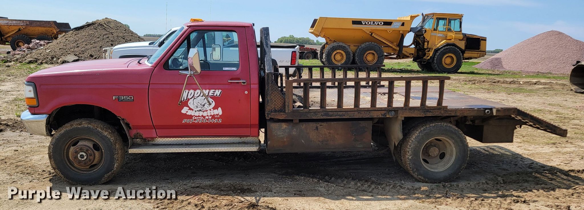 1996 Ford F350 XL flatbed pickup truck. Miles: 180,730 on odometer, VIN: 2FDKF38G2TCA42642. Engine Displacement: 7.5L V8 OHV, Cylinders: 8, Fuel type: Gas. Transmission Automatic, Four wheel drive. Interior Heat. Features Flatbed 12' 3" L x 84" W, Hitch: Gooseneck. Tires Size: LT235/85R16. Minnesota title. Title distribution may be delayed up to 14 days from verification of funds. Nooman Excavating. 2756 181st Street. Currie, MN 56123