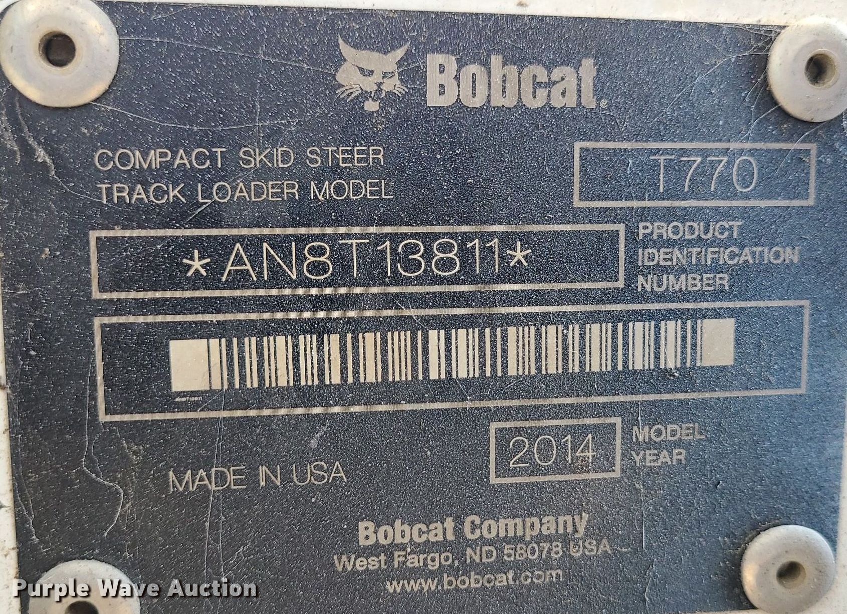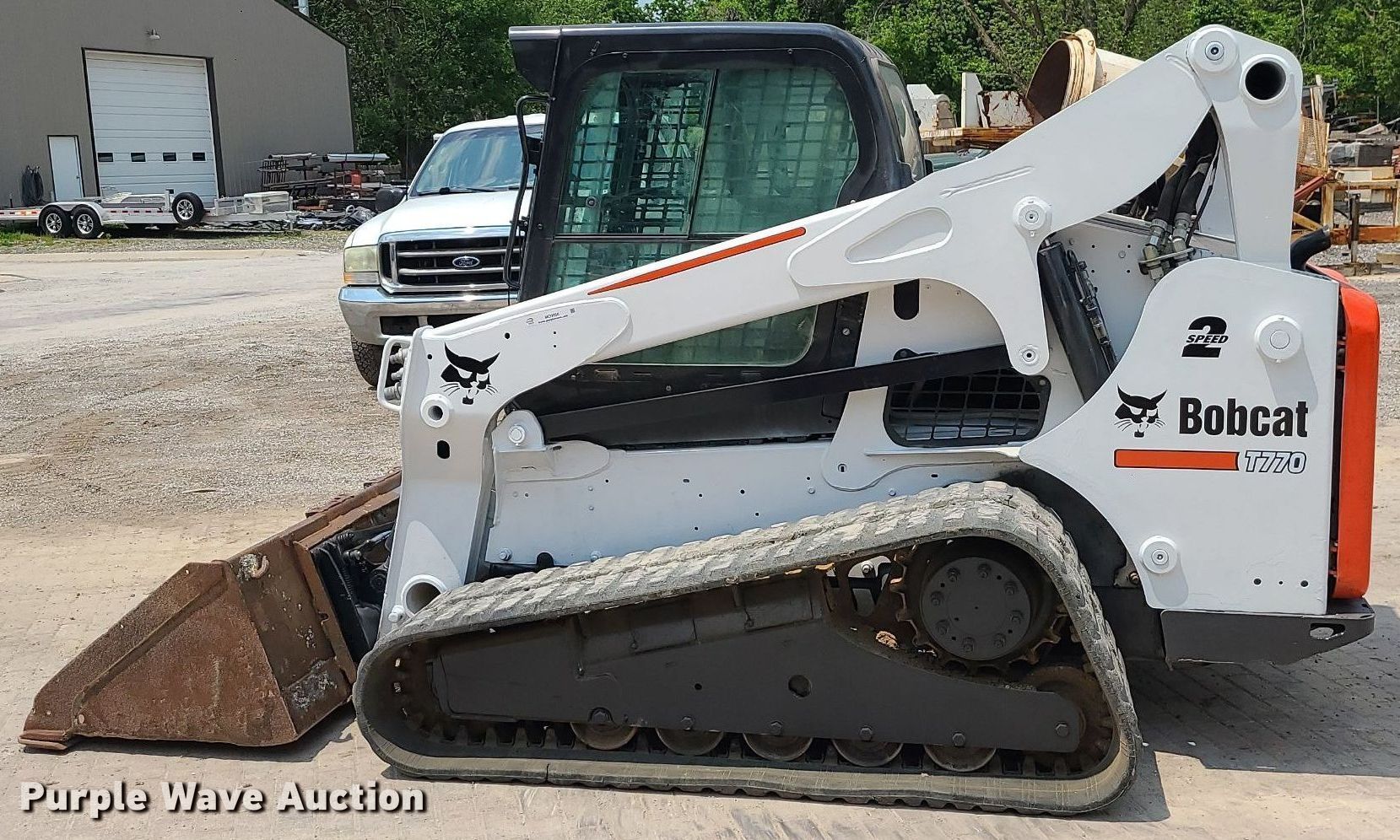 Purple Wave is selling a used Tracked Skid Steer Loader in Missouri. This item is a 2014 Bobcat T770 tracked skid steer loader with the following: Hours: 5,121 on meter, Serial: AN8T13811