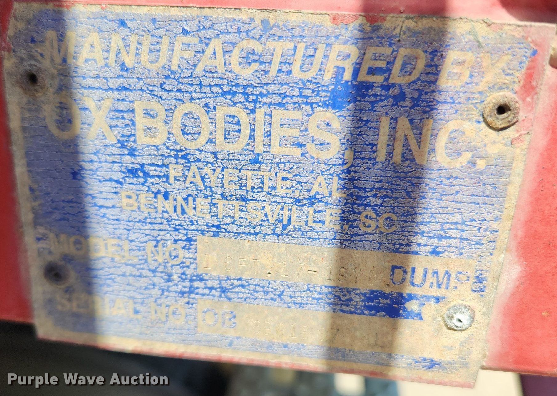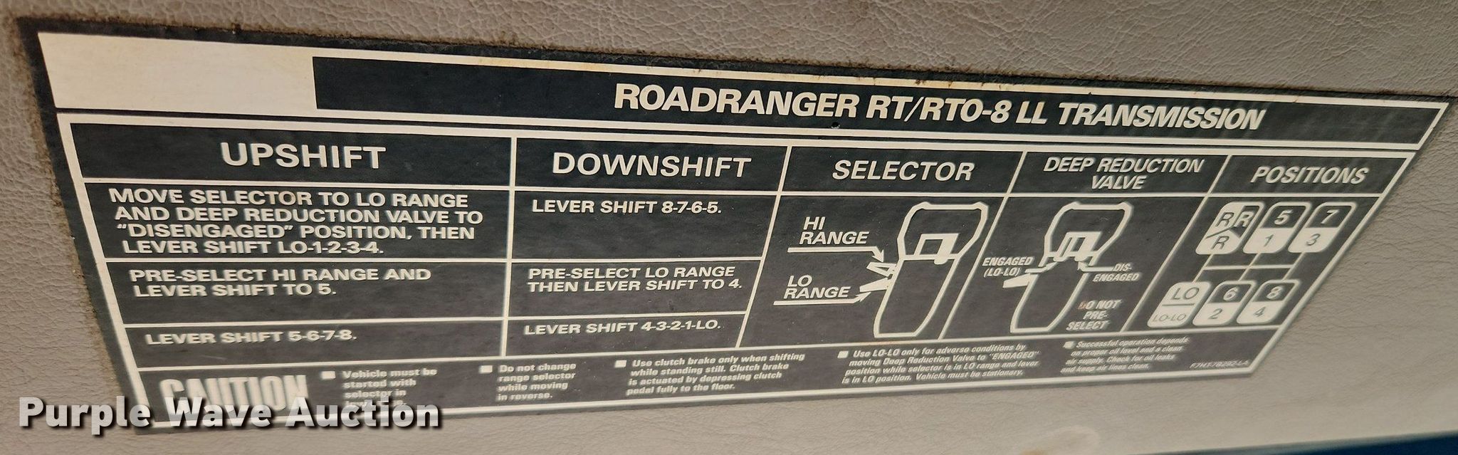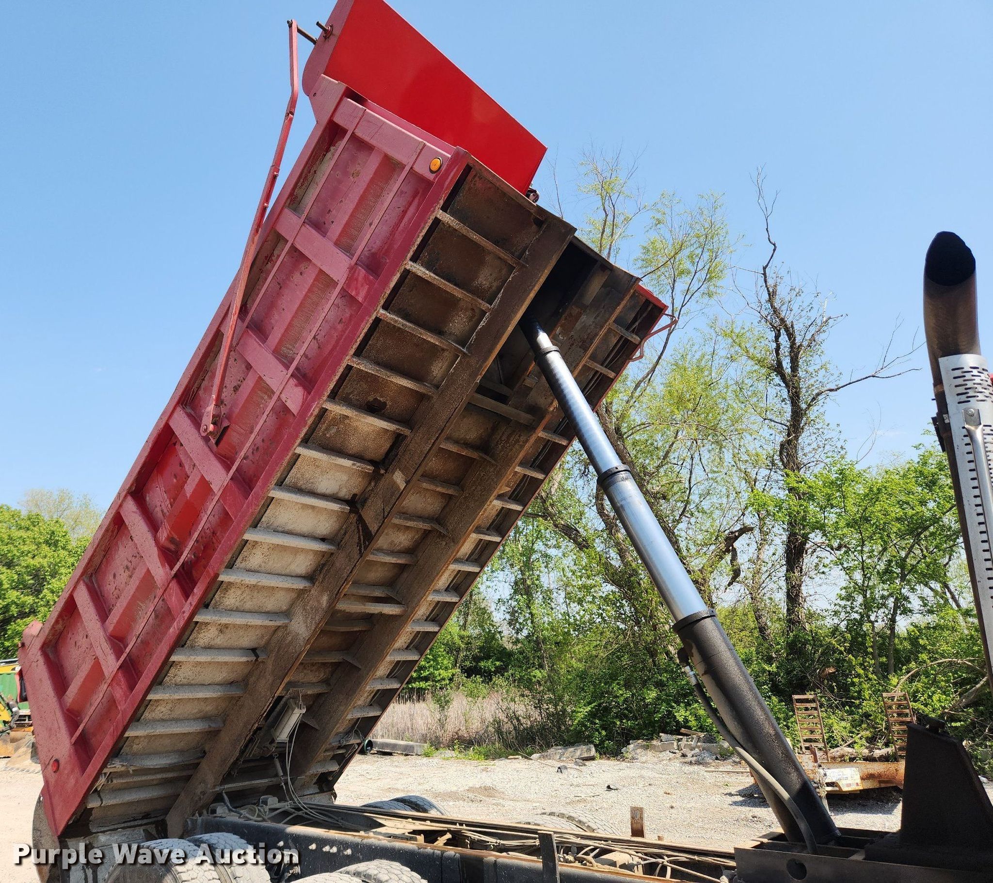 2000 Sterling L8513 dump truck. Miles: 207,868 on odometer, VIN: 2FZXMJBB6YAF13881. Engine Caterpillar 3126, Displacement: 7.2L, Cylinders: 6, Fuel type: Diesel. Transmission Eaton Fuller Roadranger RT/RTO-8LL, Manual, Speed: 10. Chassis Double frame, Axles: Tandem, Differential lock: Full, Suspension: Spring over walking beam, Brakes: Air, PTO, GVWR: 56,000 lbs FAWR: 16,000 lbs, IAWR: 20,000 lbs, RAWR: 20,000 lbs, Wheelbase: 198". Interior AC, Heat, Cruise control, Brake controller. Features Dump bed Ox Bodies, 16' L x 96" W, Side height: 51", Bed type: Steel, Roll tarp, Ram: Single , End gate: Air operated. Tires Front: 385/65R22.5, Rear: 11R22.5. Missouri title. Title distribution may be delayed up to 30 days from verification of funds. Keeley Construction. Cahokia, IL 62206