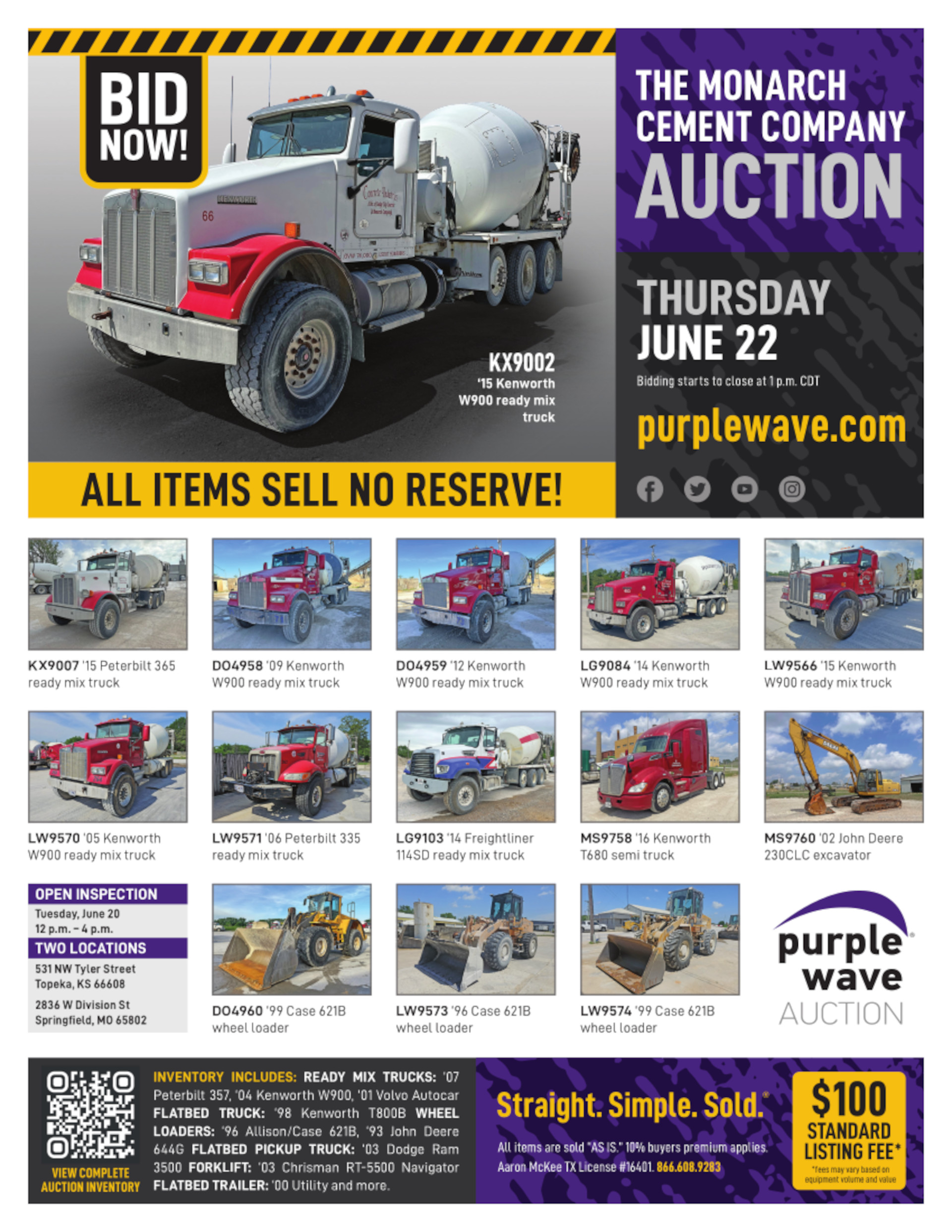 Terms, conditions, explanations and information in addition to those listed on this page are found in the Terms and Conditions section of this site and on the individual listing pages for all assets included in this auction. All terms, conditions, explanations and information are intended to be supplemental and complementary to each other. They are incorporated by reference into this page, and collectively they govern this auction. In the event of a conflict or inconsistency among terms, conditions, explanations or information in the Terms and Conditions section, the individual listing pages for assets and/or this page, the individual listing pages shall control this page and the Terms and Conditions section, and this page shall control the Terms and Conditions section. By registering to bid live and/or on the internet, you agree to abide by all terms and conditions and you acknowledge receipt of all explanations and information made available by Purple Wave.