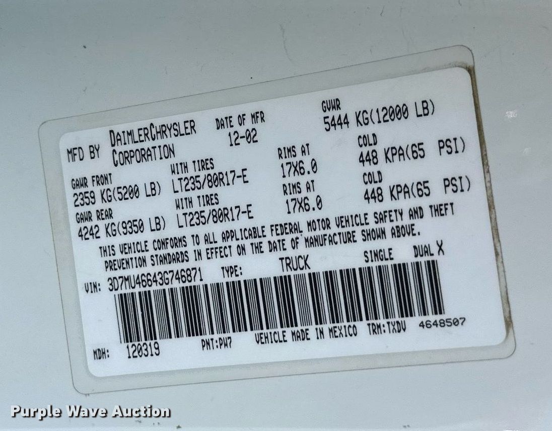 Purple Wave is selling a used 3/4 or 1 Ton Pickup or Van in Kansas. This item is a 2003 Dodge Ram 3500 flatbed pickup truck with the following: Miles: 71,991 on odometer, VIN: 3D7MU46643G746871