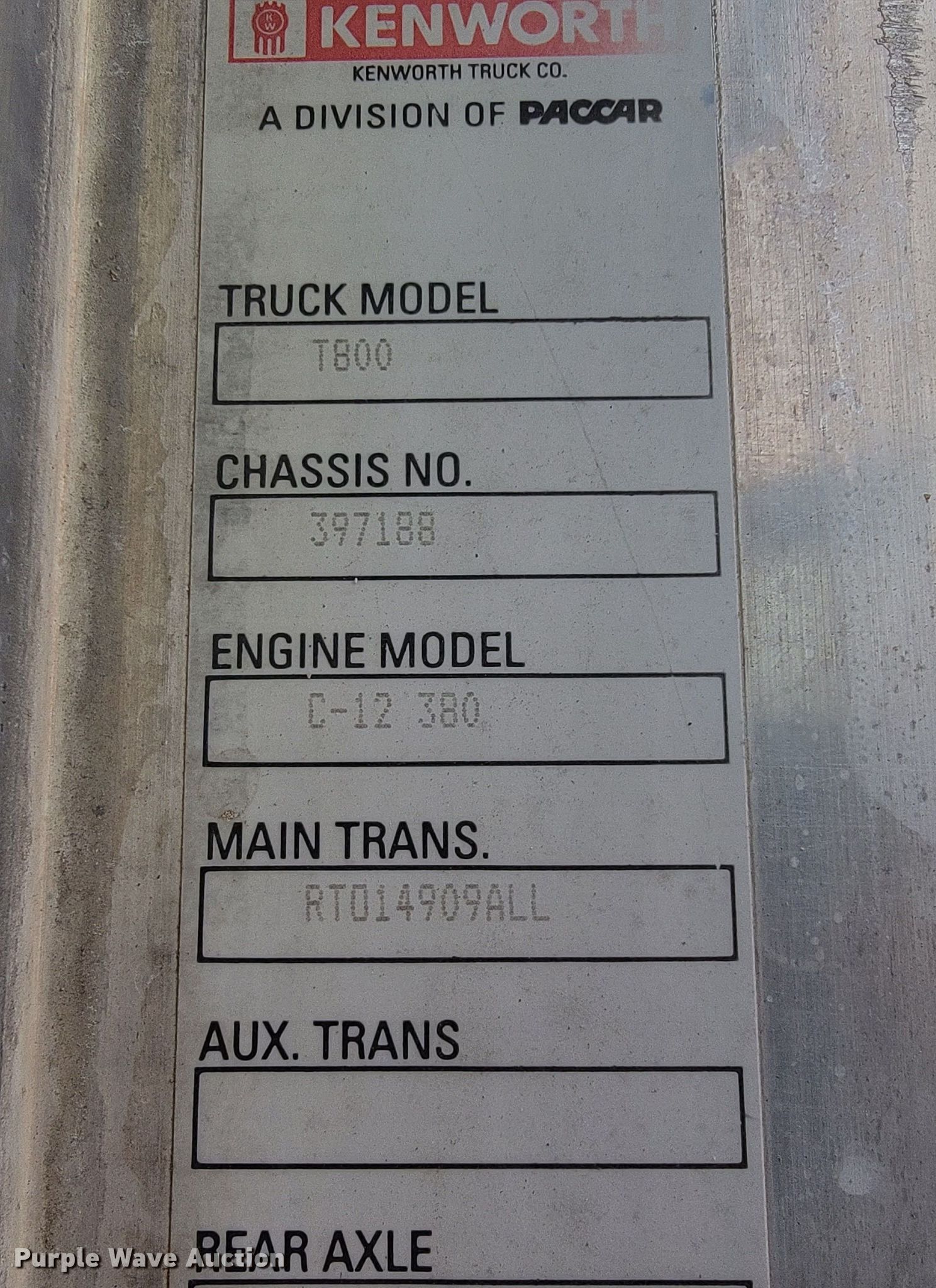 2004 Kenworth T800 ready mix truck. Hours: 26,799 on meter, Miles: Unknown, VIN: 1NKDXUEX84J397188. Engine Caterpillar C12, Cylinders: 6, Fuel type: Diesel. Transmission Eaton Fuller, Manual, Speed: 11. Chassis Axles: Triple, Tag axle, Differential lock: Inter-axle, Suspension: Spring over walking beam, Brakes: Air, PTO, Wheelbase: 209". Interior AC, Heat, Heated mirrors, Cruise control. Features Mixer Capacity: 10.5 cu.yd., Discharge: Rear, Bins: Aggregate, In-cab controls, Rear drum controls, Water tank capacity: 150 gallons, Chute Extensions: 3, Chute type: Aluminum.. Tires Front: 425/65R22.5, Rear: 11R22.5. Notes Windshield chipped or cracked, No batteries, Unit has been vandalized, Unknown operating condition. Arkansas title. Title distribution may be delayed up to 14 days from verification of funds. 2425 Old Wire Rd. Springdale, AR 72764