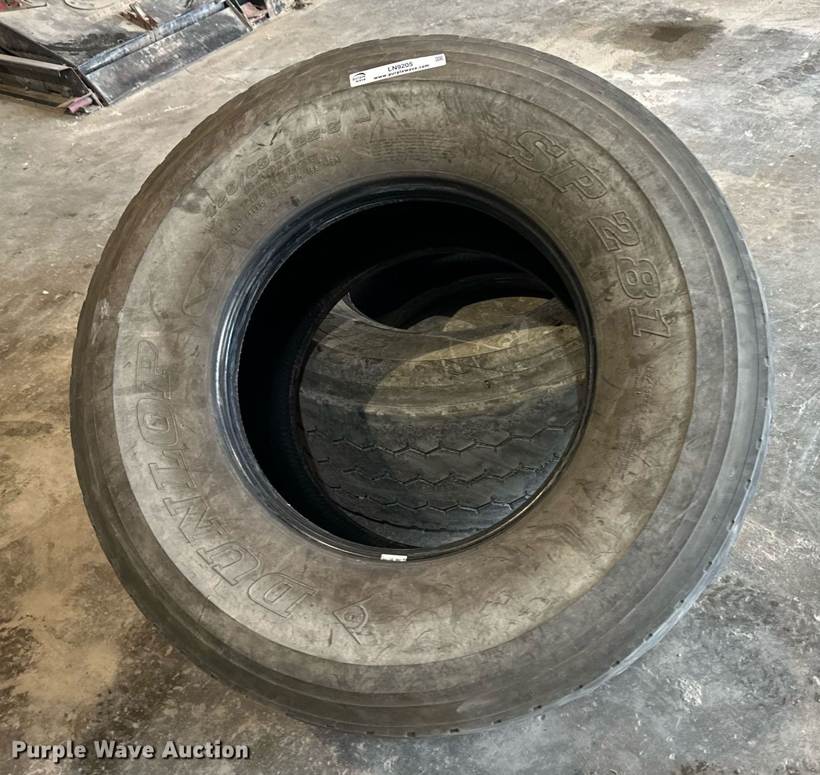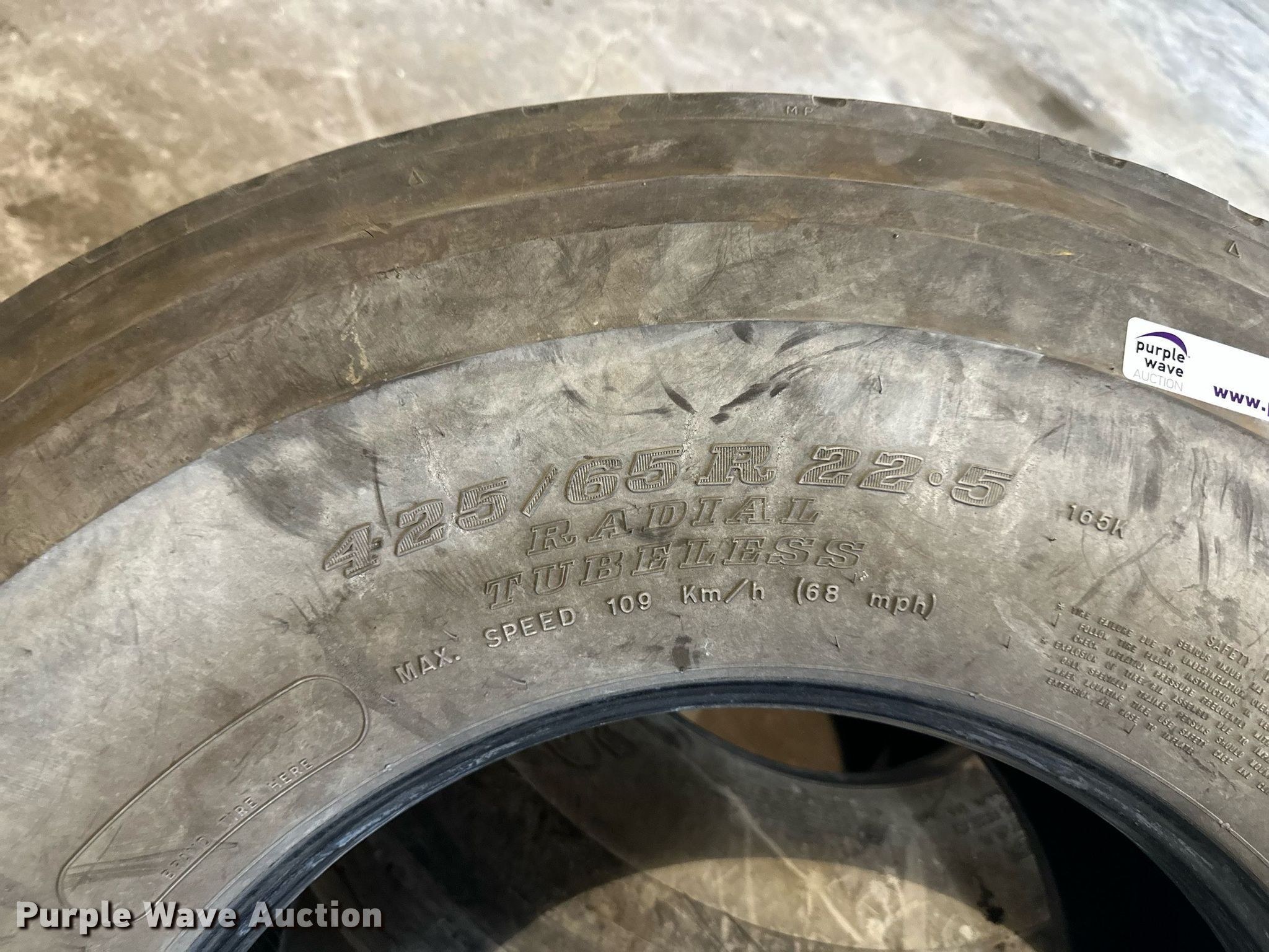 Purple Wave is selling a used Fleet Tires in Kansas. This item is a (2) Dunlop 425/65R22.5 tires with the following: (2) Dunlop 425/65R22.5 tires. The Monarch Cement Company (Kansas Sand & Concrete) - Open inspection June 20. Topeka, KS 66616