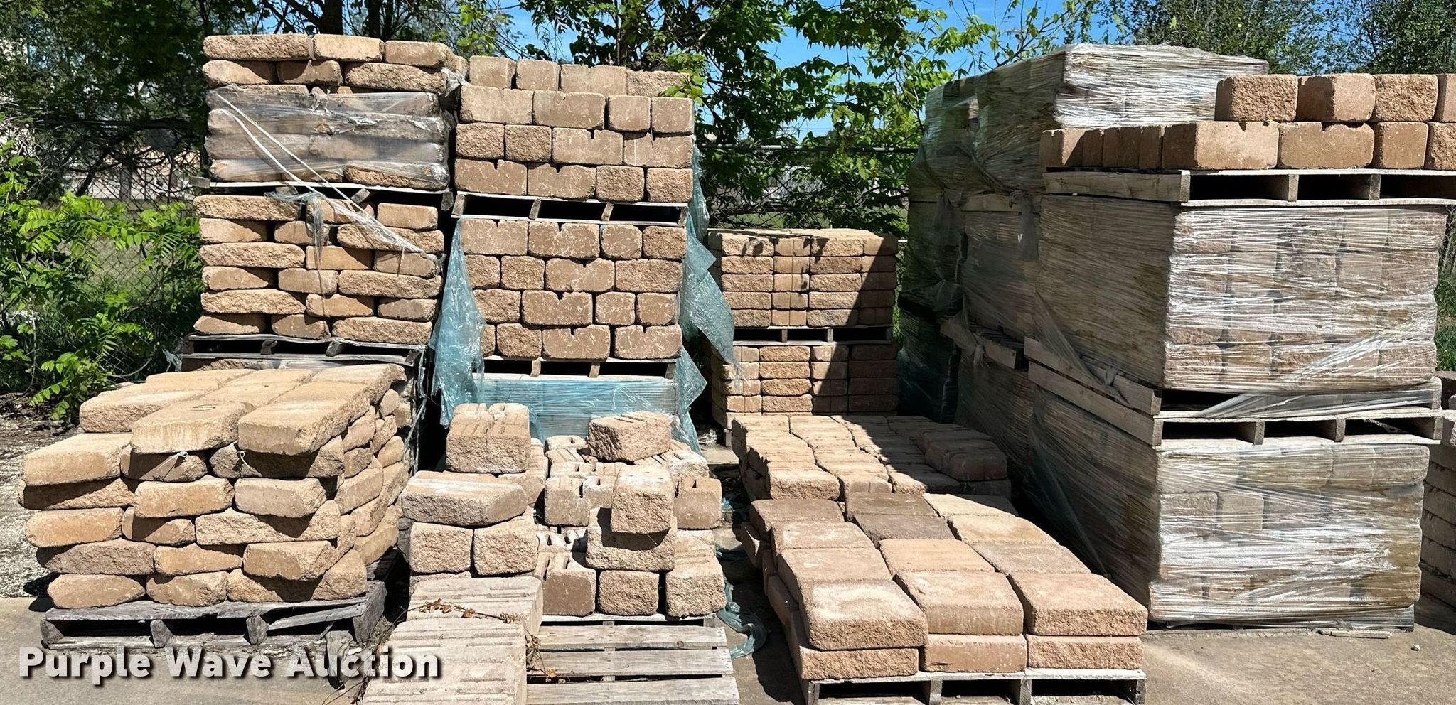 Purple Wave is selling a used Building Materials in Kansas. This item is a (1,922) tumbled concrete pavers with the following: (72) Pyzique, (419) universal cap, (4) Versa Lok, (22) Versa Lok "A" cap, (194) Versa Lok accent, (697) Versa Lok cobble, (514) Versa Lok halves, Color: Tan