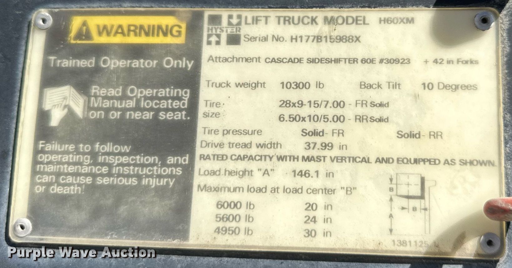 Purple Wave is selling a used Cushion Tire or Pneumatic Forklift in Kansas. This item is a Hyster H60XM forklift with the following: Hours: Unknown, Serial: H177B15988X