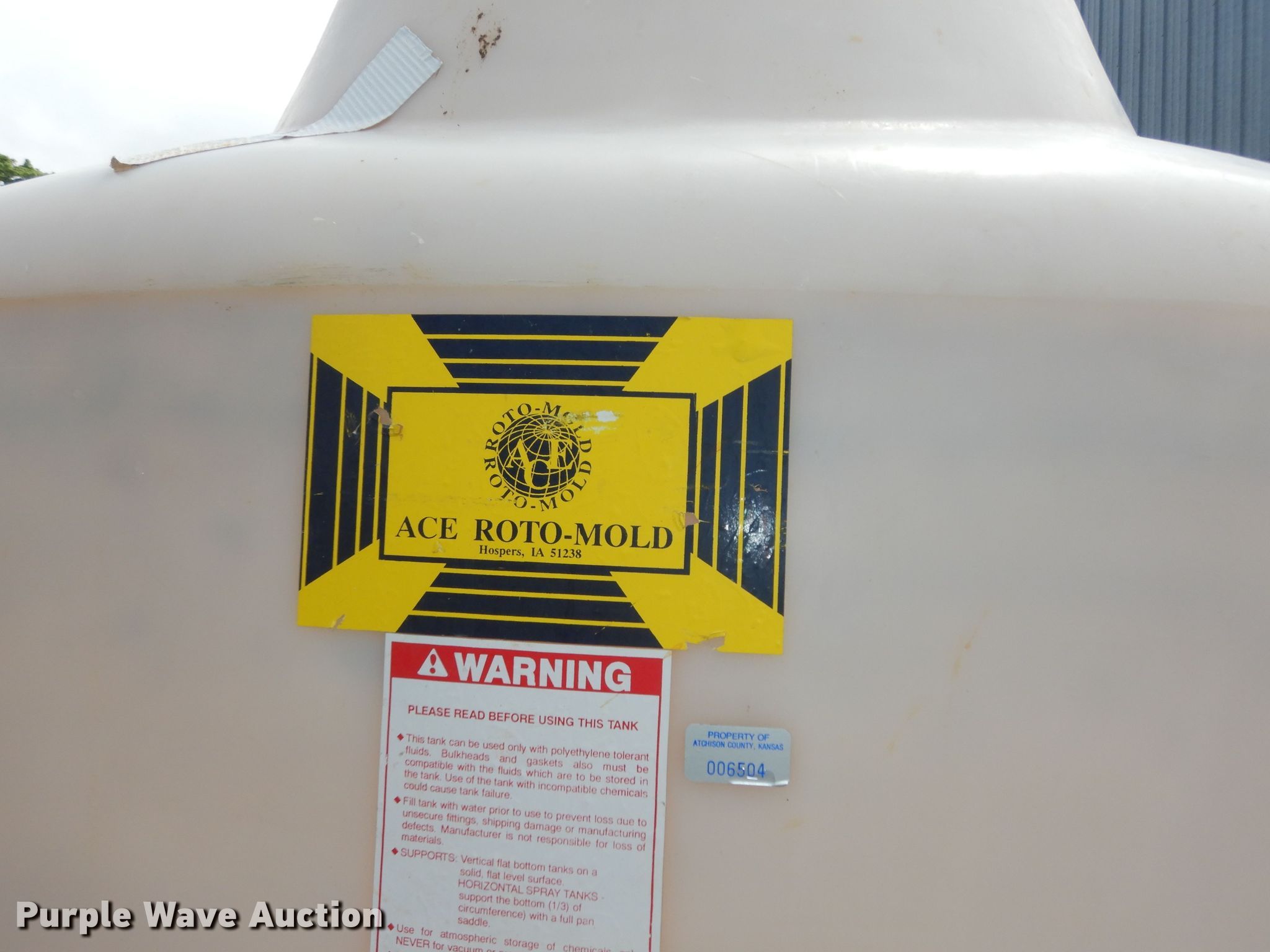Purple Wave is selling a used Tanks in Kansas. This item is a 1,000 gallon poly tank with the following: 1,000 gallon poly tank. Atchison, KS 66002