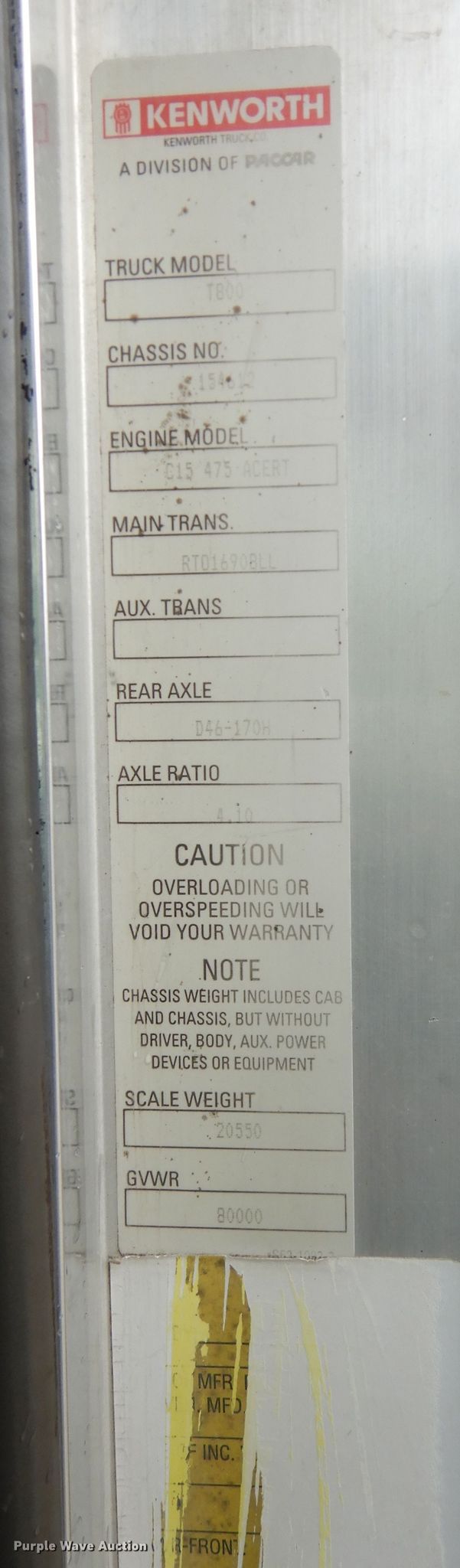 2006 Kenworth T800 dump truck. Miles: 423,052 on odometer, Hours: 18,276 on meter, VIN: 1NKDXBEX96J154612. Engine Caterpillar C15, Displacement: 14.6L, Cylinders: 6, Fuel type: Diesel. Transmission Eaton Fuller , Manual, Speed: 10. Chassis Axles: Tandem, Gear ratio: 4.10, Tag axle, Suspension: Spring over walking beam, Brakes: Air, GVWR: 80,000 lbs FAWR: 20,000 lbs, IAWR: 20,000 lbs, RAWR: 23,000 lbs, Lift axle GAWR: 20,000 lbs, Wheelbase: 228". Interior AC, Heat, Cruise control. Features Dump bed Heil, Capacity: 22 cu.yd., 17' L x 8' W, Side height: 64", Bed type: Steel, Ram: Single. Tires Front: 425/65R22.5, Rear: 11R24.5, Lift axle: 425/65R22.5. Notes Roll tarp works intermittenly , Dash warning indicator: ABS. Kansas title. Atchison, KS 66002