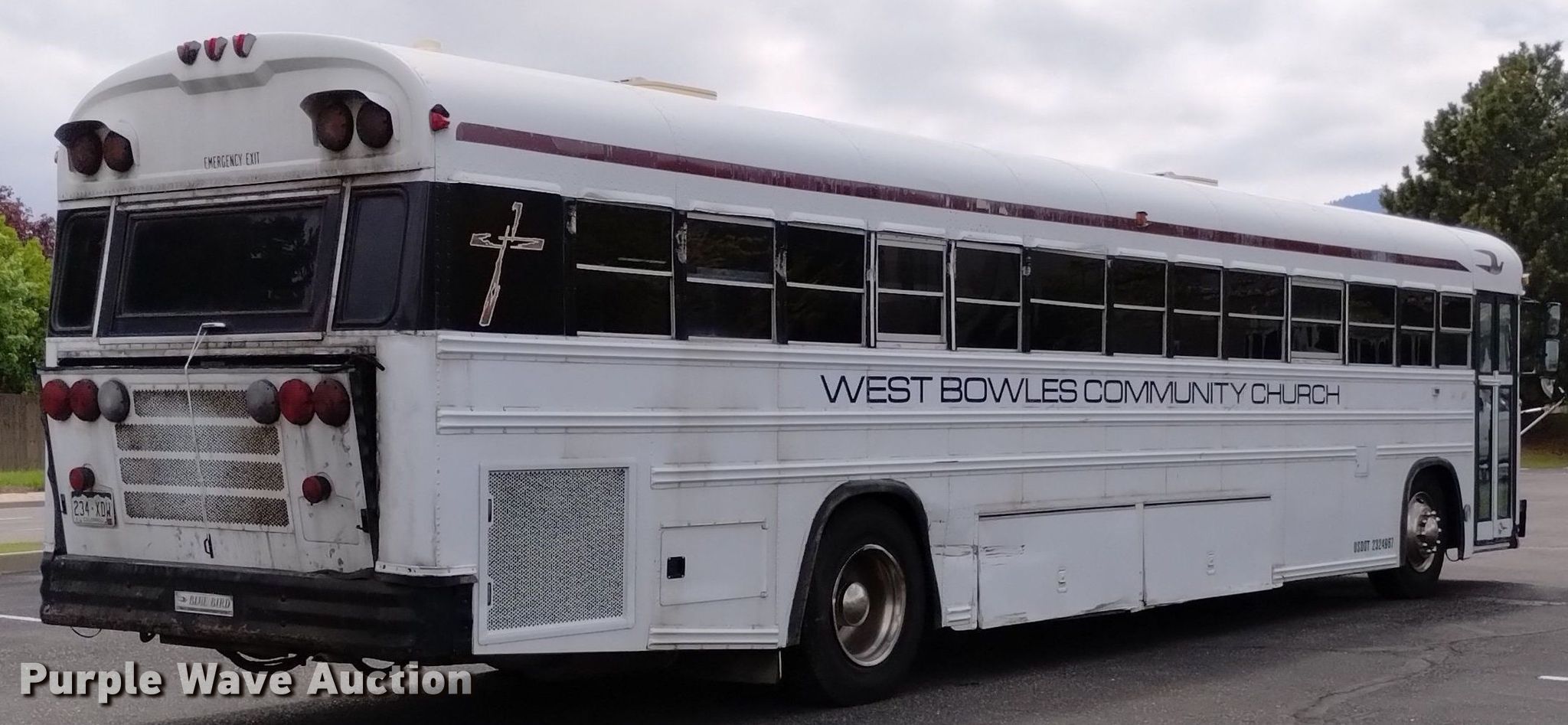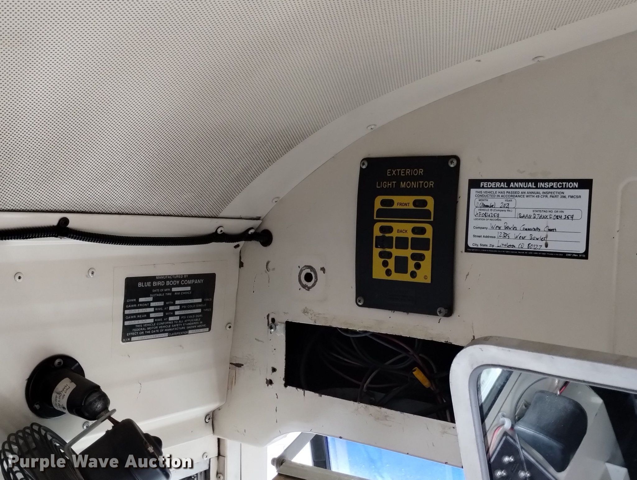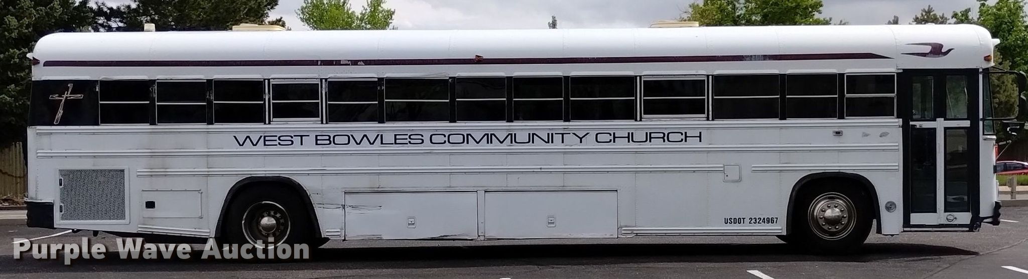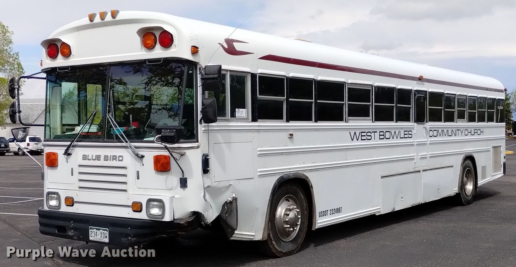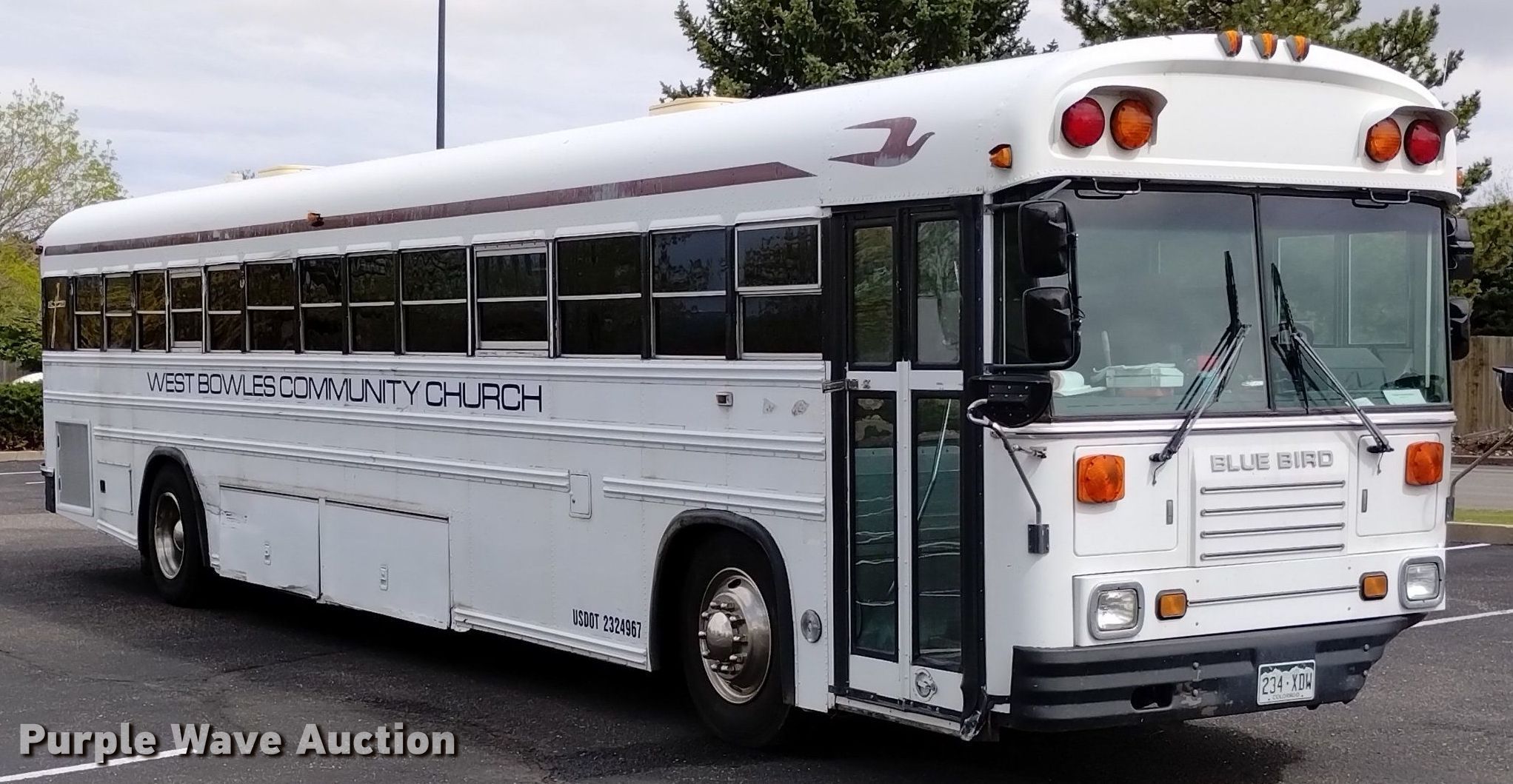 1999 Blue Bird school bus. Miles: 218,677 on odometer, VIN: 1BAANB7AXXF084359. Engine Cummins , Displacement: 8.3L, Cylinders: 6, Fuel type: Diesel. Transmission Automatic. Chassis Axles: Single, Suspension: Air, Brakes: Air. Interior Heat, Electric passenger sliding door, Passengers: 46, Adult seats: 46. Tires Size: 11R22.5. Notes Dead battery, Electric issues, will only start from rear ignition , Fuel pump issues, needs replaced, Rear engine door brackets need replaced. Colorado title. West Bowles Community Church. 12325 West Bowles Avenue. Littleton, CO 80127