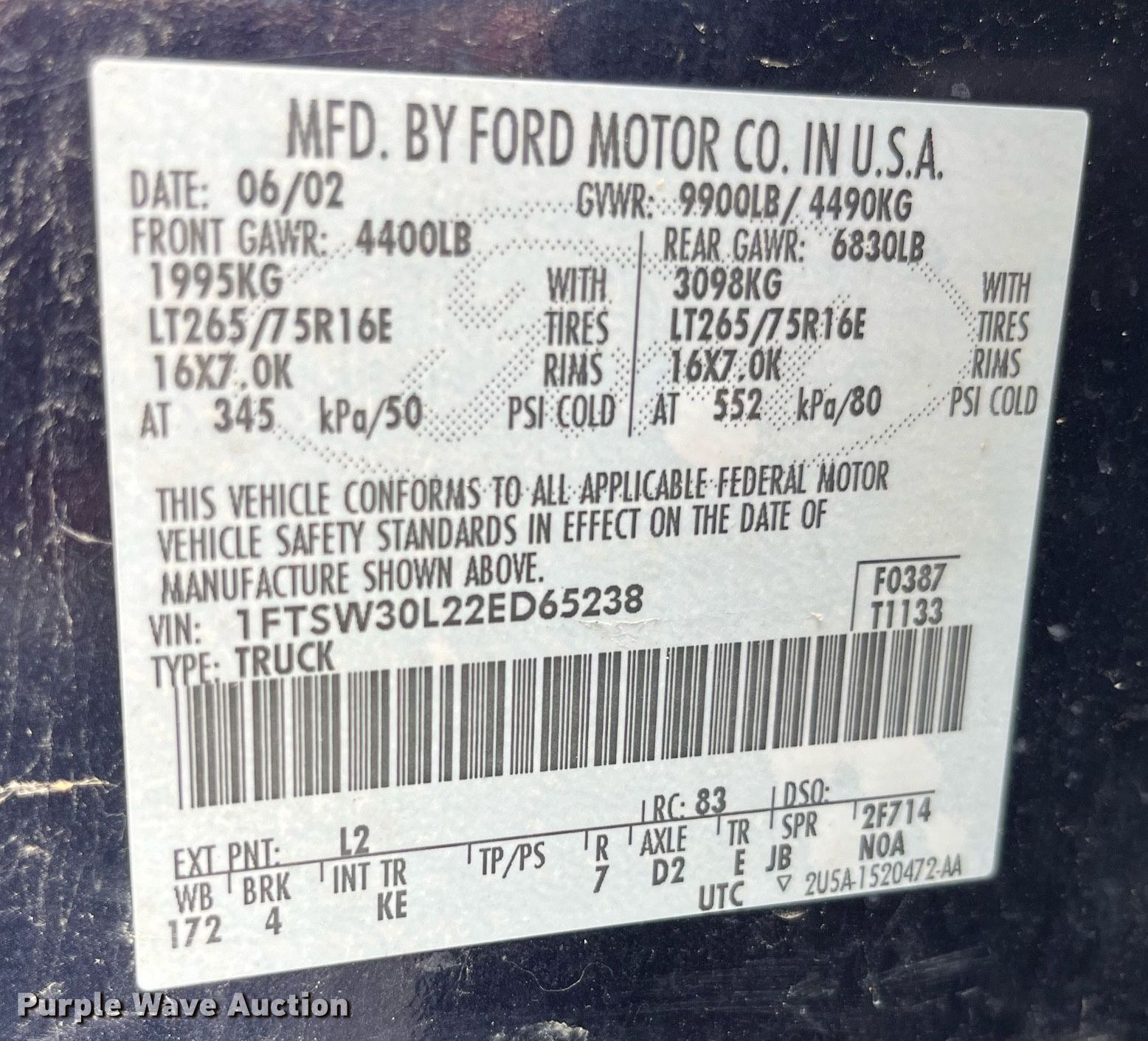 Purple Wave is selling a used 3/4 or 1 Ton Pickup or Van in Missouri. This item is a 2002 Ford F350 Super Duty XL Crew Cab pickup truck with the following: Miles: 118,704 on odometer, Miles or hours may vary, unit still in use, VIN: 1FTSW30L22ED65238