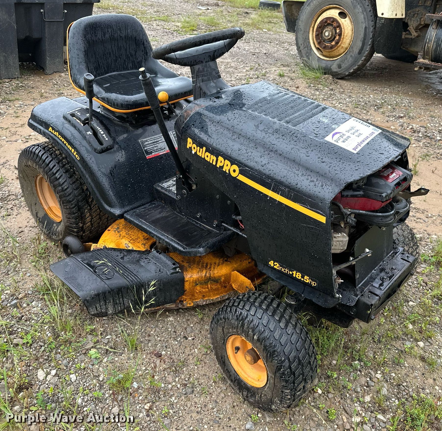 Purple Wave is selling a used Lawn Mower in Oklahoma. This item is a Poulan Pro lawn mower with the following: Hours: Unknown, Cutting width: 42", Serial: 032901D001789