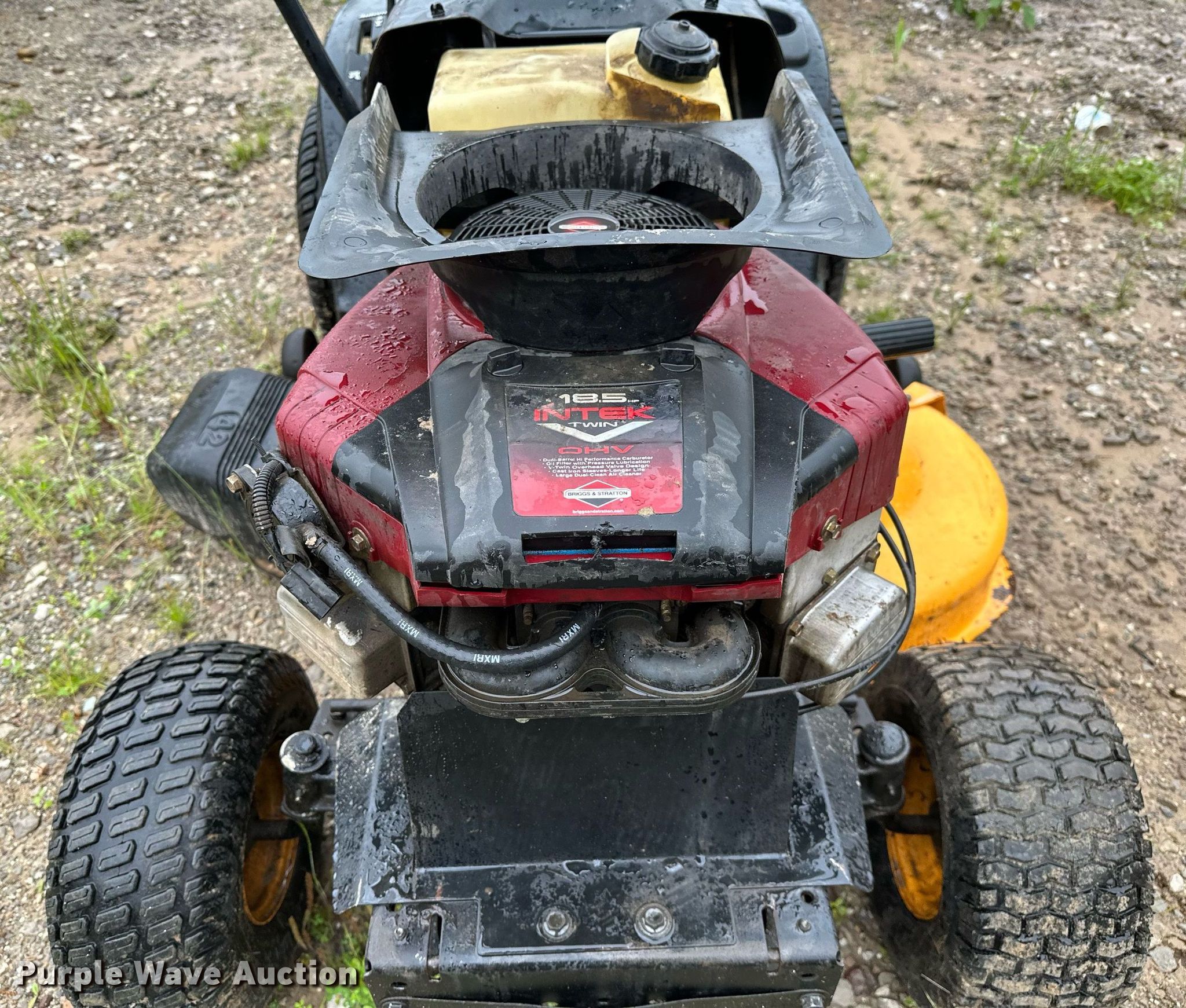 Poulan Pro lawn mower. Hours: Unknown, Cutting width: 42", Serial: 032901D001789. Engine Briggs & Stratton Intek Twin, Cylinders: 2, Fuel type: Gas, HP: 18.5. Transmission Hydrostatic. Tires Front: 15X6-6, Rear: 20X10-8. Notes Dead battery, Unknown operating condition. Okfuskee County. 704 E 7th St. Weleetka, OK 74880