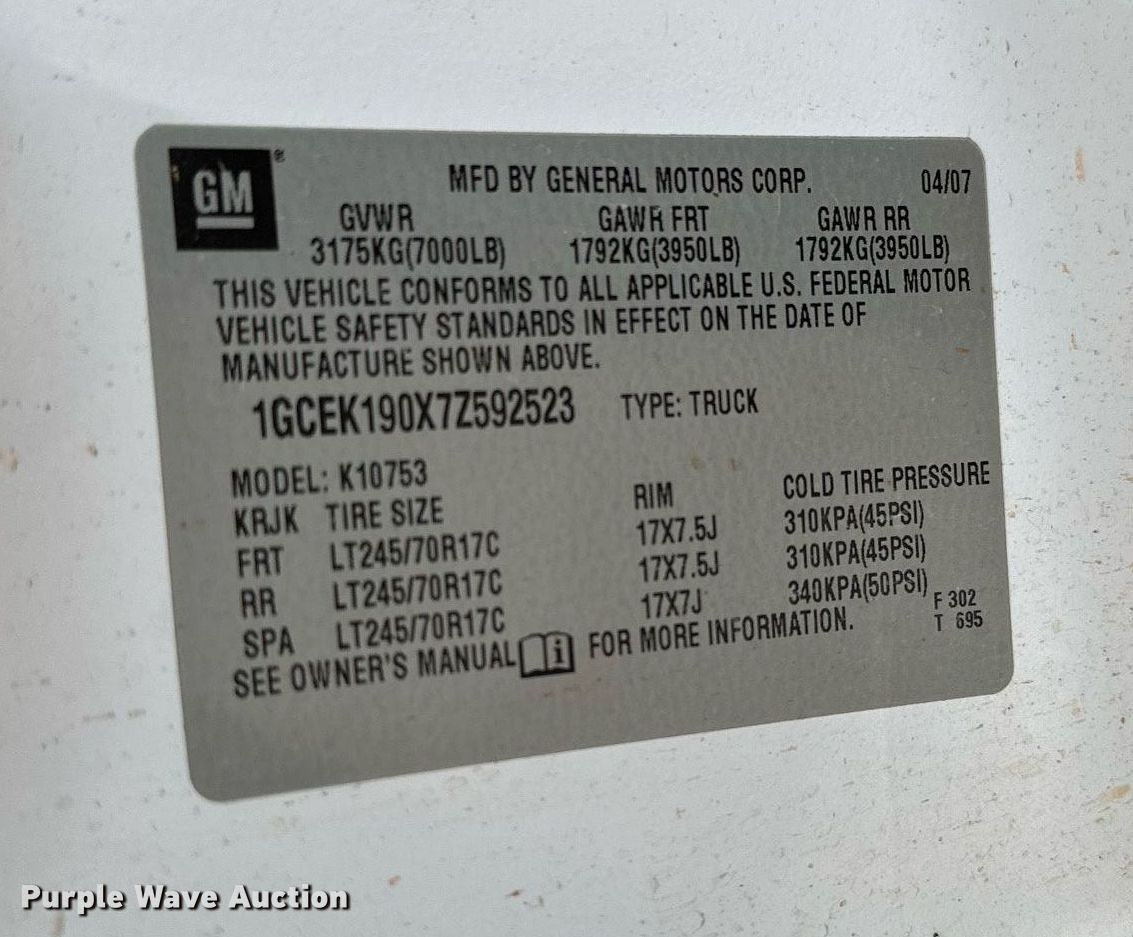 Purple Wave is selling a used 1/2 Ton Pickup or Van in Oklahoma. This item is a 2007 Chevrolet Silverado 1500 Ext. Cab pickup truck with the following: Miles: 253,936 on odometer, VIN: 1GCEK190X7Z592523