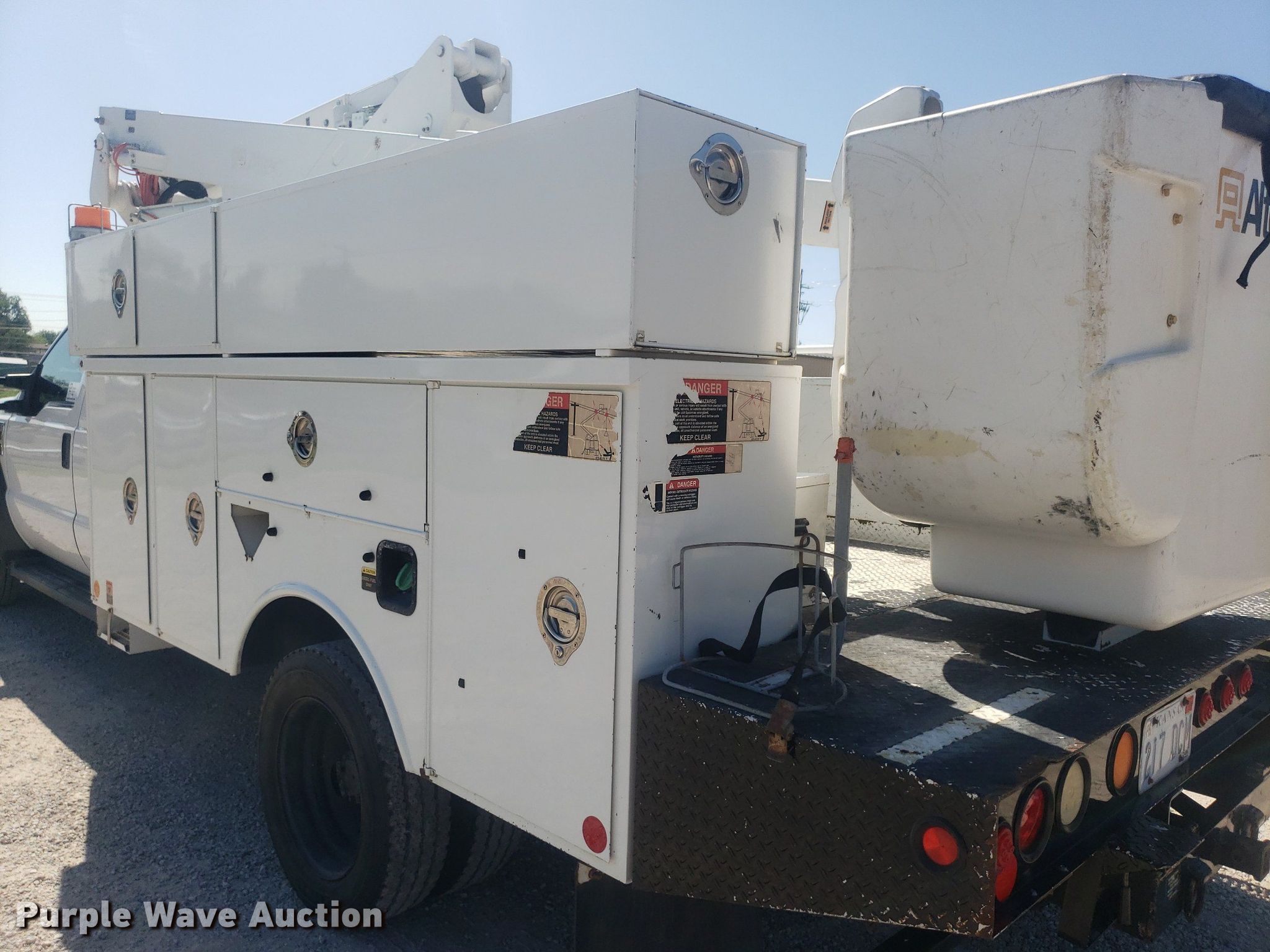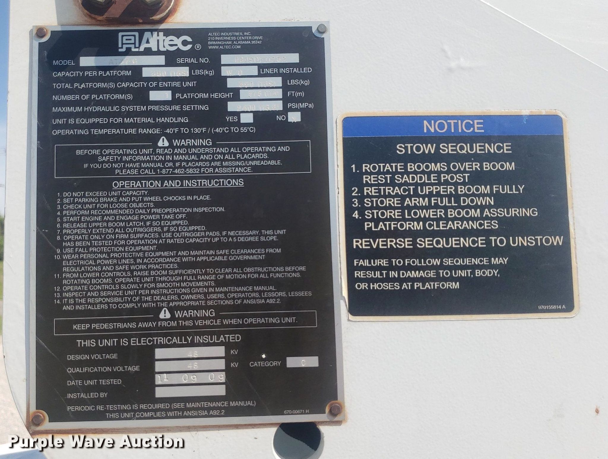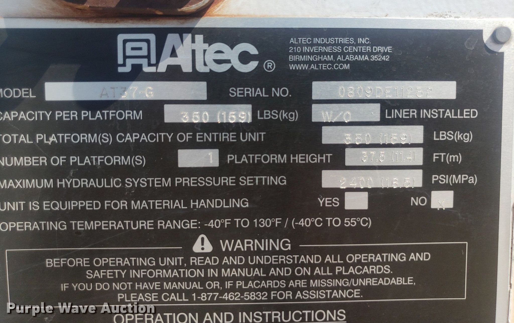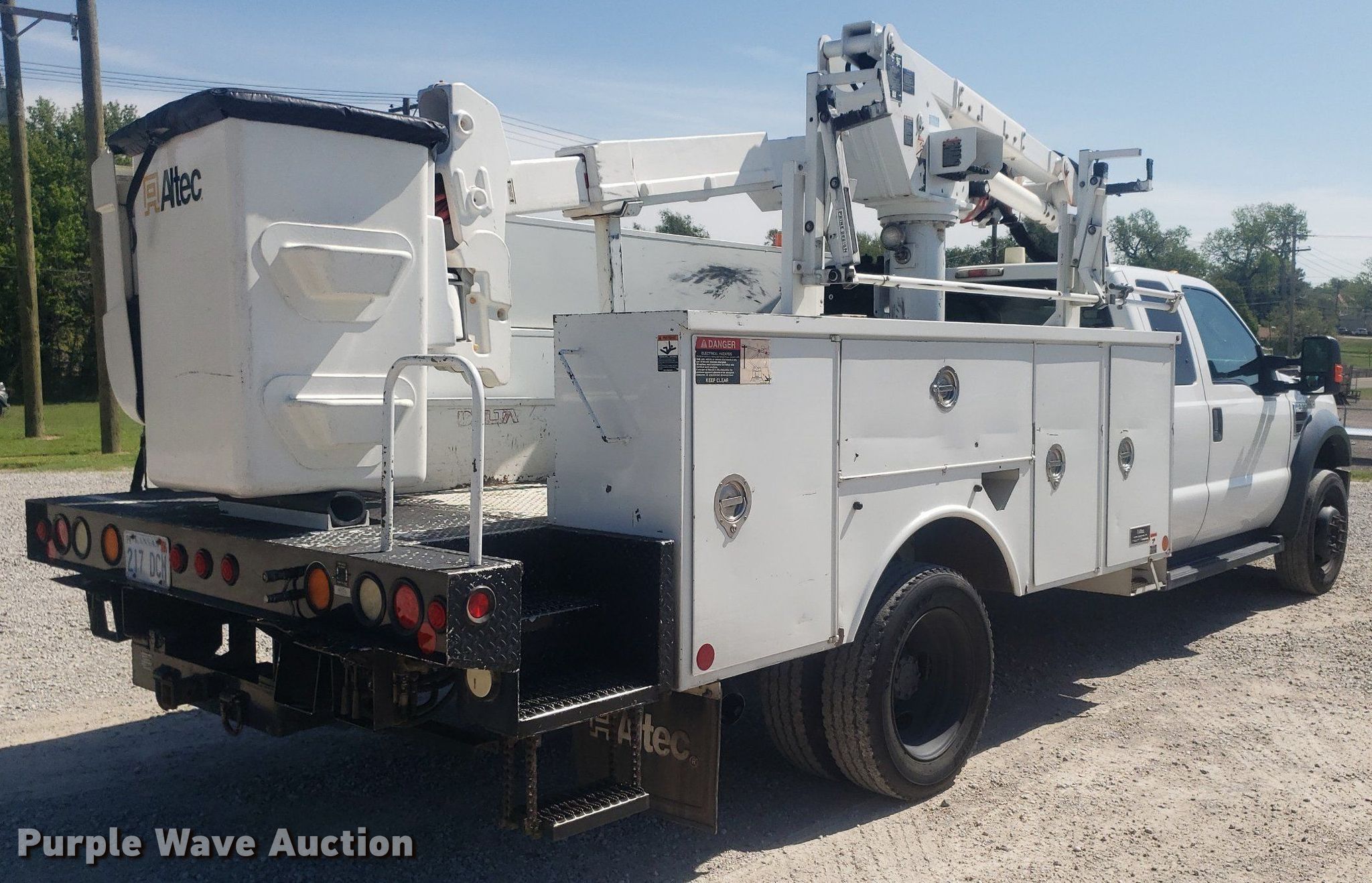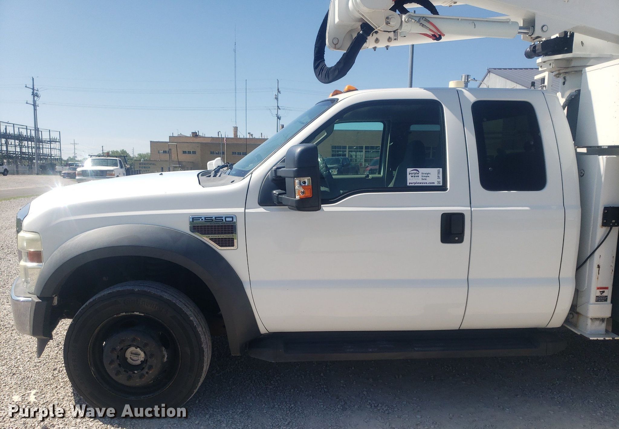 2009 Ford F550 Super Duty SuperCab bucket truck. Miles: 85,811 on odometer, VIN: 1FDAX57RX9EB25763. Engine Displacement: 6.4L, Cylinders: 8, Fuel type: Diesel. Transmission Automatic. Chassis Four wheel drive, Axles: Single, Suspension: Spring, Brakes: Hydraulic, PTO, GVWR: 19,500 lbs. Interior AC, Heat, Heated mirrors, Power windows, Power locks, Cruise control, Auxiliary controls, Brake controller. Features Bed 12' 10" L x 94" W, Boom Altec AT37-G, Serial: 0809DE11232, Maximum lift capacity: 350 lbs, Maximum lift height: 42', Boom type: Articulating, Insulated, Telescopic, Man basket, Boom controls Ground, Platform/ basket.. Tires Size: 225/70R19.5. Notes EGR deleted, DEF deleted. Kansas title. Title distribution may be delayed up to 14 days from verification of funds. City of Pratt, KS. Pratt, KS 67124