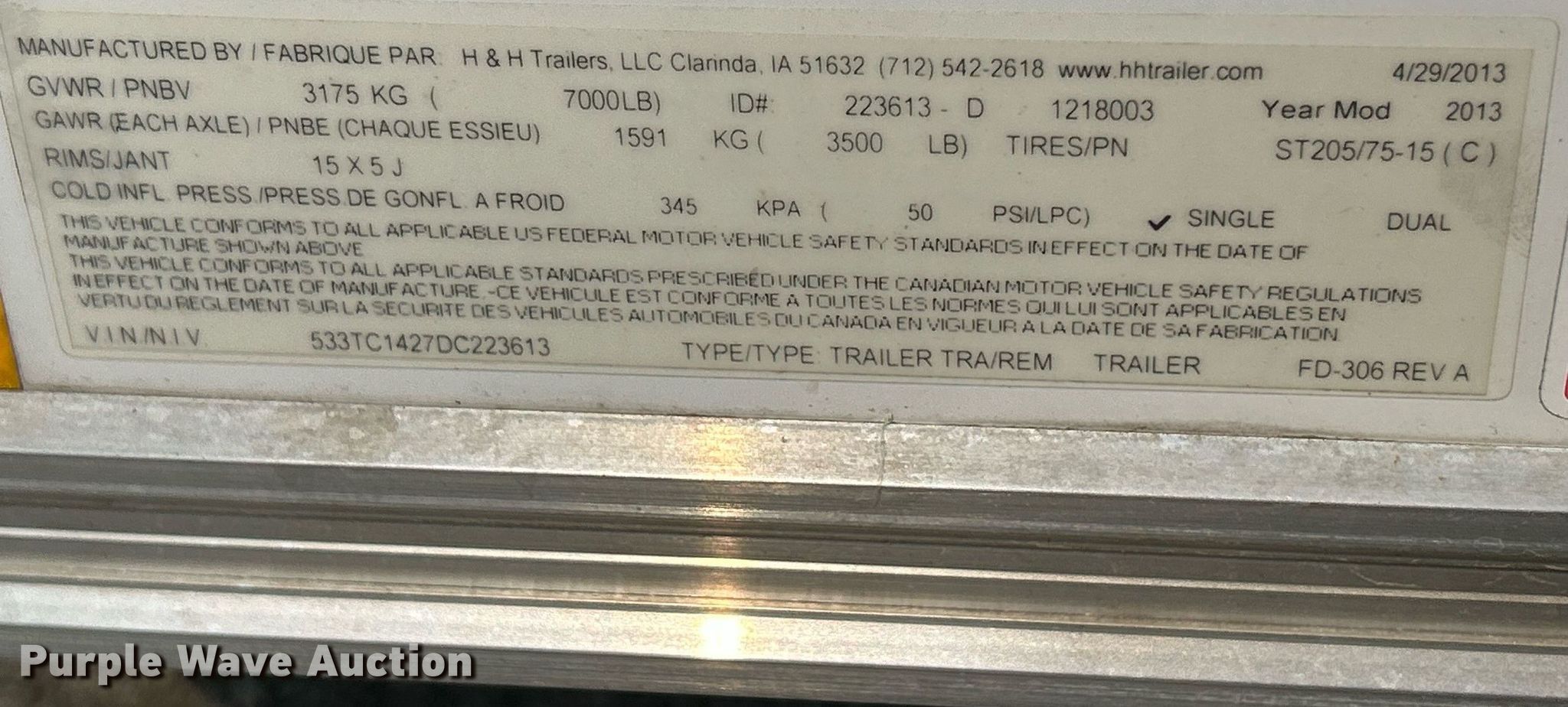 Purple Wave is selling a used Enclosed Cargo Trailer in Iowa. This item is a 2013 H&H CA Series enclosed cargo trailer with the following: VIN: 533TC1427DC223613