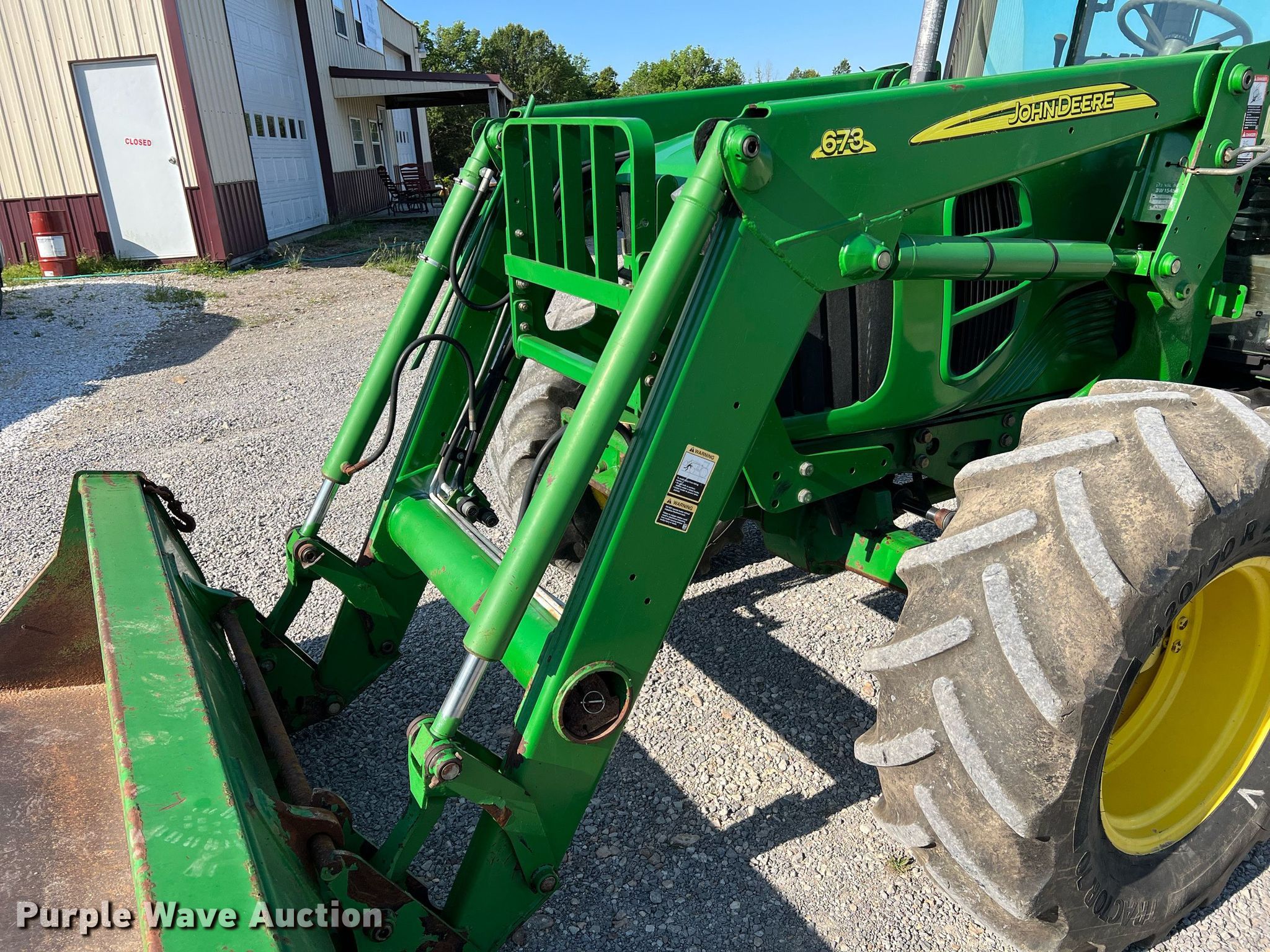 2009 John Deere 6430 MFWD tractor. Hours: Unknown, Serial: L06430A615508, Unit #: 06242. Engine John Deere 4045HL283, Cylinders: 4, Fuel type: Diesel. Transmission Synchro, 12F - 4R, Differential lock. Operators station AC, Heat. Features PTO: 540, Three point Top link, Seven pin outlet, Hydraulic remote sets Front: 1, Rear: 3, Loader John Deere 673, Controls: Joystick, Bucket Width: 85".. Tires Front: 420/70R24, Rear: 460/85R34, Wheel weights: 2. Notes Non-operational hour meter, Exhaust leak, Missing three point arm. 8267 Old Highway 54. New Bloomfield, MO 65063