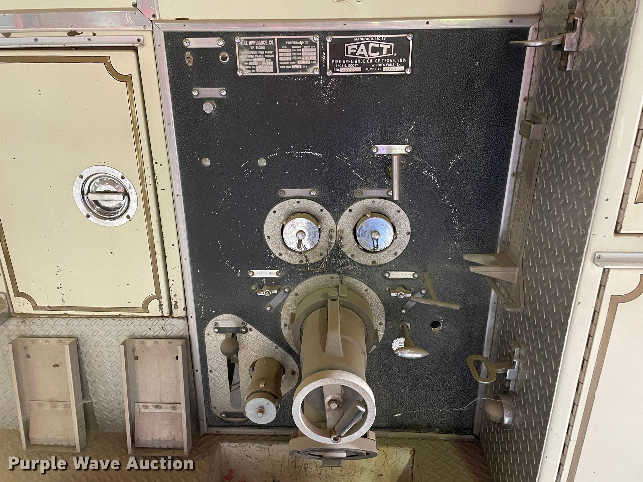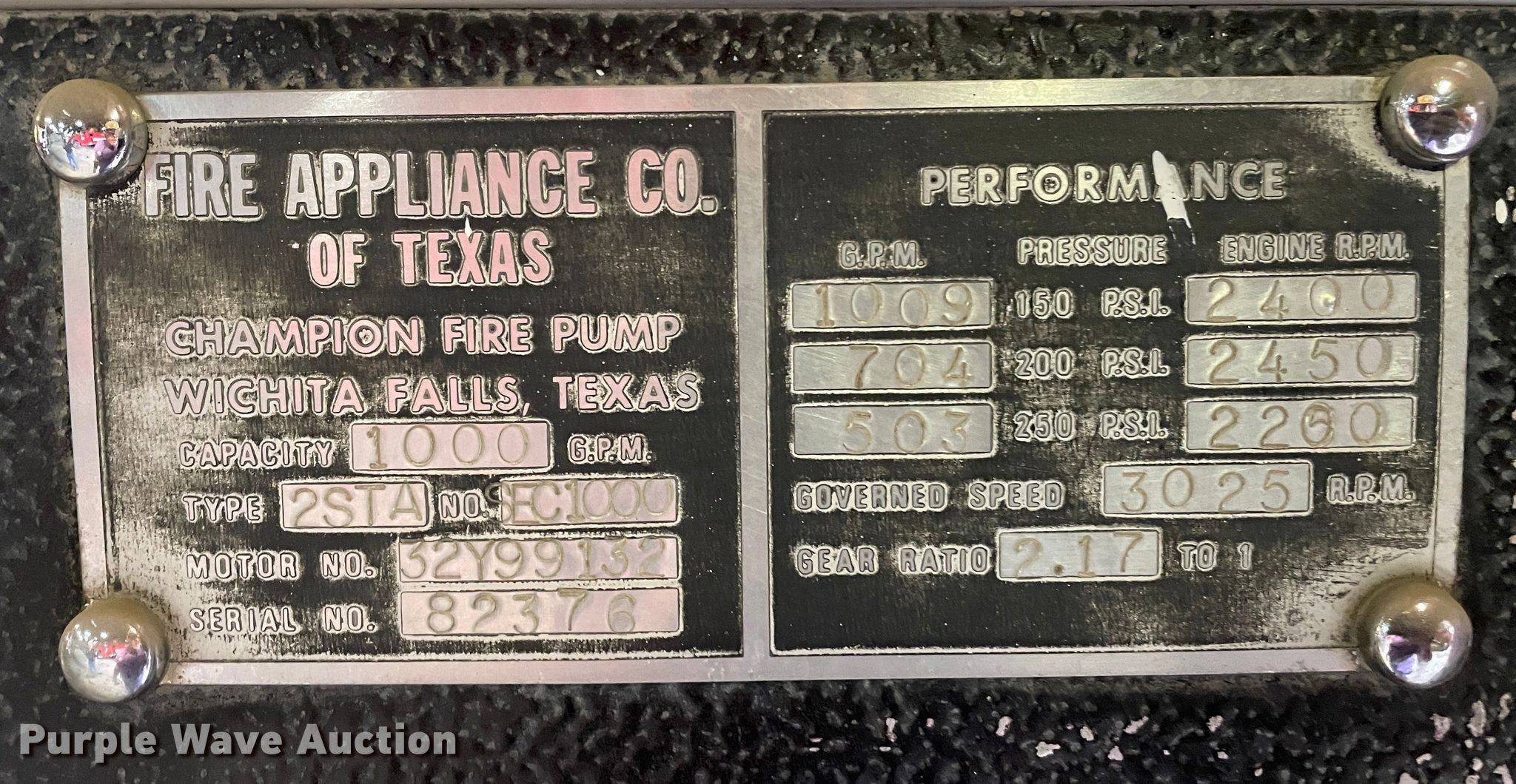 1982 Ford C8000 pumper fire truck. Miles: 57,419 on odometer, Hours: 6,140 on meter, VIN: 1FDXD80U7CVA43726. Engine Caterpillar 3208, Displacement: 10.4L, Cylinders: 8, Fuel type: Diesel, HP: 210. Transmission Manual, Speed: 5. Chassis Axles: Single, Suspension: Spring, Brakes: Air, GVWR: 32,000 lbs. Interior Heat. Features Fire truck body Pump 1,000 gpm.. Tires Size: 11.00R20. Notes Dead battery. Texas title. Title distribution may be delayed up to 30 days from verification of funds. City of Pampa, TX. 200 West Foster Avenue. Pampa, TX 79065