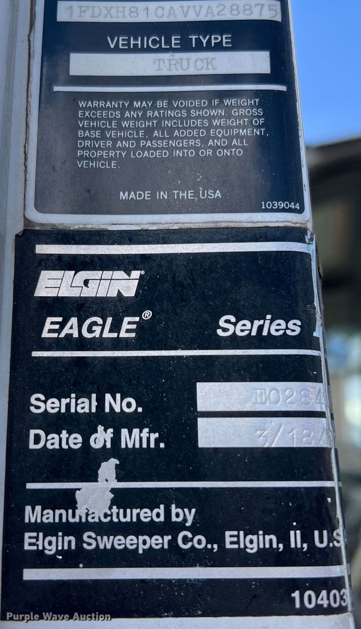 1997 Ford CF8000 street sweeper truck. Miles: 33,018 on odometer, Hours: 5,534 on meter, VIN: 1FDXH81C8VVA28875. Engine Displacement: 5.9L, Cylinders: 6, Fuel type: Diesel. Transmission Automatic. Chassis Suspension: Spring, Brakes: Air, GVWR: 32,000 lbs. Operators station Enclosed cab, AC, Heat, Dual operating station. Features Broom Width: 60", Water spray system, Sweeper bed Sweeper bed type: Vacuum Elgin Eagle, Left gutter broom Diameter: 30", Right gutter broom Diameter: 30", Engine Isuzu , Cylinders: 4. Tires Size: 11R22.5. Notes Windshield chipped or cracked, Non-operational passenger window, Passenger door issues, will not open from outside, Non-operational engine, Non-operational unit. Transfer of ownership documentation will be a bill of sale. City of Pampa, TX. 200 West Foster Avenue. Pampa, TX 79065