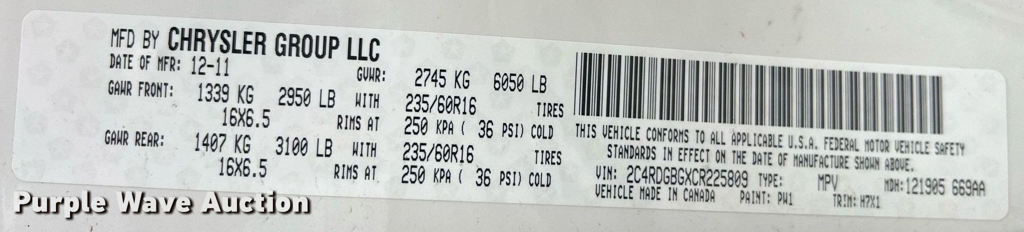 Purple Wave is selling a used Passenger Vehicle in Oklahoma. This item is a 2012 Dodge Grand Caravan van with the following: Miles: 184,301 on odometer, VIN: 2C4RDGBGXCR225809