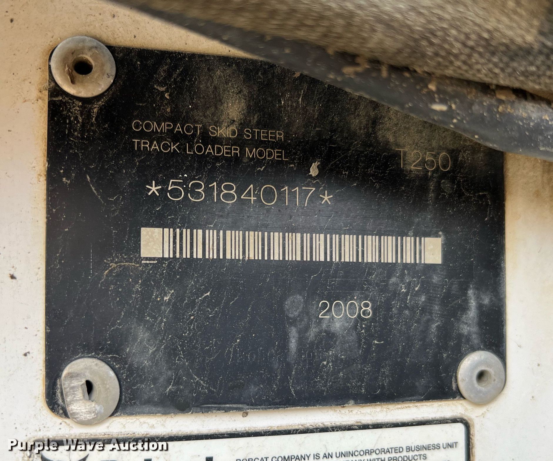 Purple Wave is selling a used Tracked Skid Steer Loader in Missouri. This item is a 2008 Bobcat T250 tracked skid steer loader with the following: Hours: 2,377 on meter, Serial: 531840117, Unit #: 1524