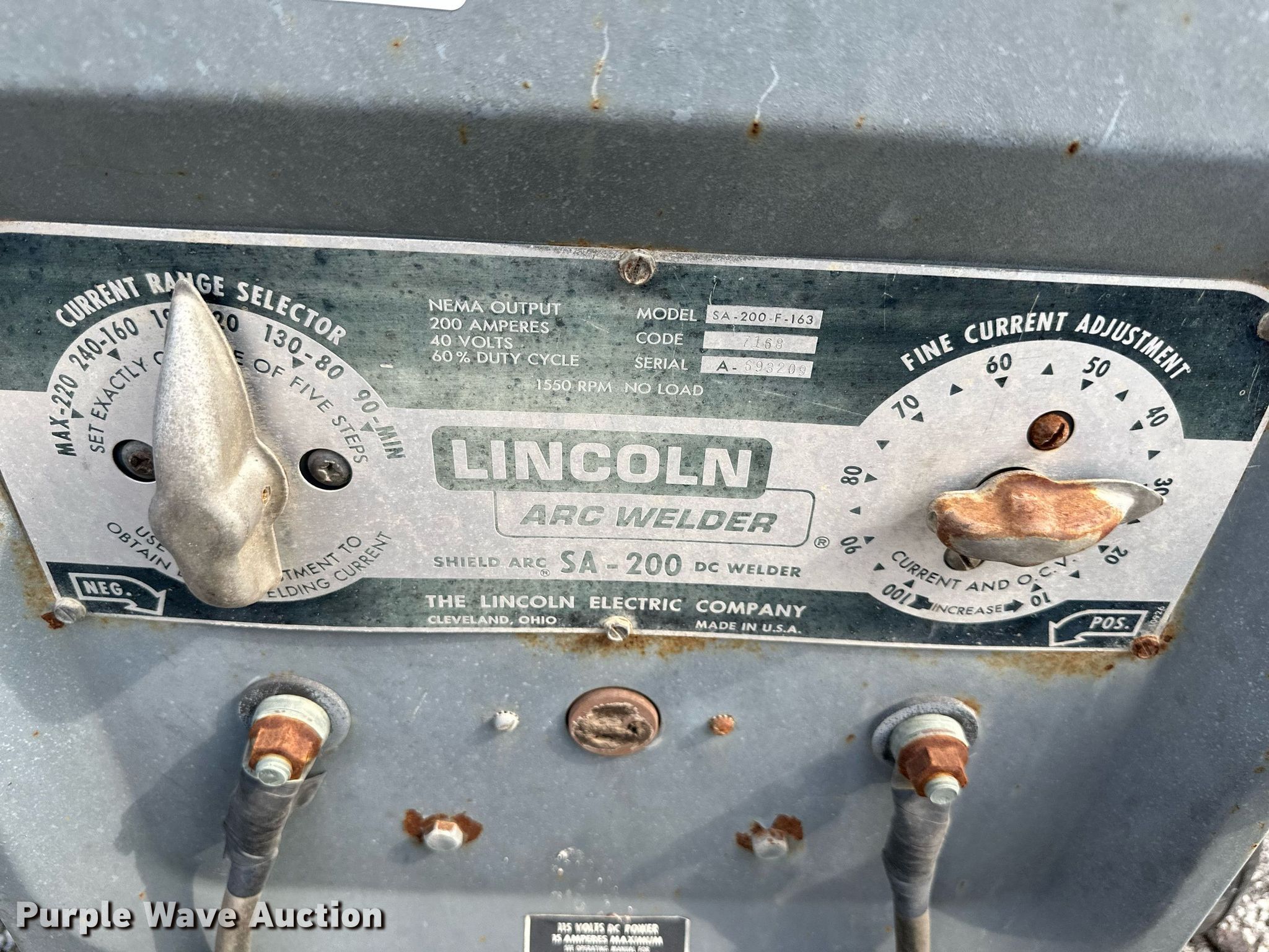 Lincoln SA-200 welder. Hours: 963 on meter, Serial: A-693209. Engine Cylinders: 4, Fuel type: Gas. Features Welder Capabilities: DC, Stick, Leads, Fuel tank, Trailer mounted. Trailer 8' L x 54" W, Axles: Single, Tire size: 165/65R15. Notes Unknown operating condition. Bonner Springs, KS 66012