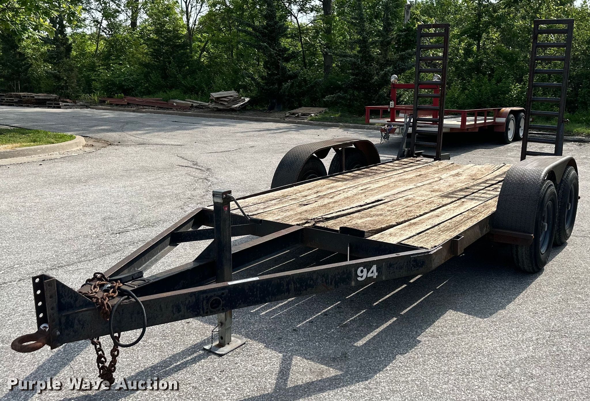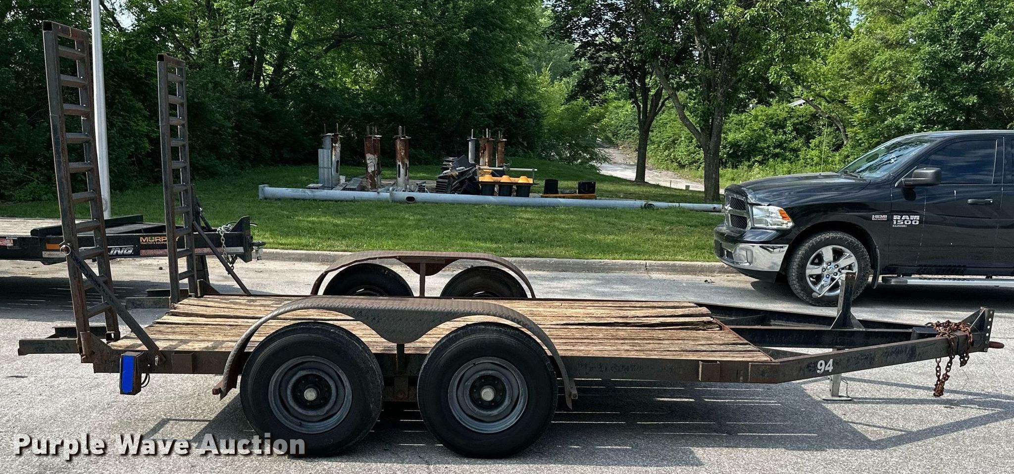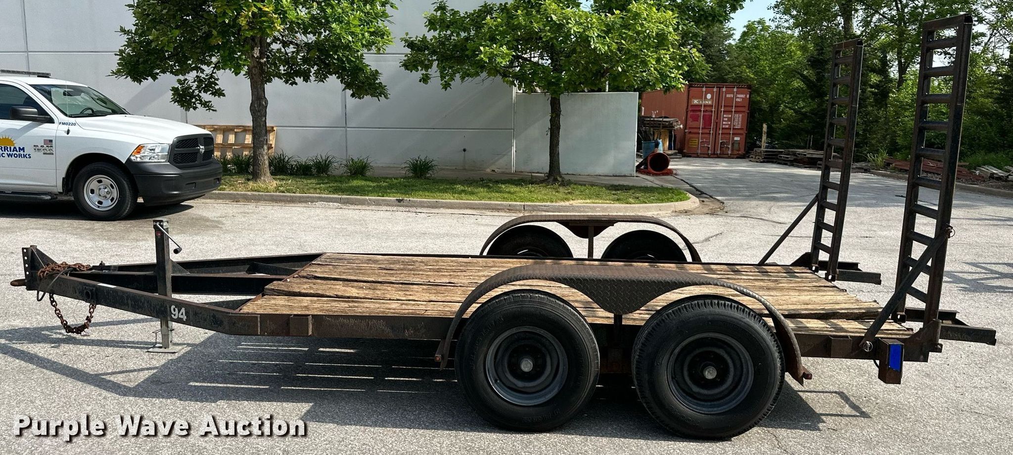 1986 JFW utility trailer. VIN: 10271. Dimensions Overall: 18' L x 102" W, Deck: 12' L x 83" W, Deck height: 20", Ramps: Manual Length: 65". Features Deck type: Wood. Chassis Landing gear: Single, Suspension: Spring, Brakes: Electric, Axles: Tandem. Tires Steel wheels, Size: 7.00-15. Kansas title. Title distribution may be delayed up to 14 days from verification of funds. City of Merriam. 6901 Knox Street. Merriam, KS 66203