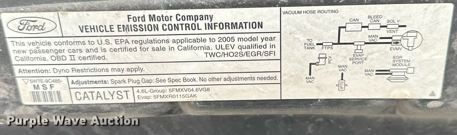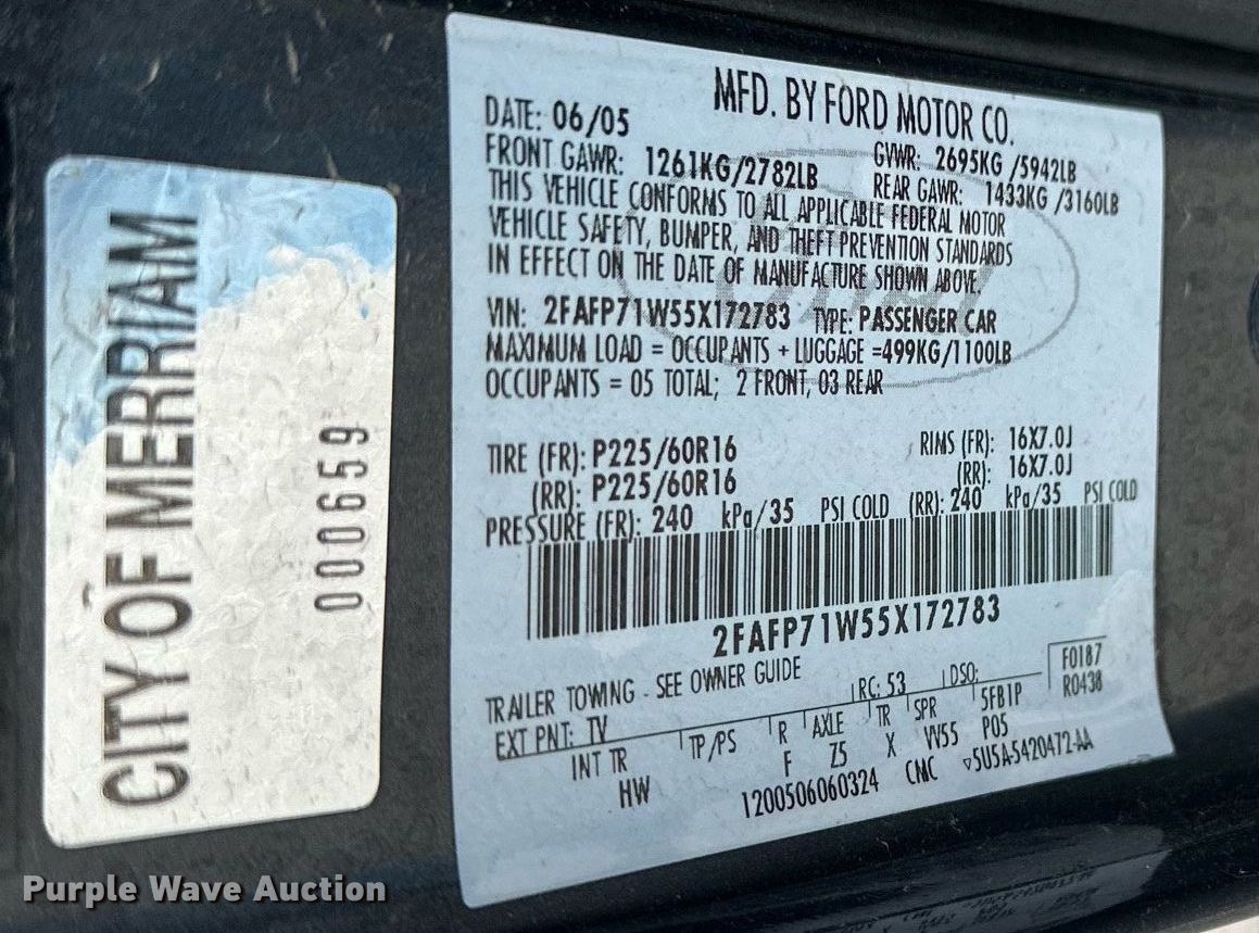 2005 Ford Crown Victoria Police Interceptor. Miles: 90,686 on odometer, VIN: 2FAFP71W55X172783. Engine Displacement: 4.6L V8 SOHC, Cylinders: 8, Fuel type: Gas. Transmission Automatic. Interior AC, Heat, Power windows, Power locks, Cruise control. Tires Size: 225/60R16. Notes Dead battery. Kansas title. Title distribution may be delayed up to 14 days from verification of funds. City of Merriam. 6901 Knox Street. Merriam, KS 66203