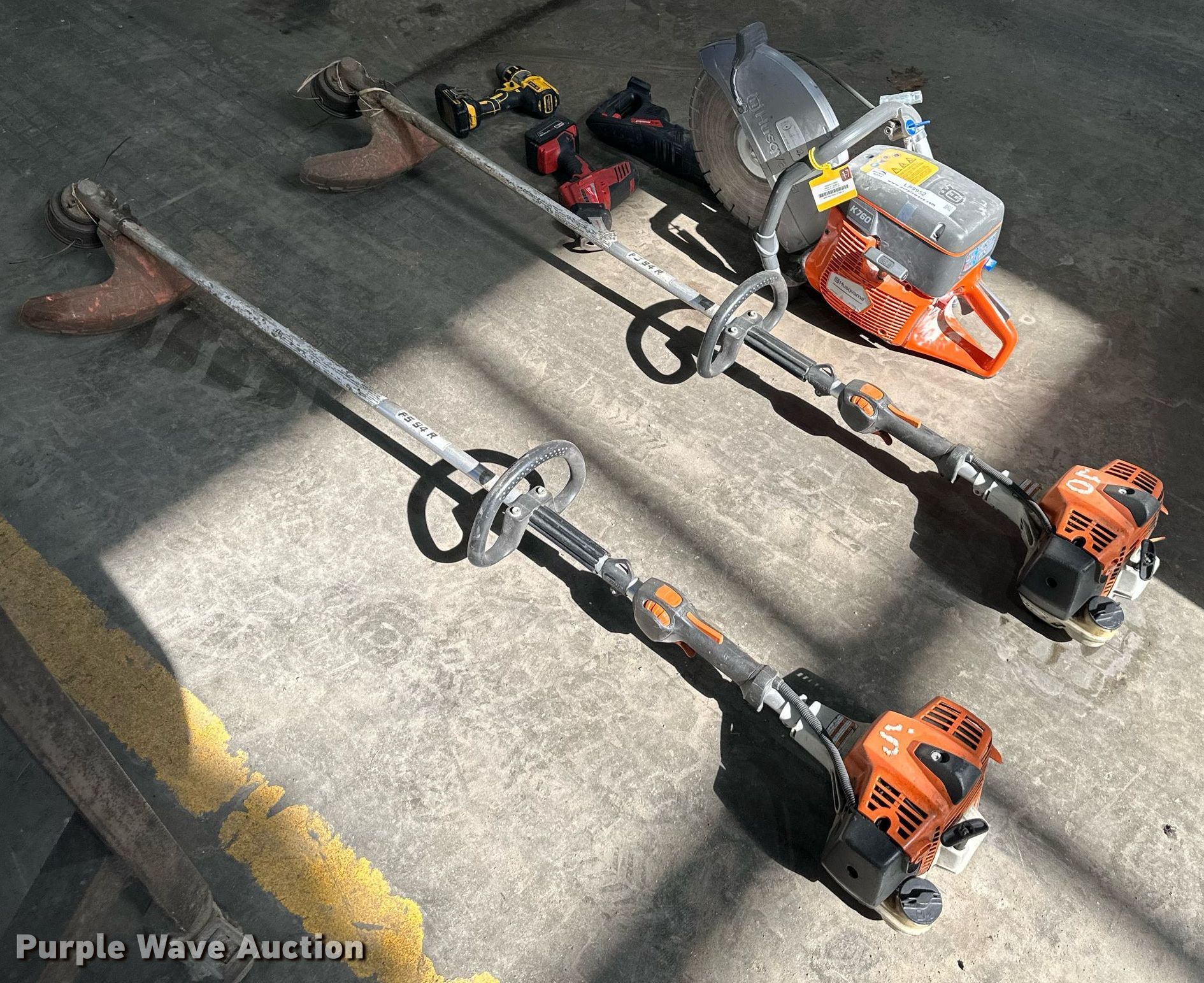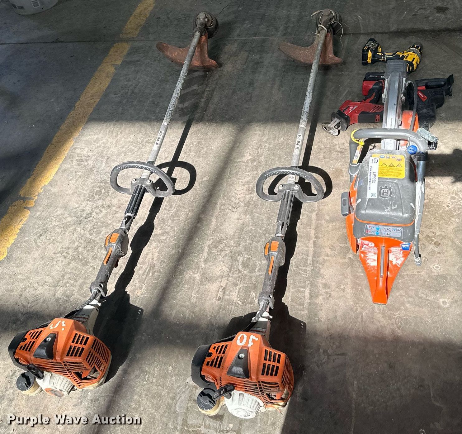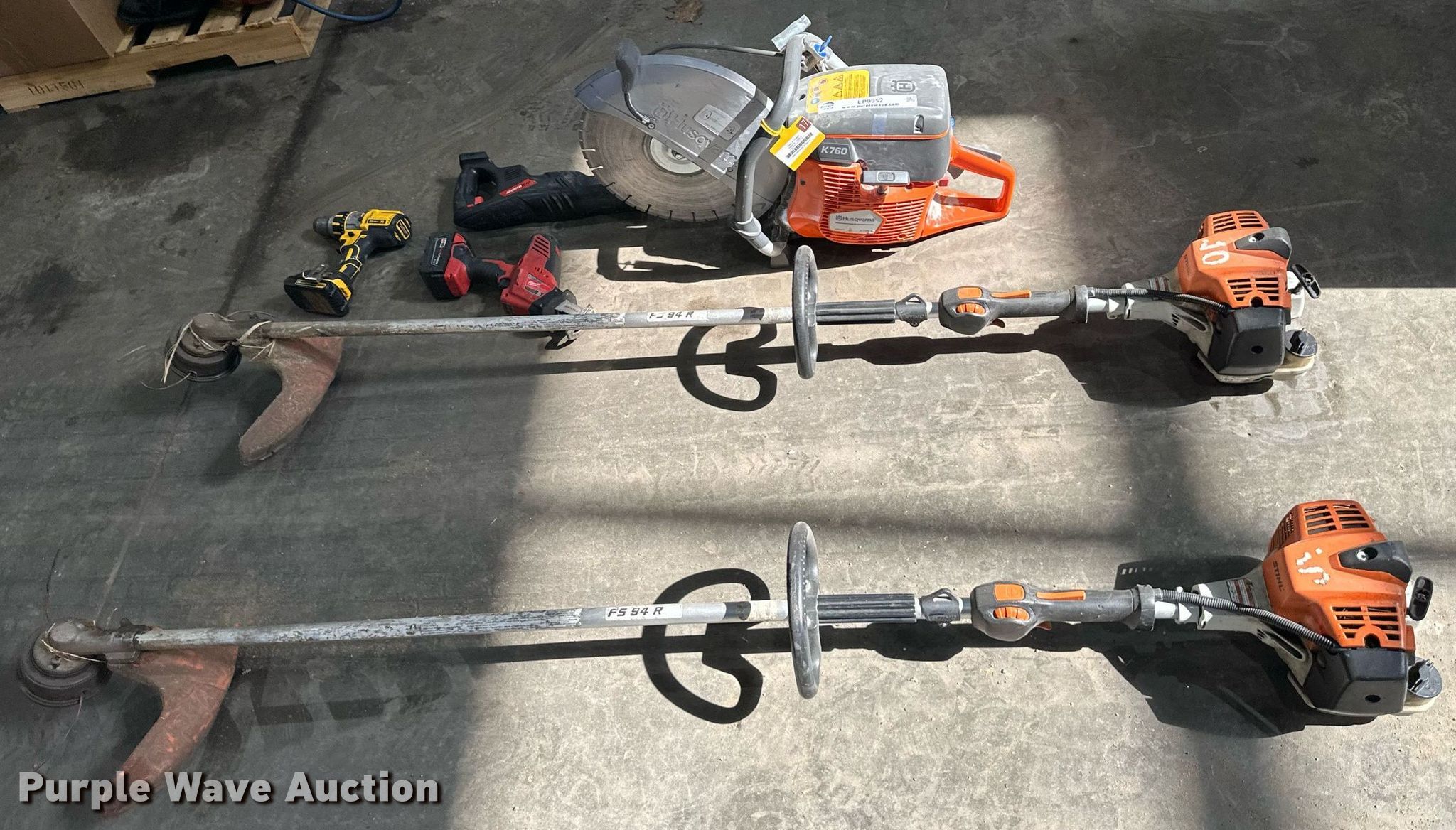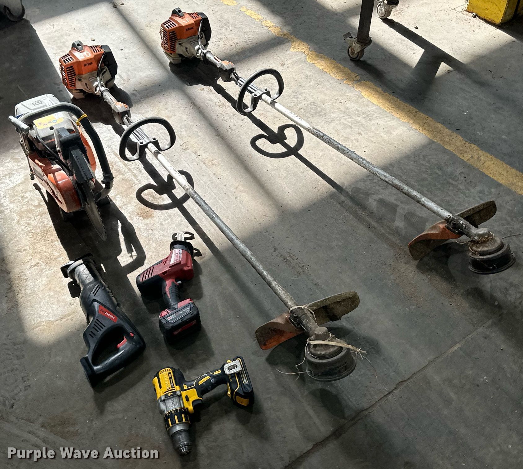 Purple Wave is selling a used Tools in Kansas. This item is a Tools with the following: (2) Stihl weed trimmers, Chop saw, (2) Sawzalls, Drill