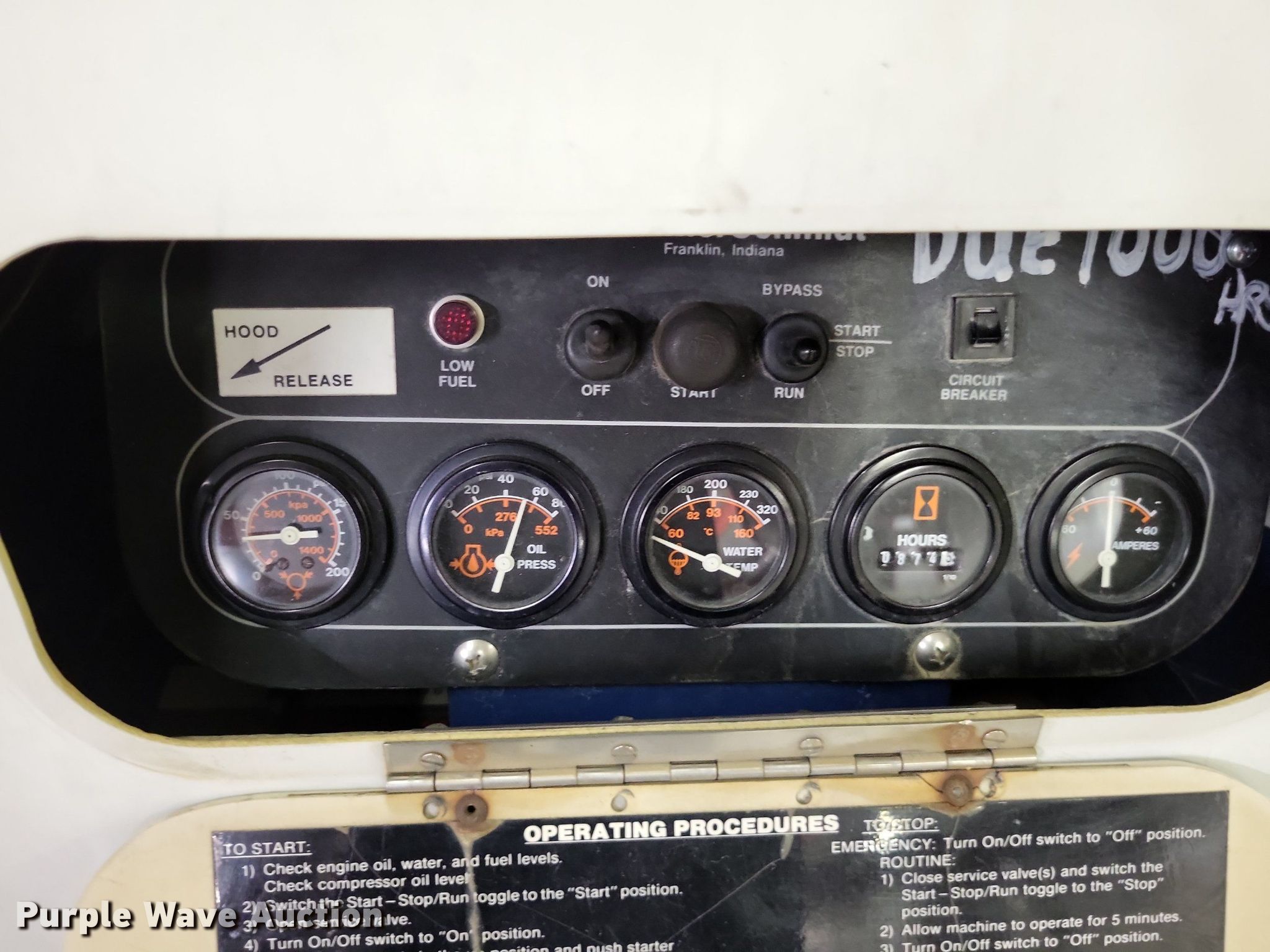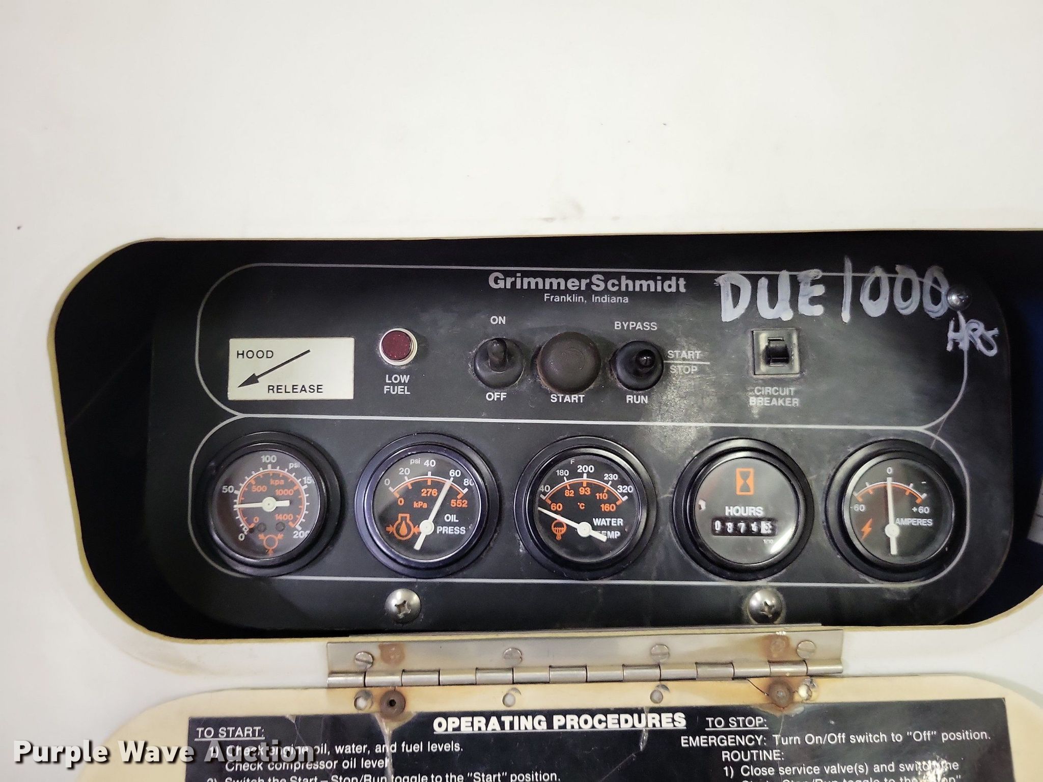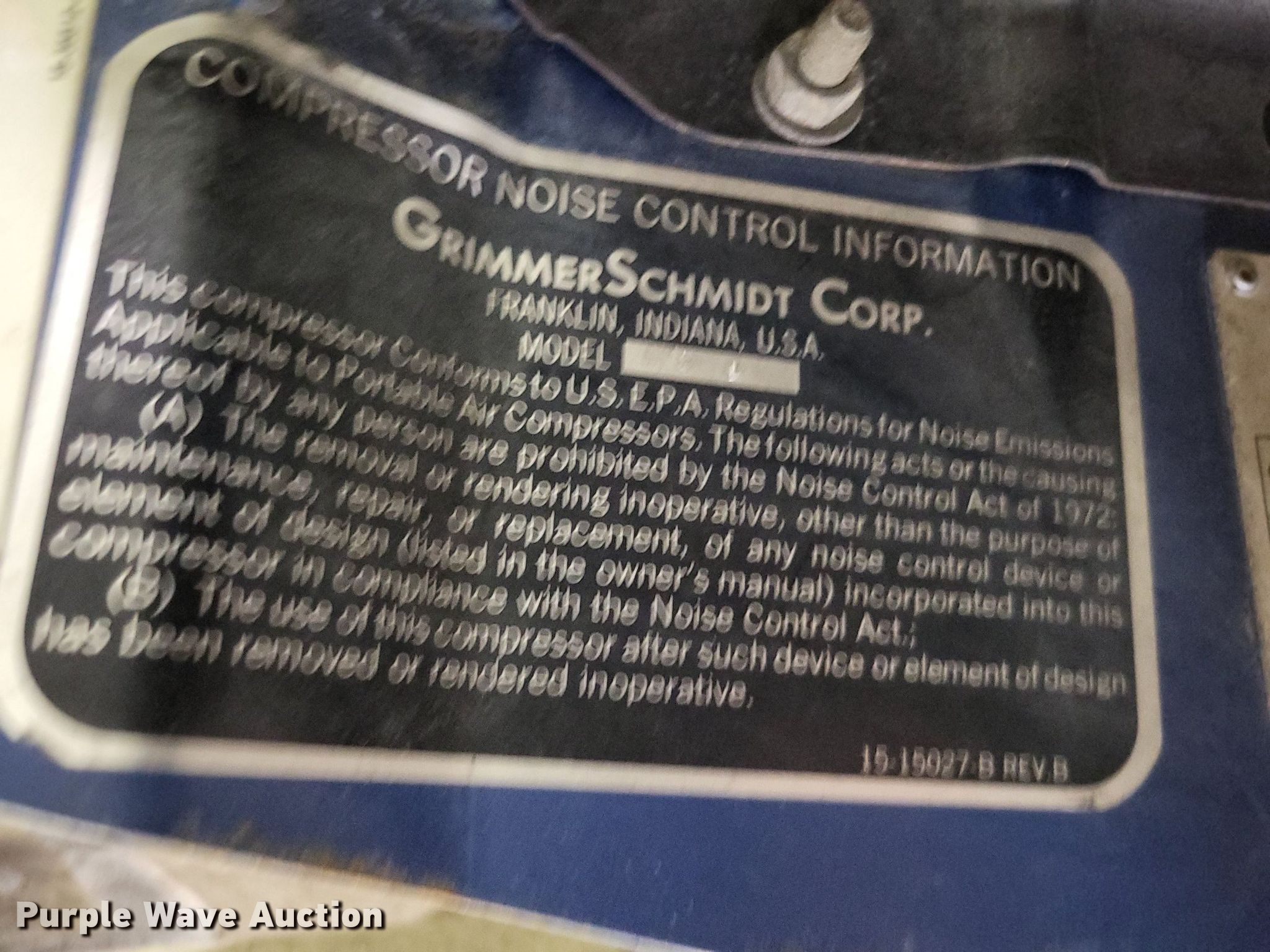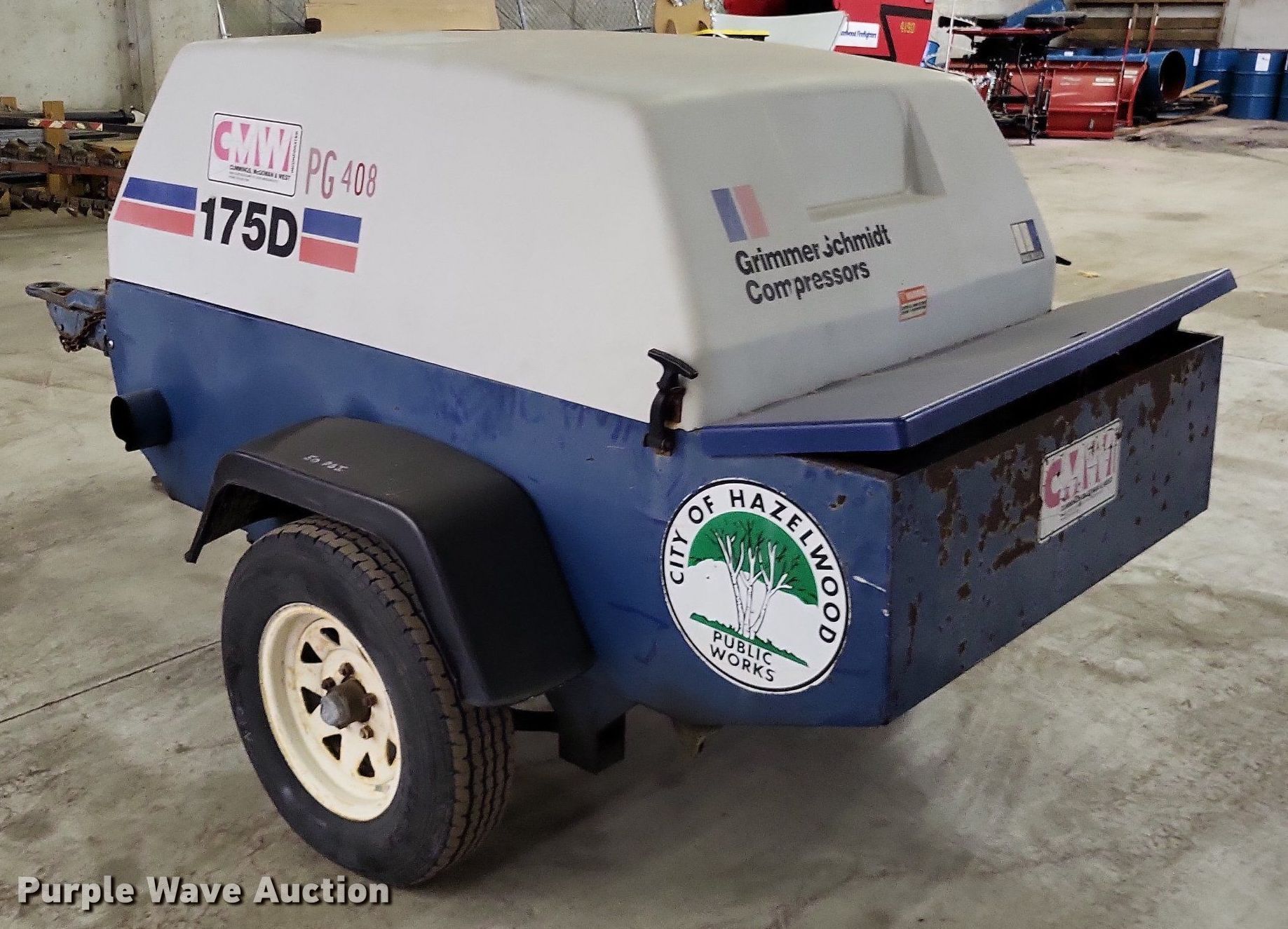 Purple Wave is selling a used Air Compressor in Missouri. This item is a Grimmer Schmidt 175D air compressor with the following: Hours: 875 on meter, Serial: 16657, Unit #: PG408